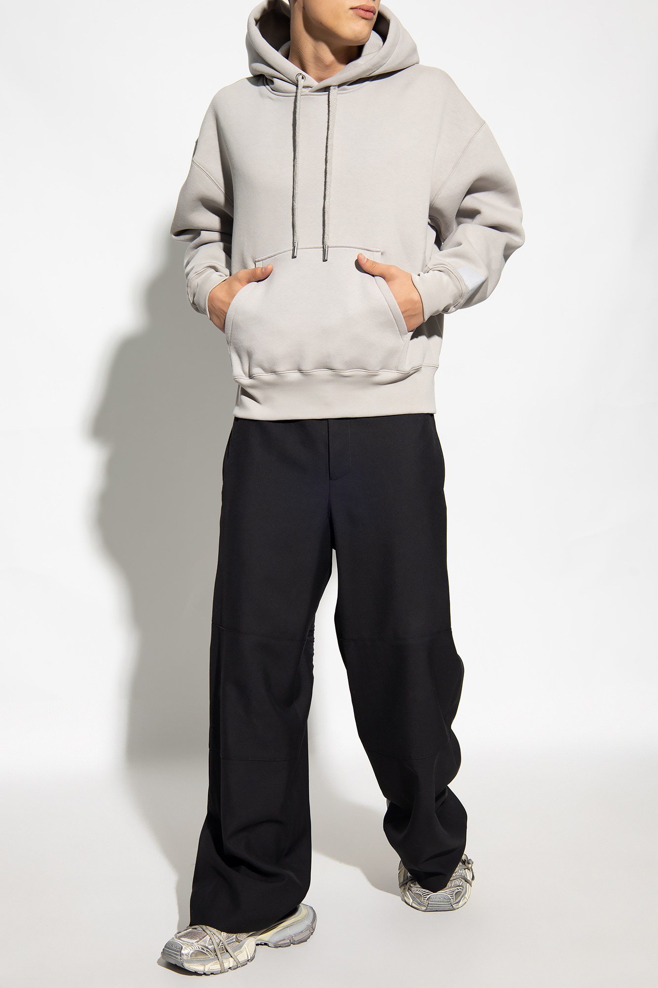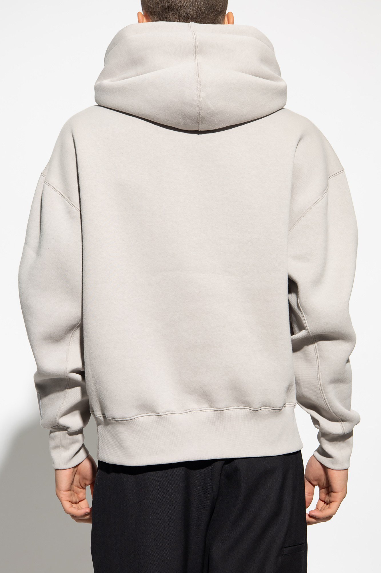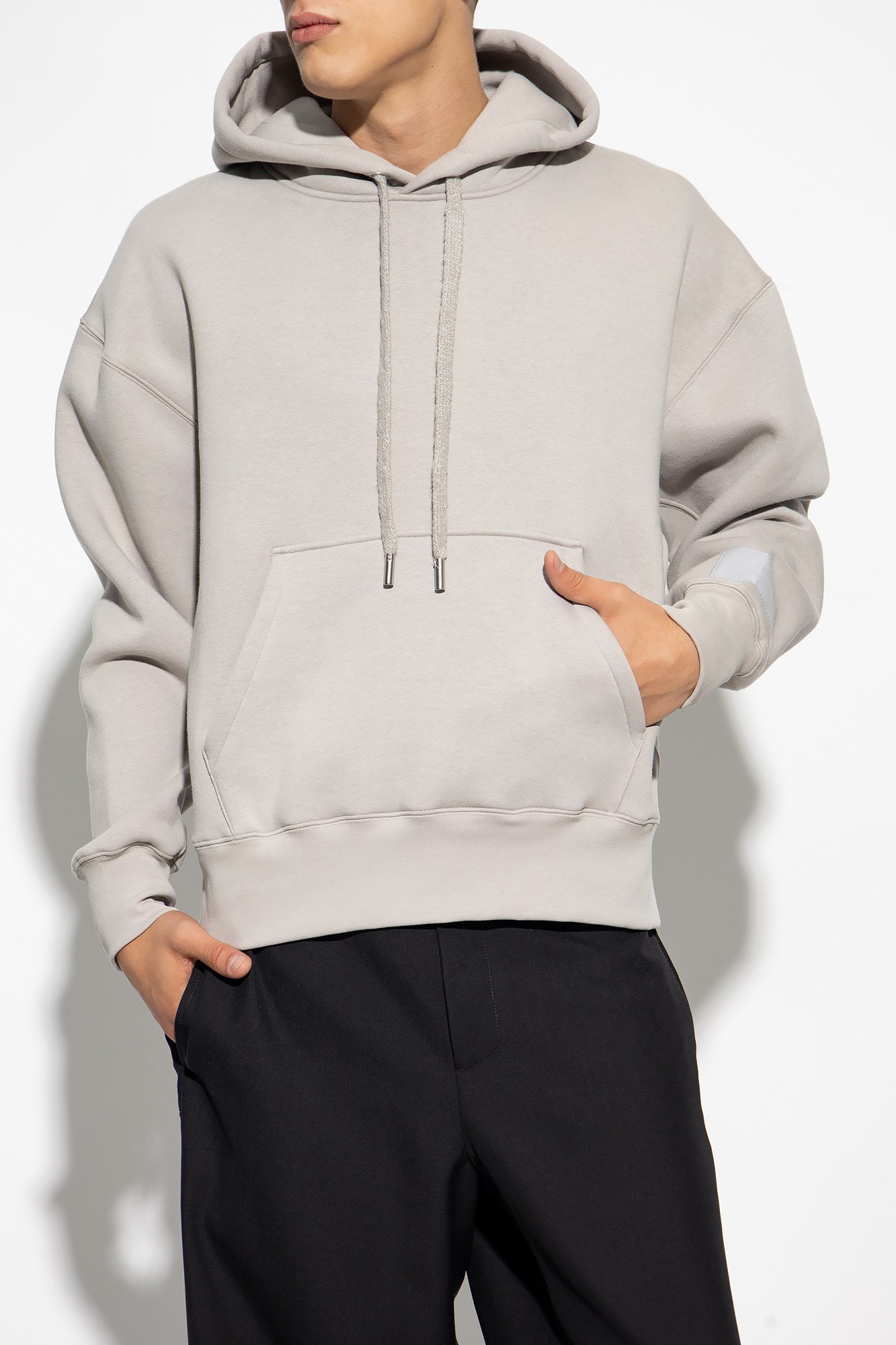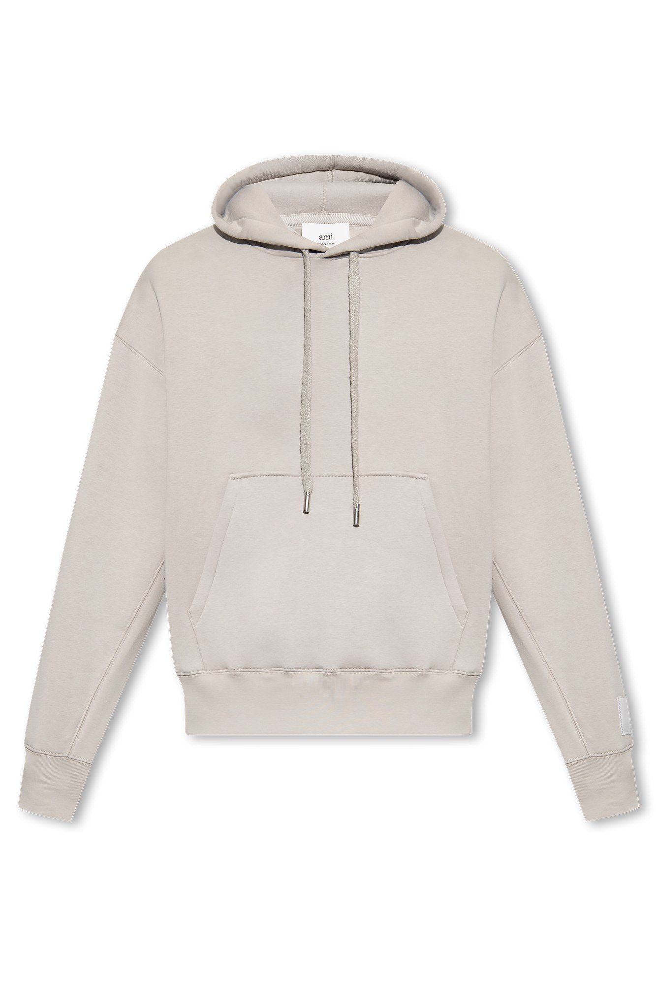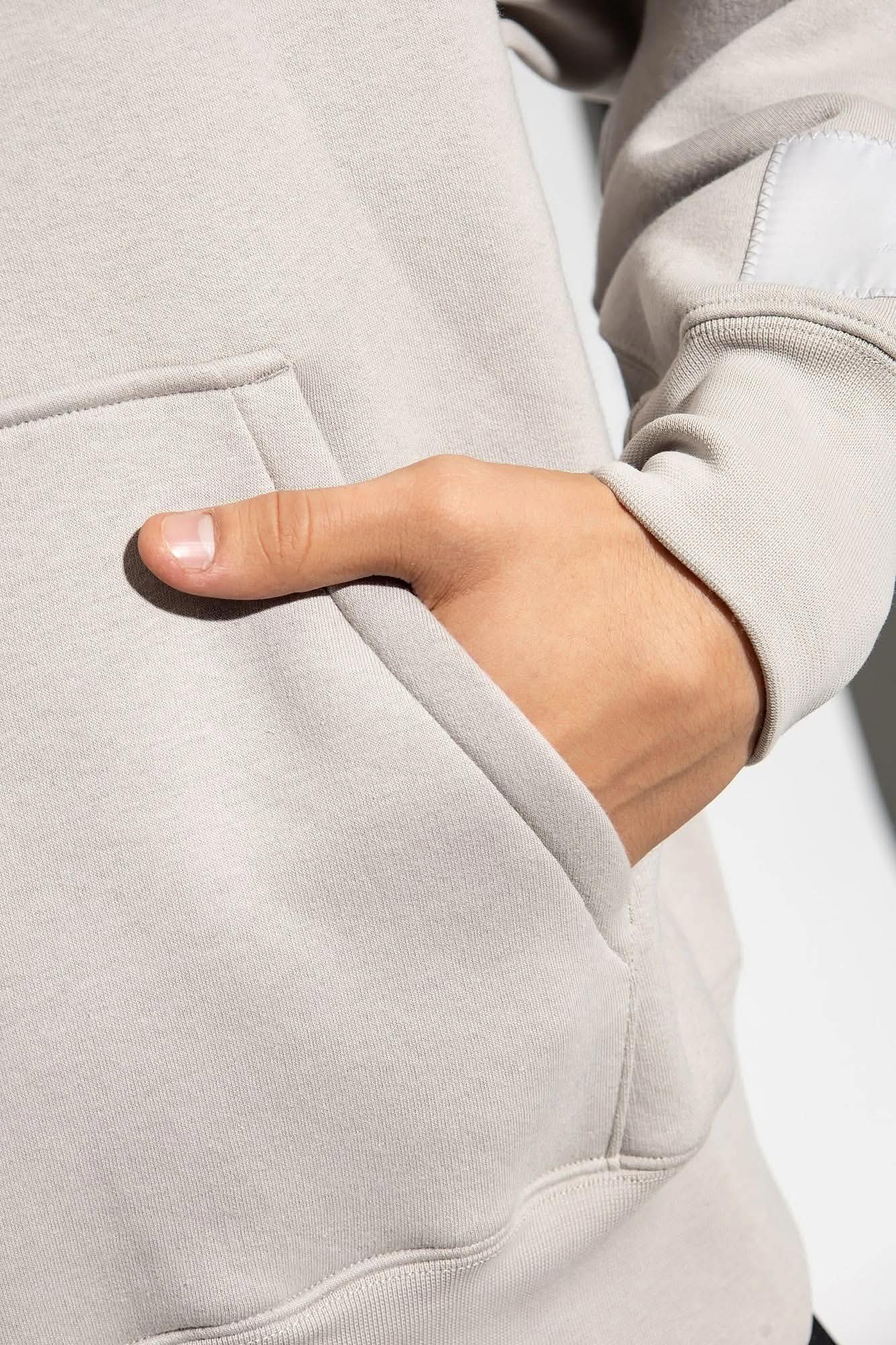 Описание: Серый свитшот от Ami Alexandre Mattiussi. Изготовлен из органического хлопка и переработанных материалов. Капюшон на завязках. Нашивки с логотипом на рукаве. Накладной карман спереди. Длинные рукава и низ отделаны манжетом.
