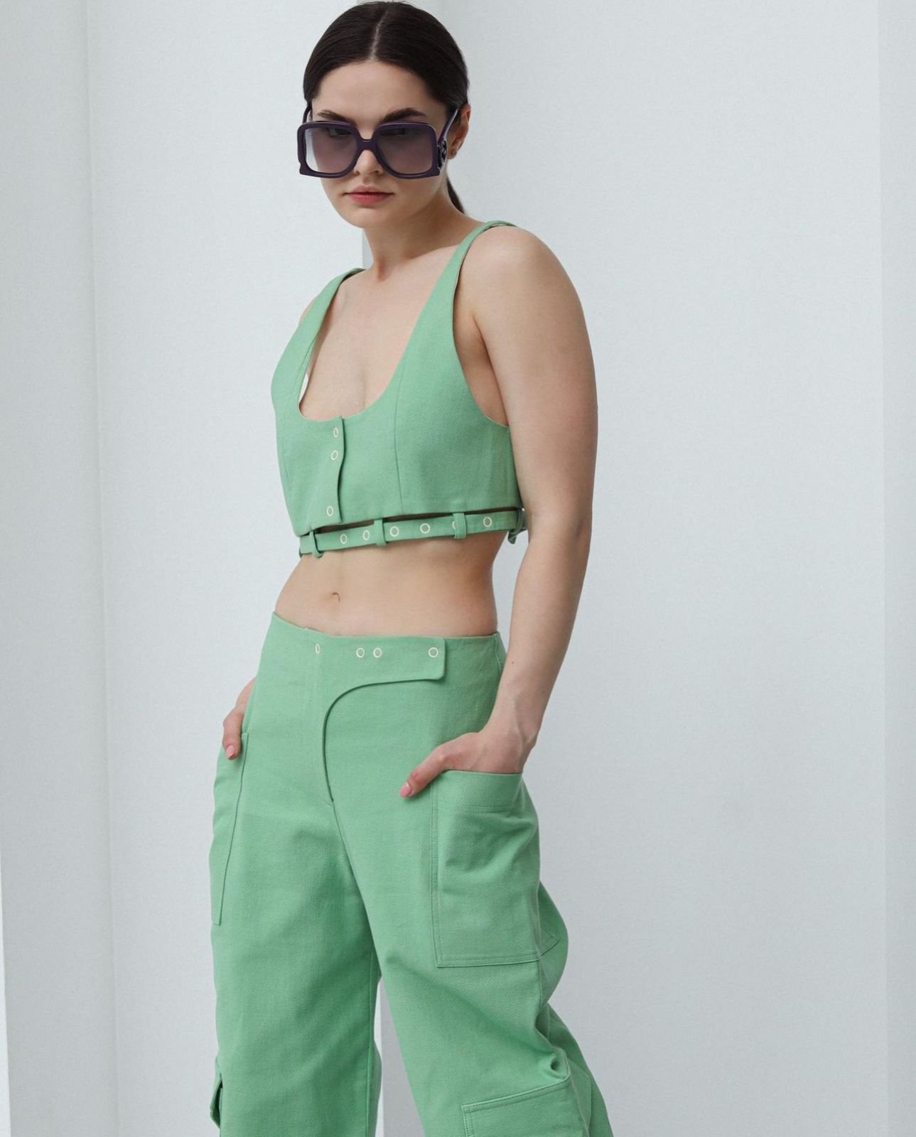 Костюм из органического хлопка. Топ на застежки и пояс. Брюки свободного кроя, застежка на кнопки.