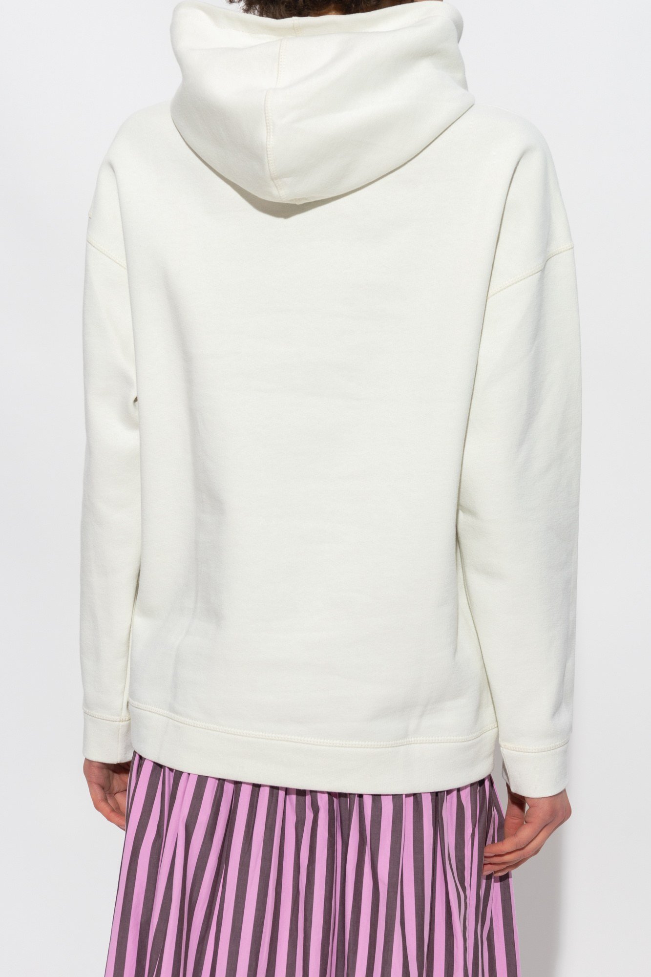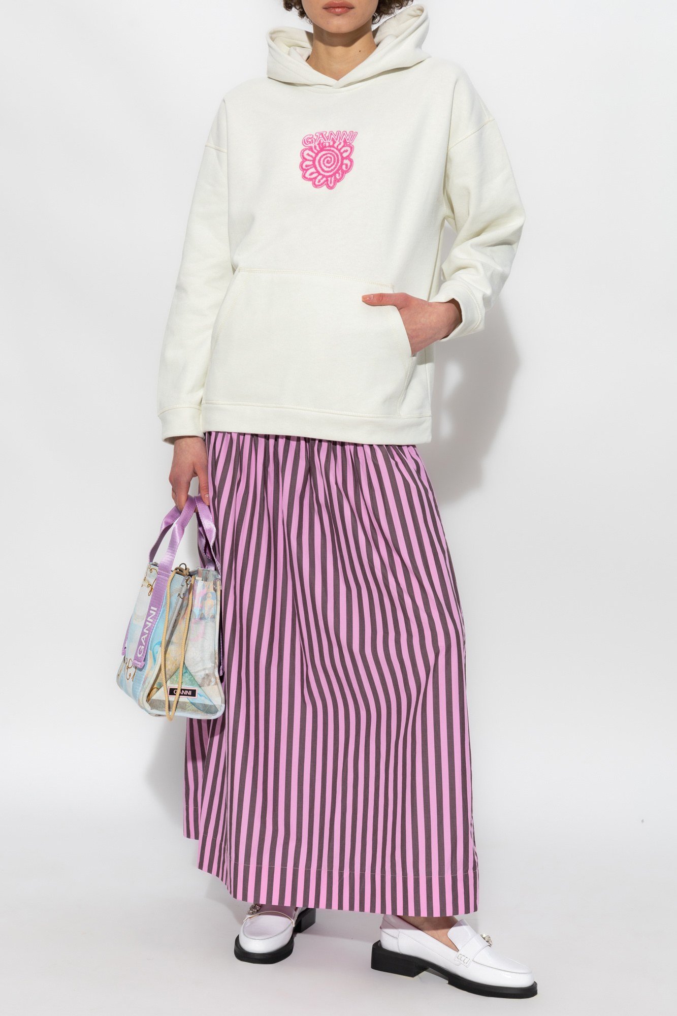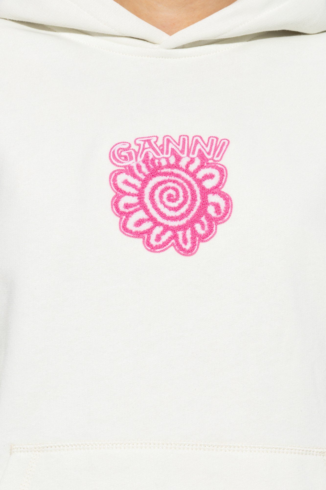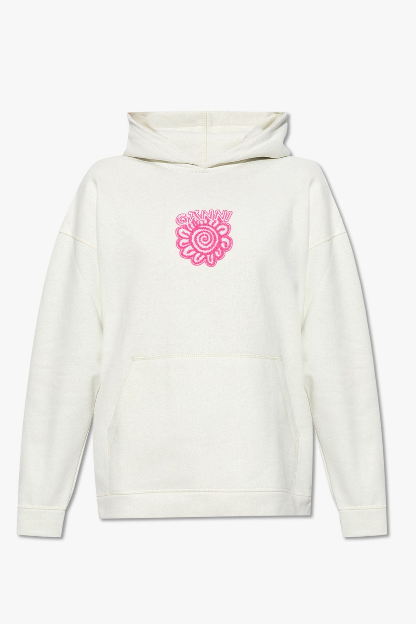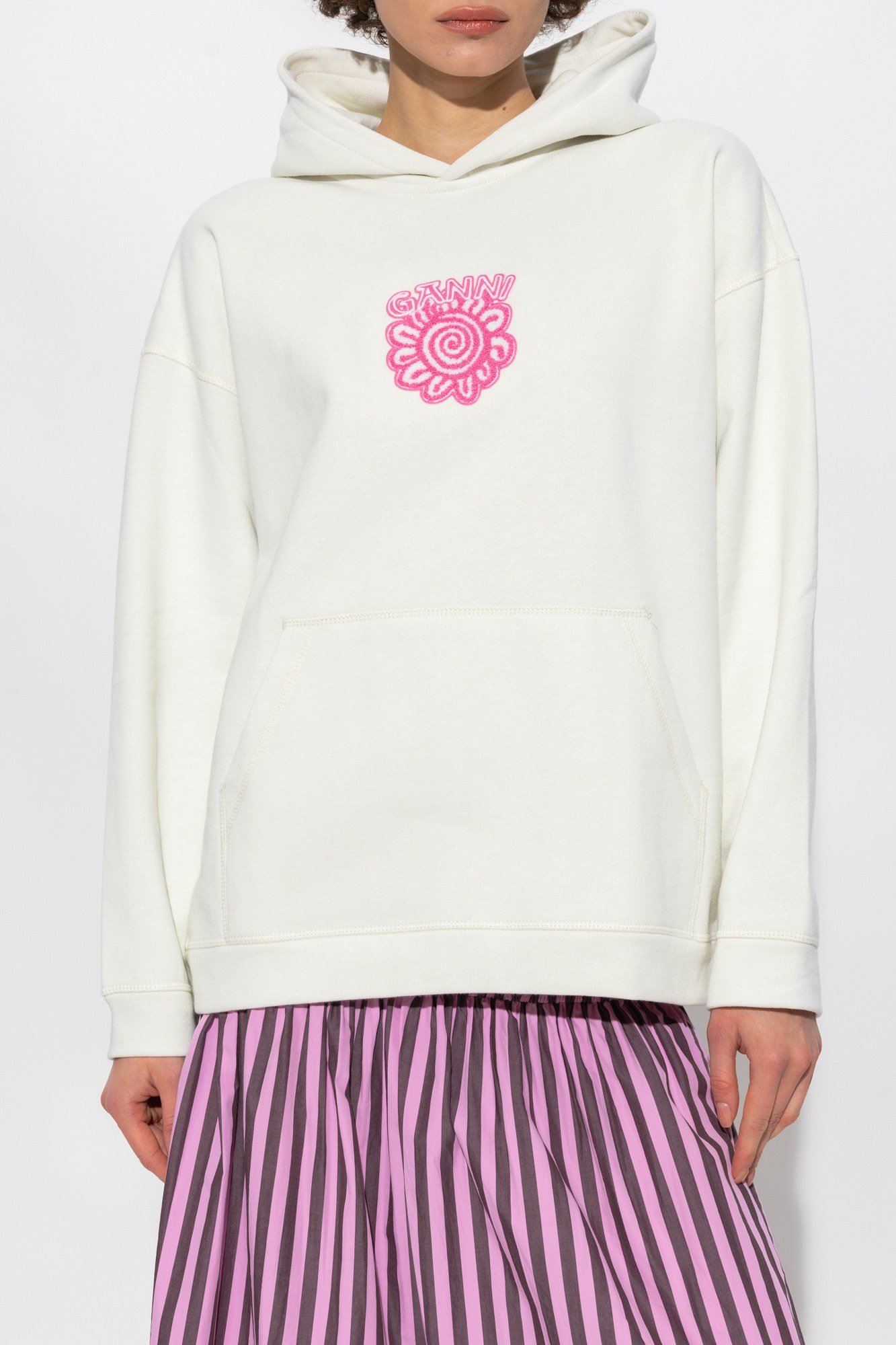 Описание: Белый тощий от Ganni. Изготовленный из органического хлопка, этот стиль имеет розовую нашивку с логотипом бренда и цветочным мотивом спереди, карман «кенгуру», длинные рукава и рубчик по краям.