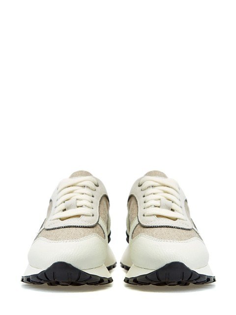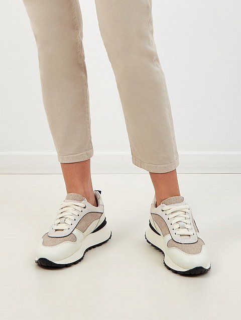 Описание: Женские кроссовки Doucal's. Модель молочного цвета. Бежевые шерстяные вставки. Шнуровка. Логотип Симферополь. Мех внутри.