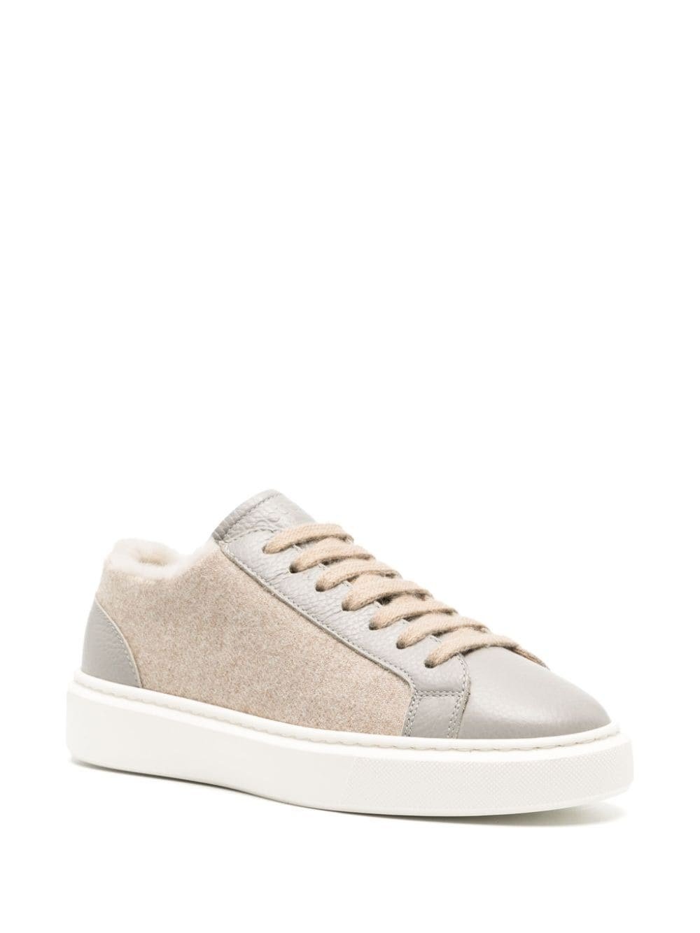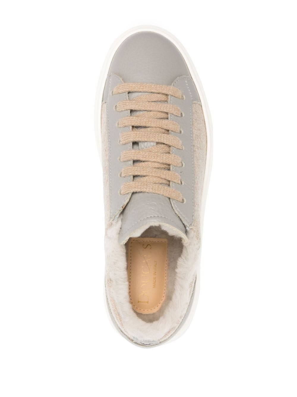 Цвет бежевый/светло-серый. Материалы телячья кожа/мериносовая шерсть. Дизайн в виде цветовых блоков. Застежка на шнуровке спереди. Круглый носок. Брендированная стелька. Плоская резиновая подошва. Подкладка из искусственного меха.