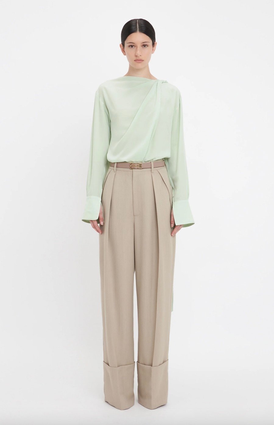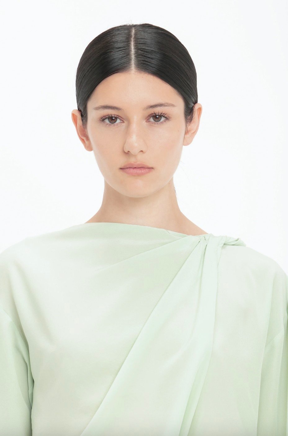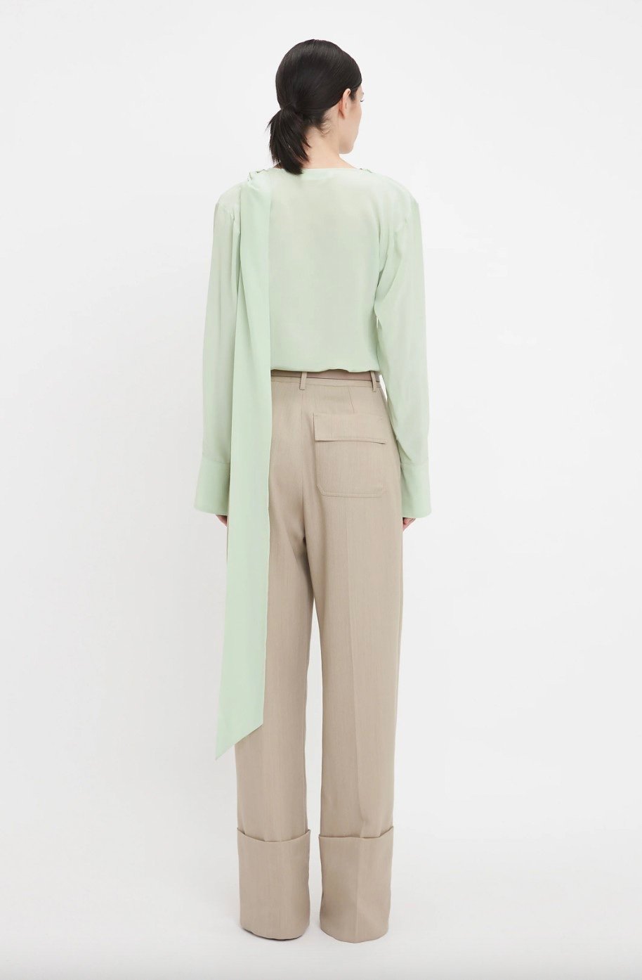 Сдержанно элегантный, Twist Detail Scarf Top характеризуется шарфом, элегантно спадающим от линии плеч. Изготовлен из 100% шелка, драпированный вырез с закрученными деталями и глубокие манжеты с застежкой на пуговицах и руле для роскошного завершения. Представленный в приглушенном оттенке нефрита, это изящный предмет для ежедневного ношения.