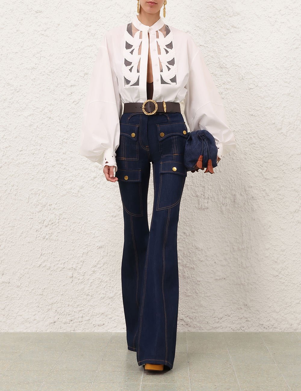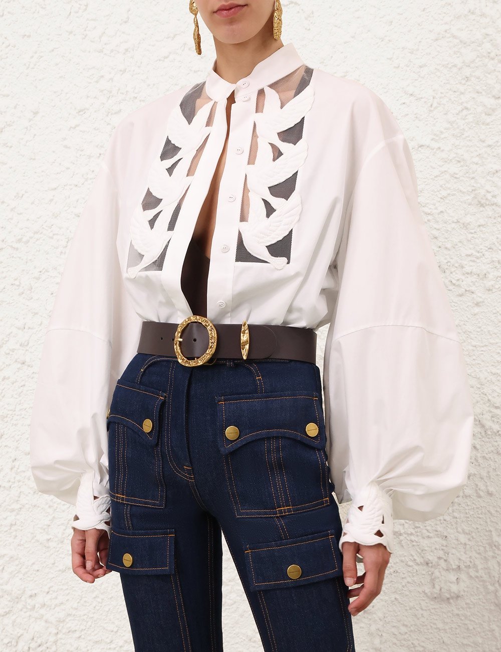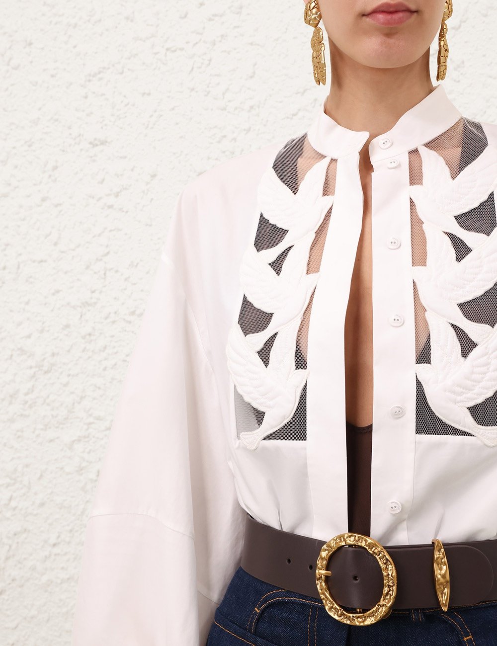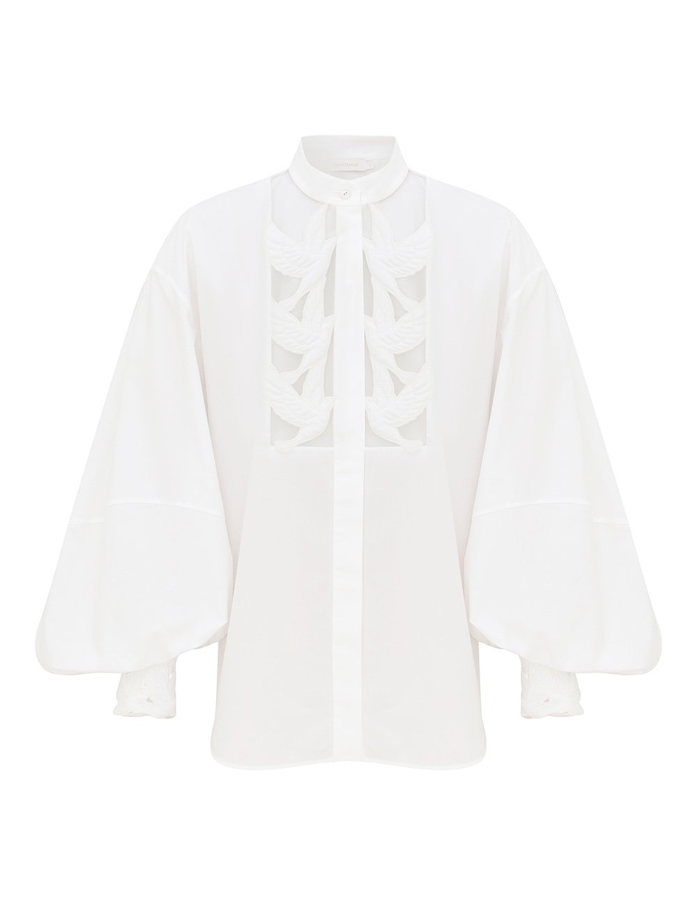 Блузка Luna с аппликацией цвета слоновой кости из коллекции весна 2026 года, Kindred Spirit. Хлопковая блузка со стойкой на воротнике, длинными рукавами-блузками, скрытыми пуговицами посередине спереди и обильно вышитыми вырезами на груди и манжетах. длине