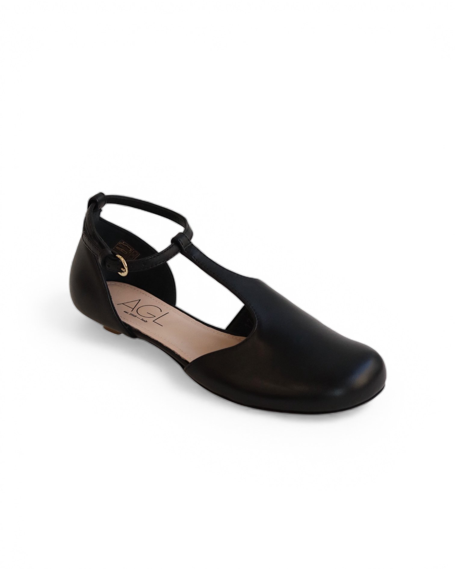 Abe – это балетки с Т-образным креплением и регулируемым ремешком, элегантно огибающим лодыжку. Широкий, объемный носок сочетается с блестящим, очень женственным микрокаблуком высотой 1 см.