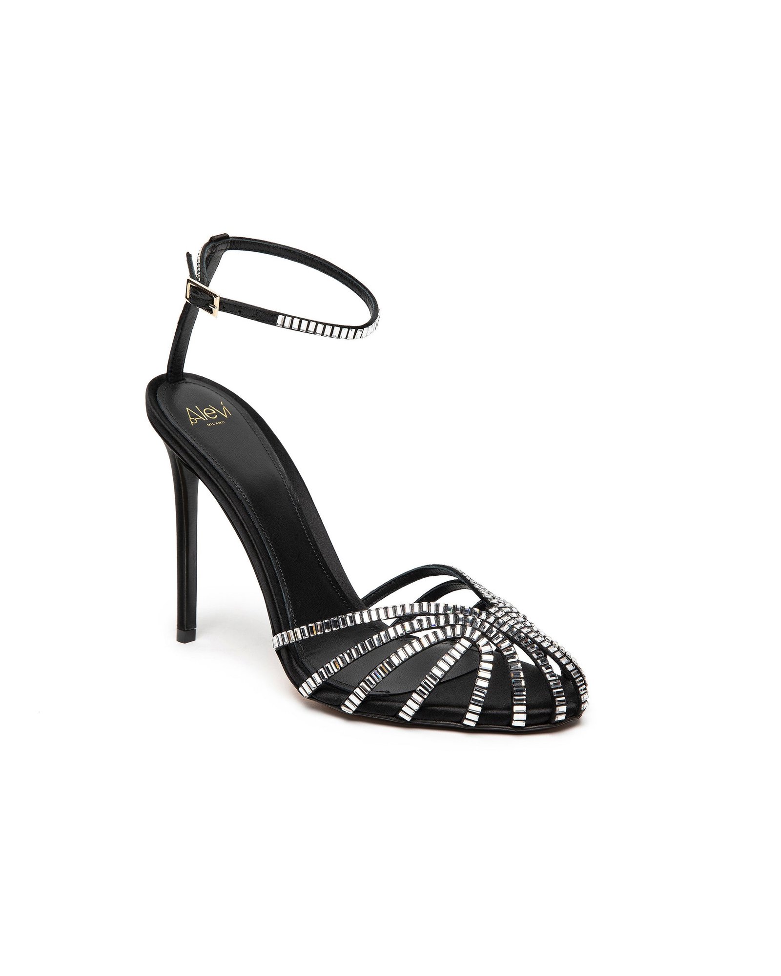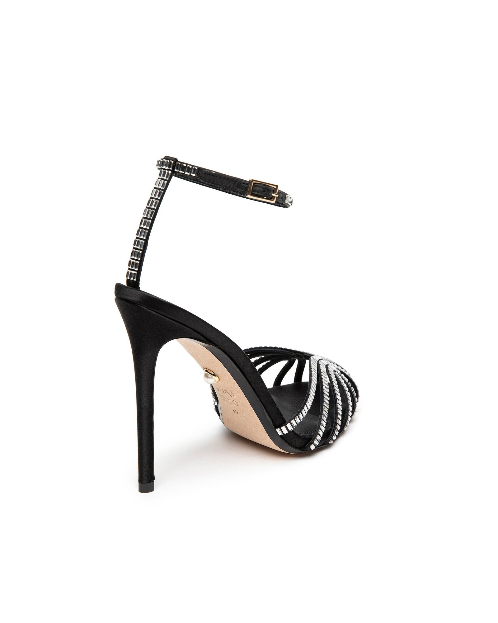 Атласные босоножки покрыты кристаллами.