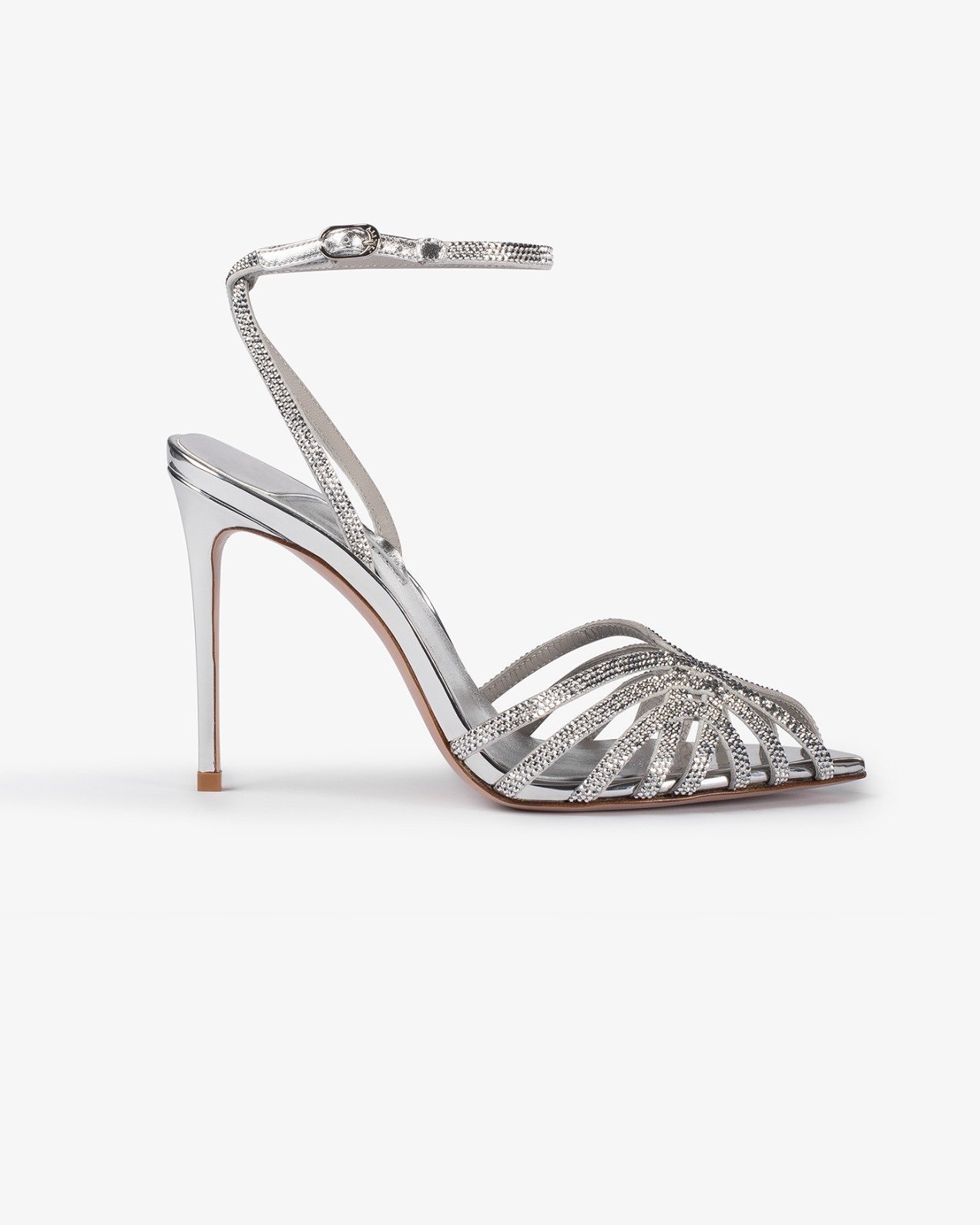 Переплетенные ремешки, украшенные каскадом блестящих кристаллов, излучают непревзойденную роскошь. 110-миллиметровый каблук-шпилька изящно удлиняет силуэт, а регулируемый ремешок на лодыжке обеспечивает безупречную посадку.