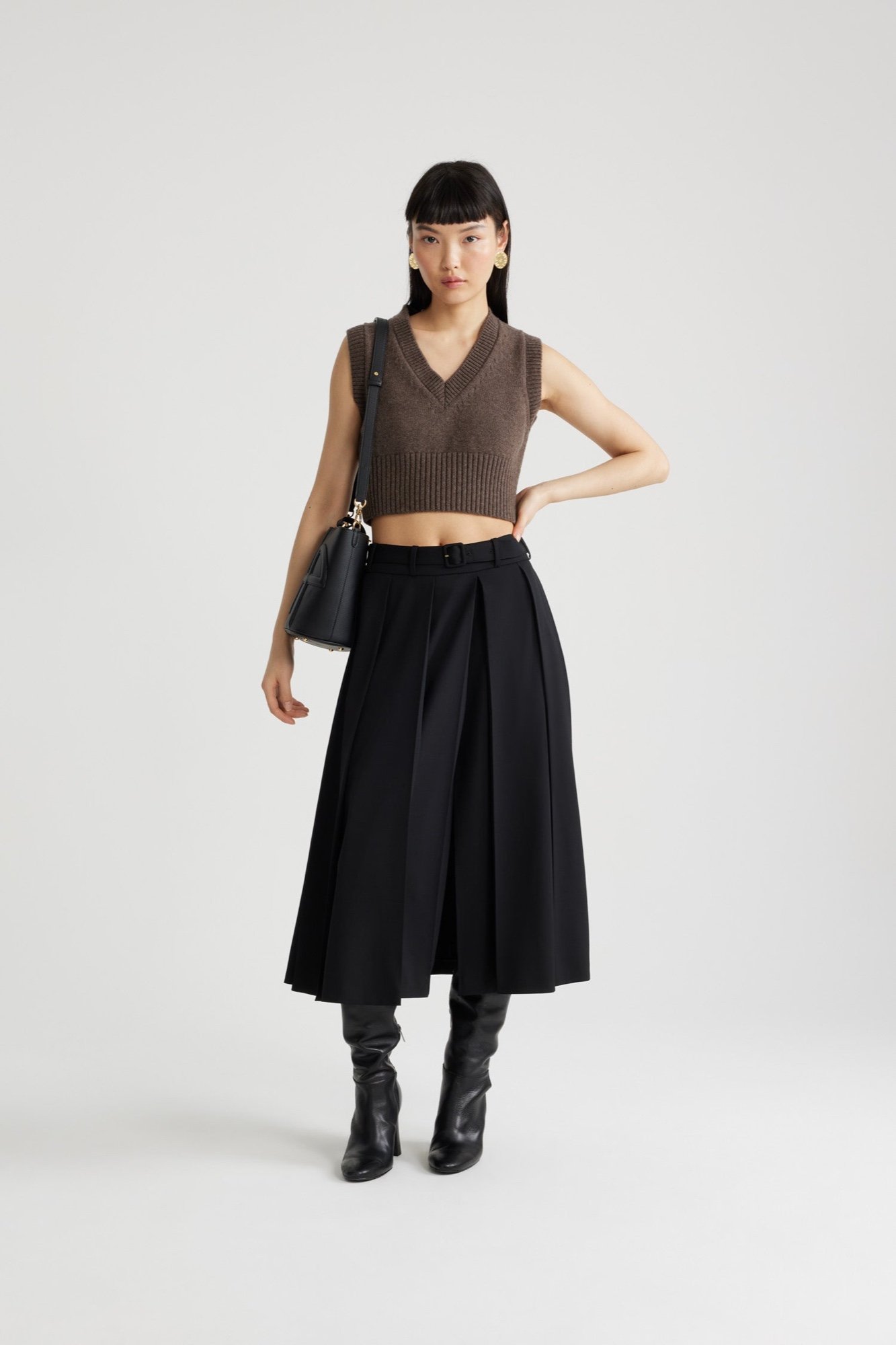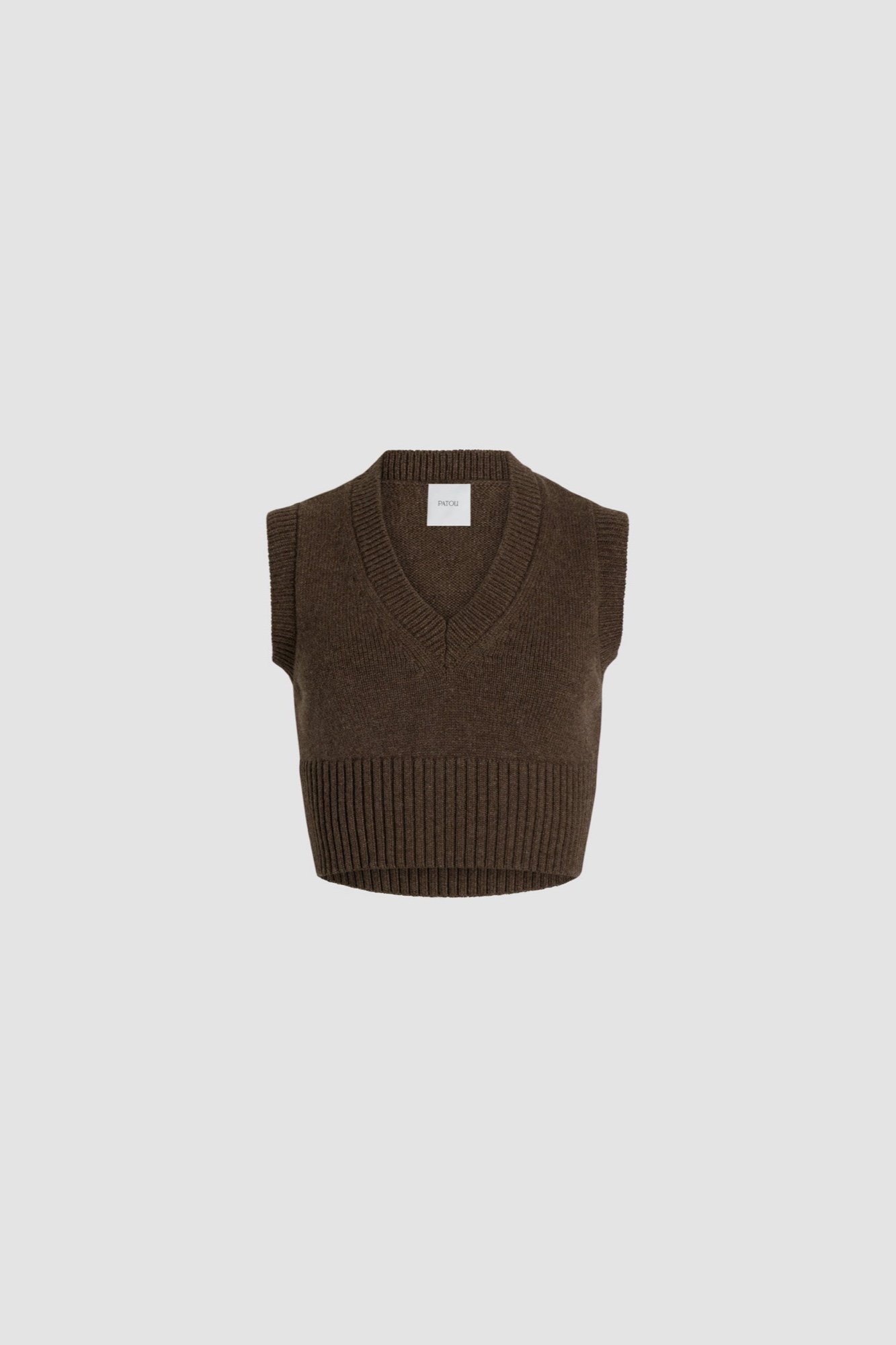 Экологически чистый джемпер из шерсти и кашемира. Стриженная длина. V горловина. Воротник, манжеты и низ в рубчик. Без рукавов.