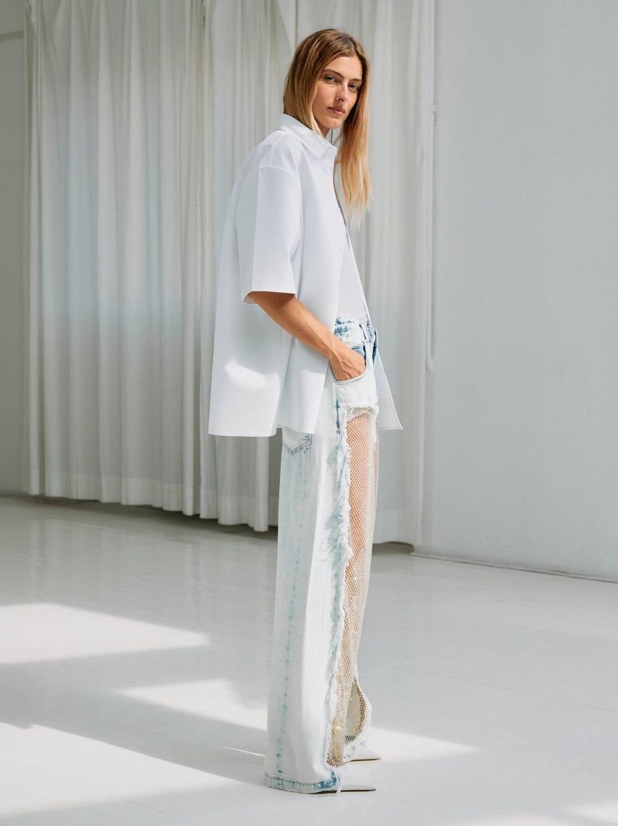 Джинсы с 5 карманами и кристаллическими украшениями на передней панели с рваными деталями и расслабленным силуэтом.