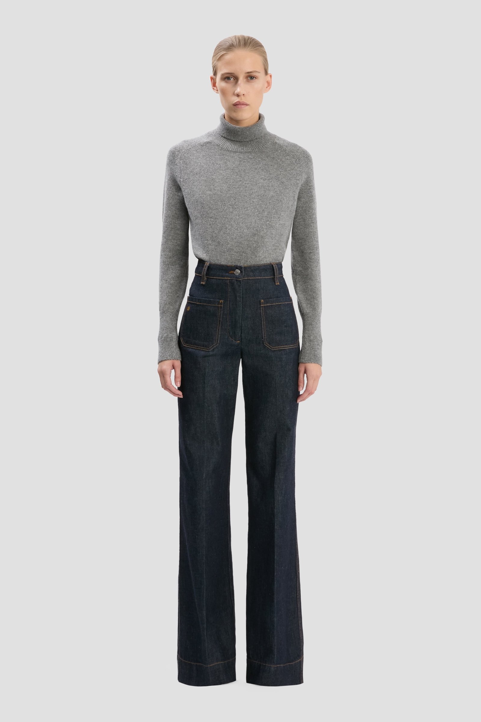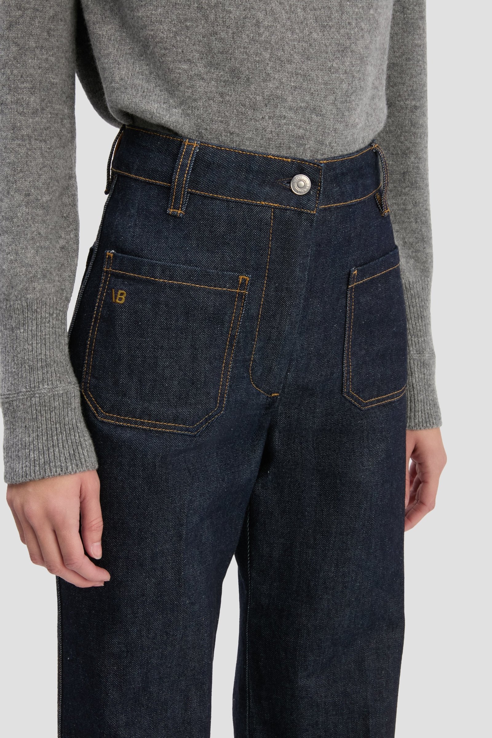 Изготовленные из эластичного денима, фирменные джинсы Alina представлены в средне-голубом цвете для непринужденной изысканности. Высокая талия и широкие штанины намекают на классический силуэт 1970-х годов, а традиционные накладные карманы, кожаная нашивка и вышитый логотип Виктории Бекхэм придают изысканность.