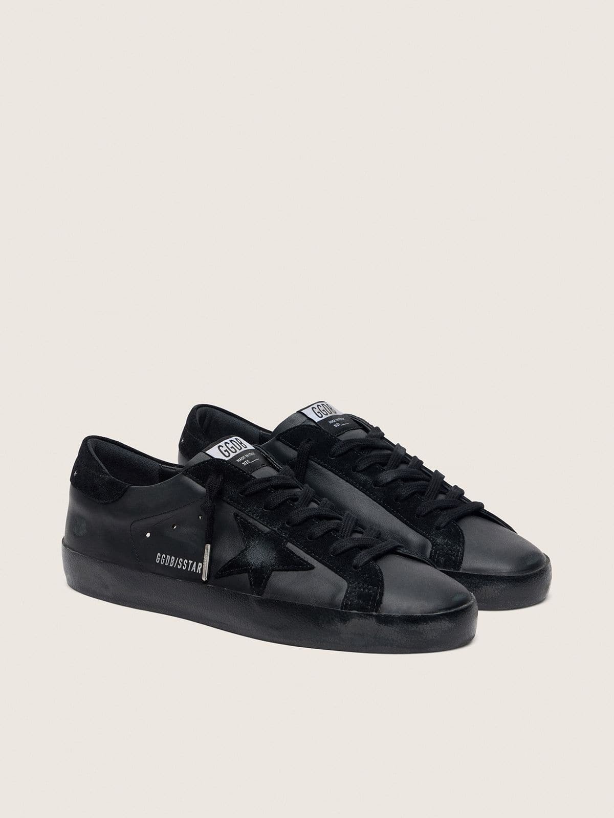 Мужская версия этих кроссовок Super-Star имеет черную замшевую звезду и вкладку на пятке на черном верху из кожи наппа. А черные шнурки добавляют завершающий штрих.