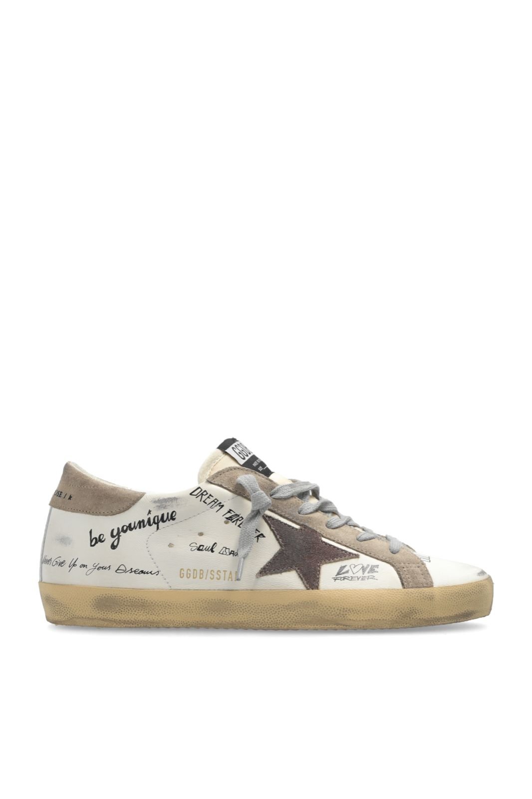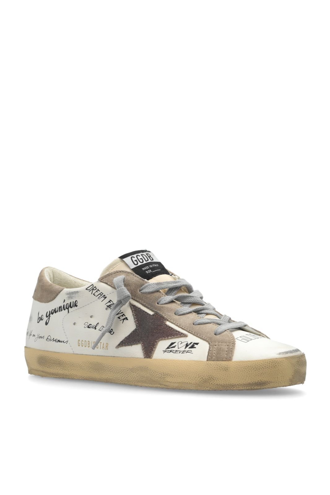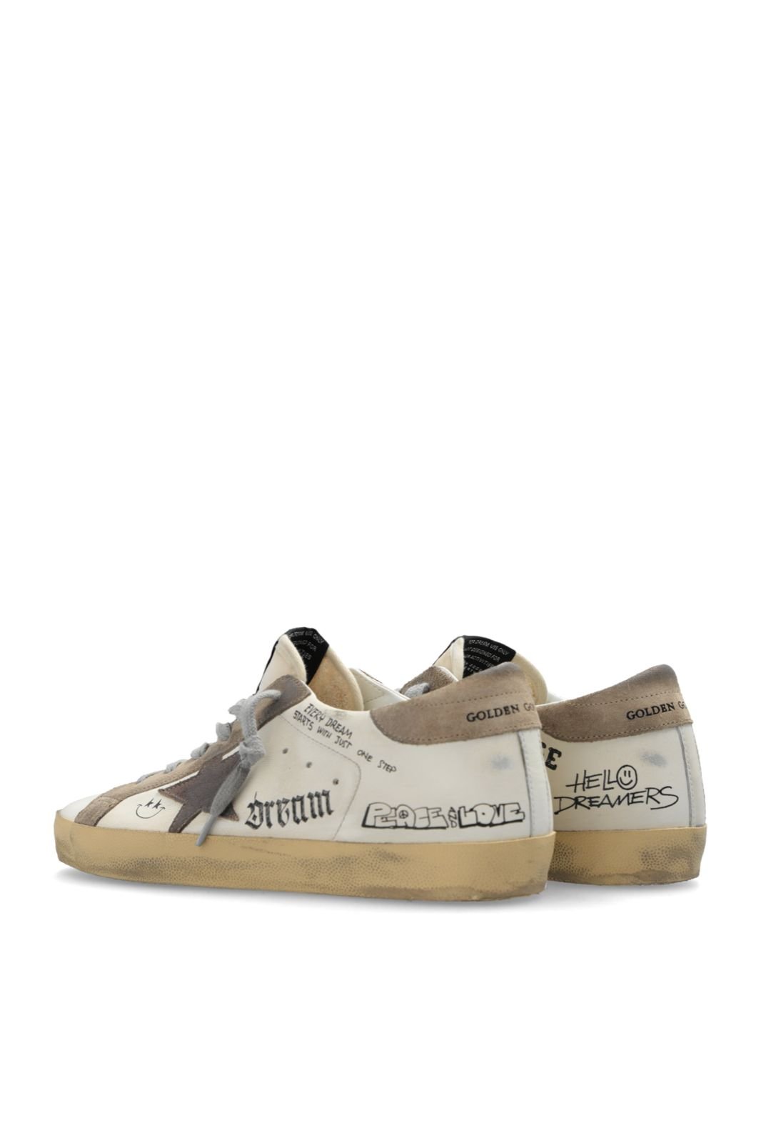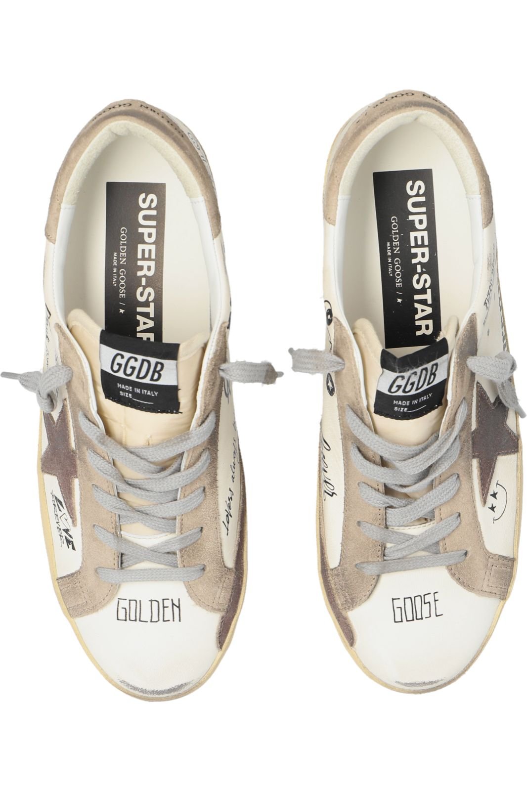Кеды белого цвета из кожи со вставками, закругленный носок, нашивка в форме звезды сбоку, нашивка с логотипом на язычке, тисненый логотип нажать, кожаная стелька с логотипом, резиновая подошва, шнуровка спереди.