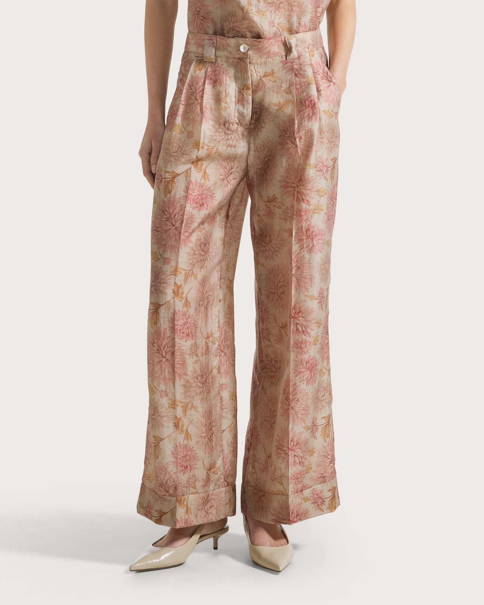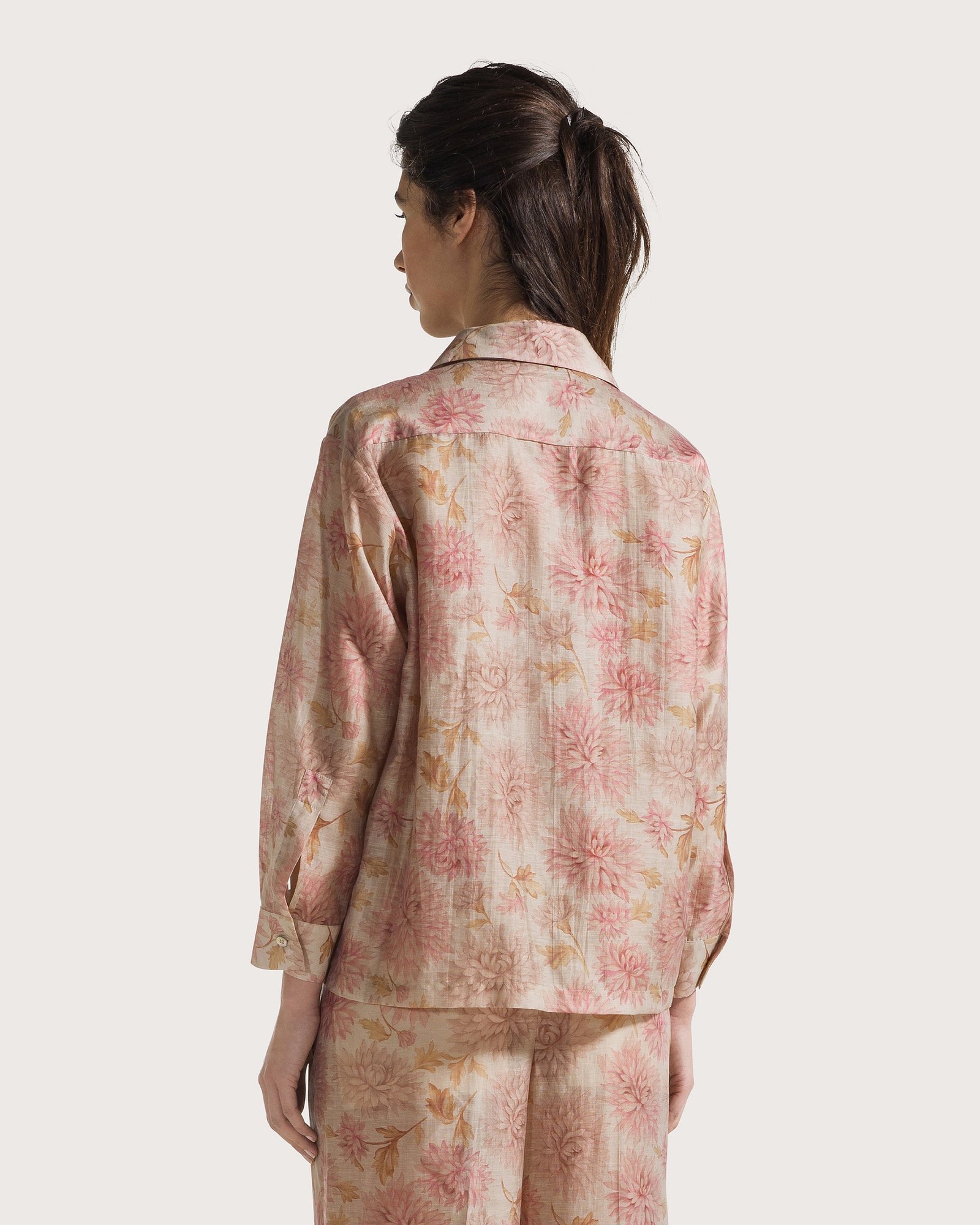 Рубашка-жакет и брюки из органзы в полоски с выцветшим цветочным принтом.