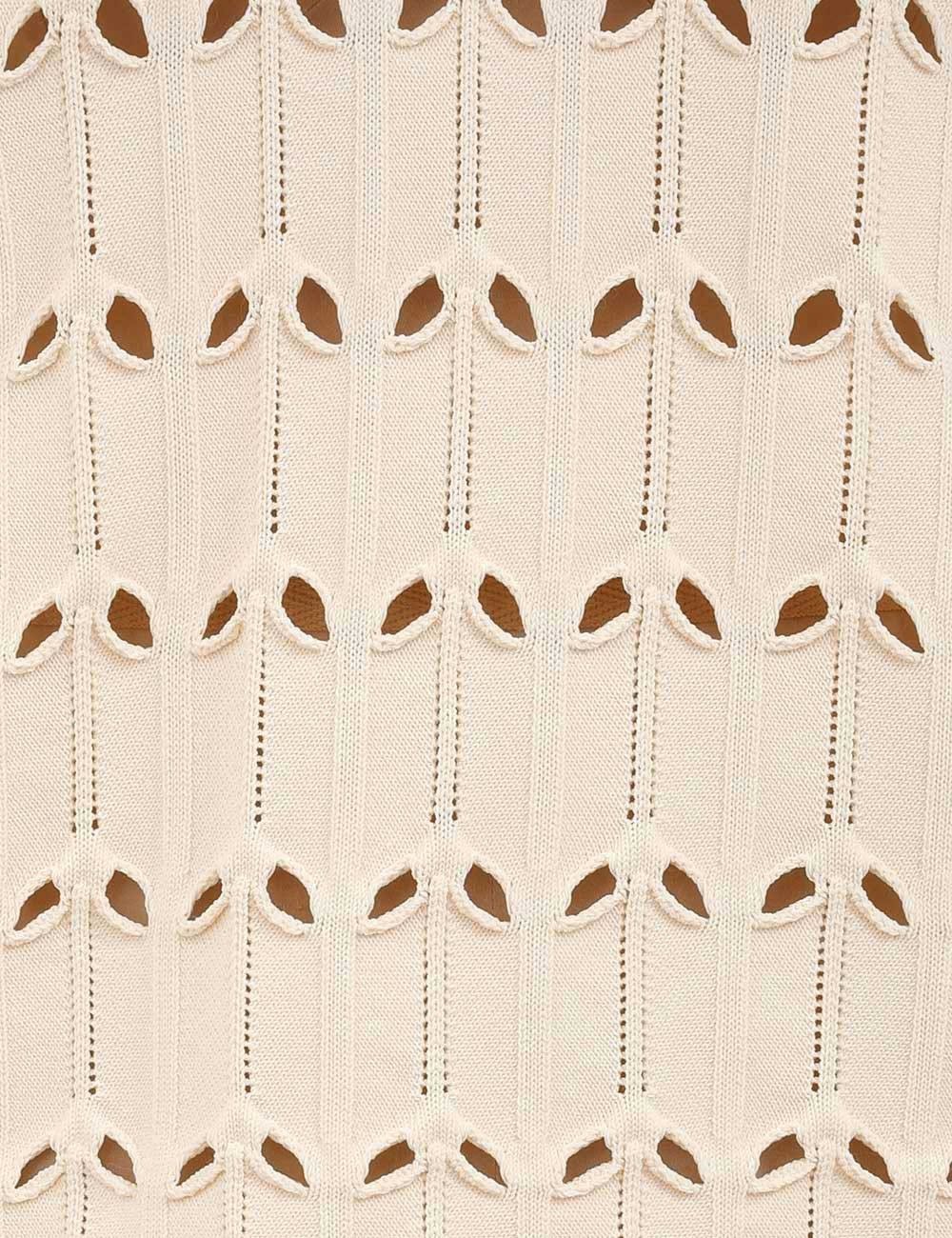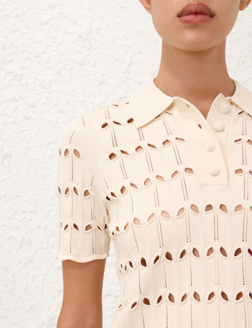 Футболка-поло Rhiannon Pointelle кремового цвета из нашей коллекции летних плавок 2025. Вязаная футболка-поло с классическим воротником, короткими рукавами и застежкой на пуговицы по центру спереди.