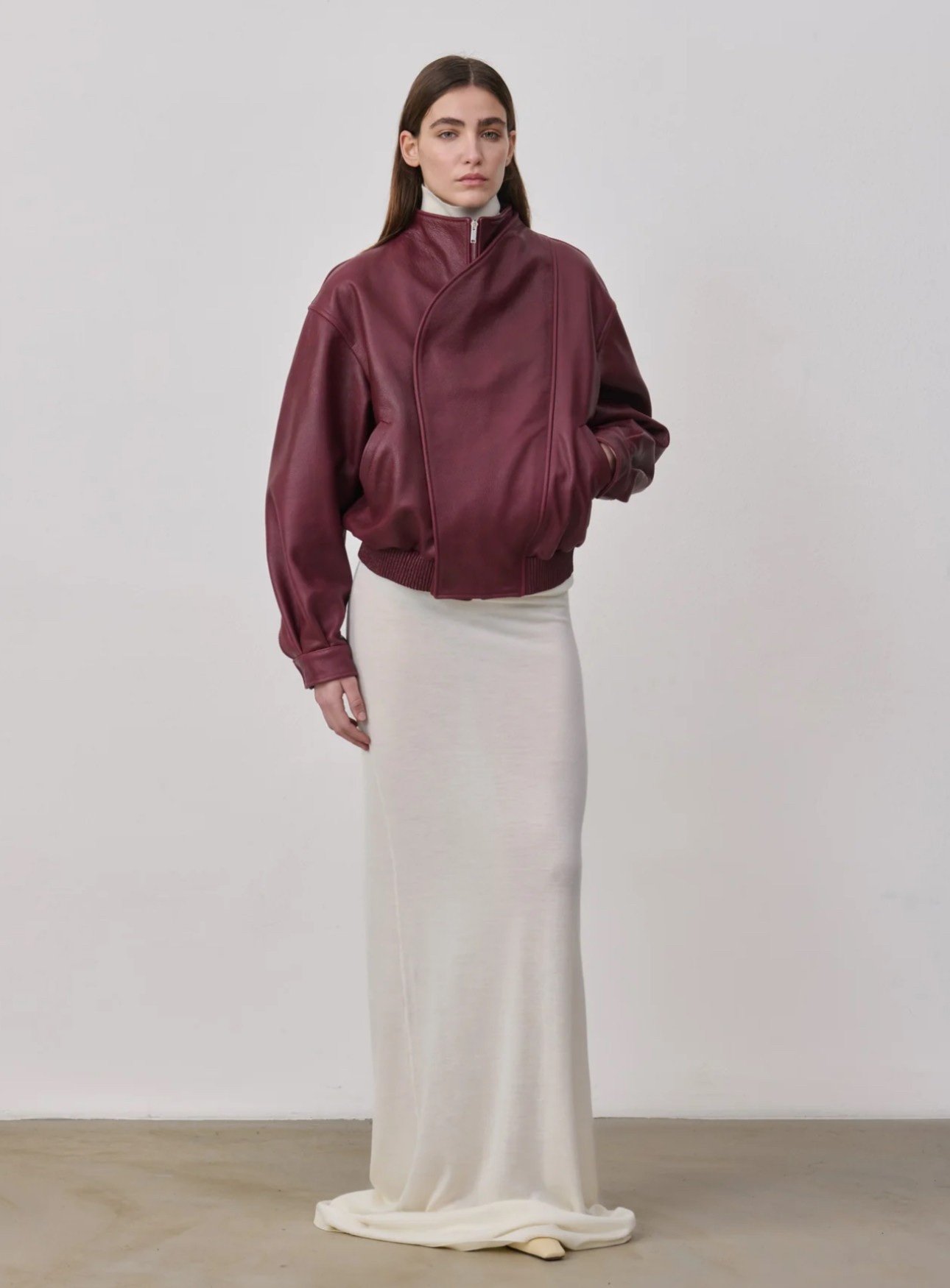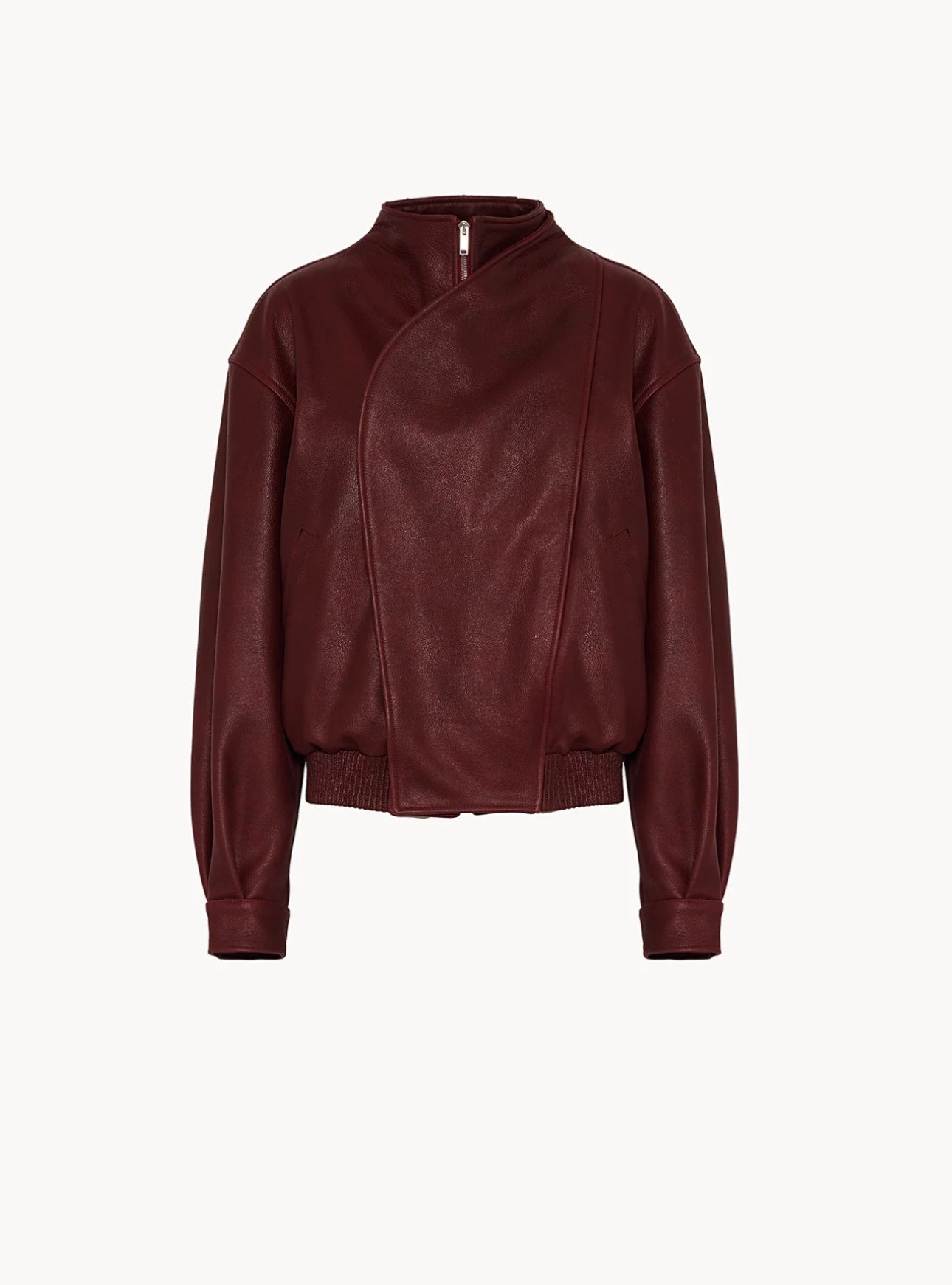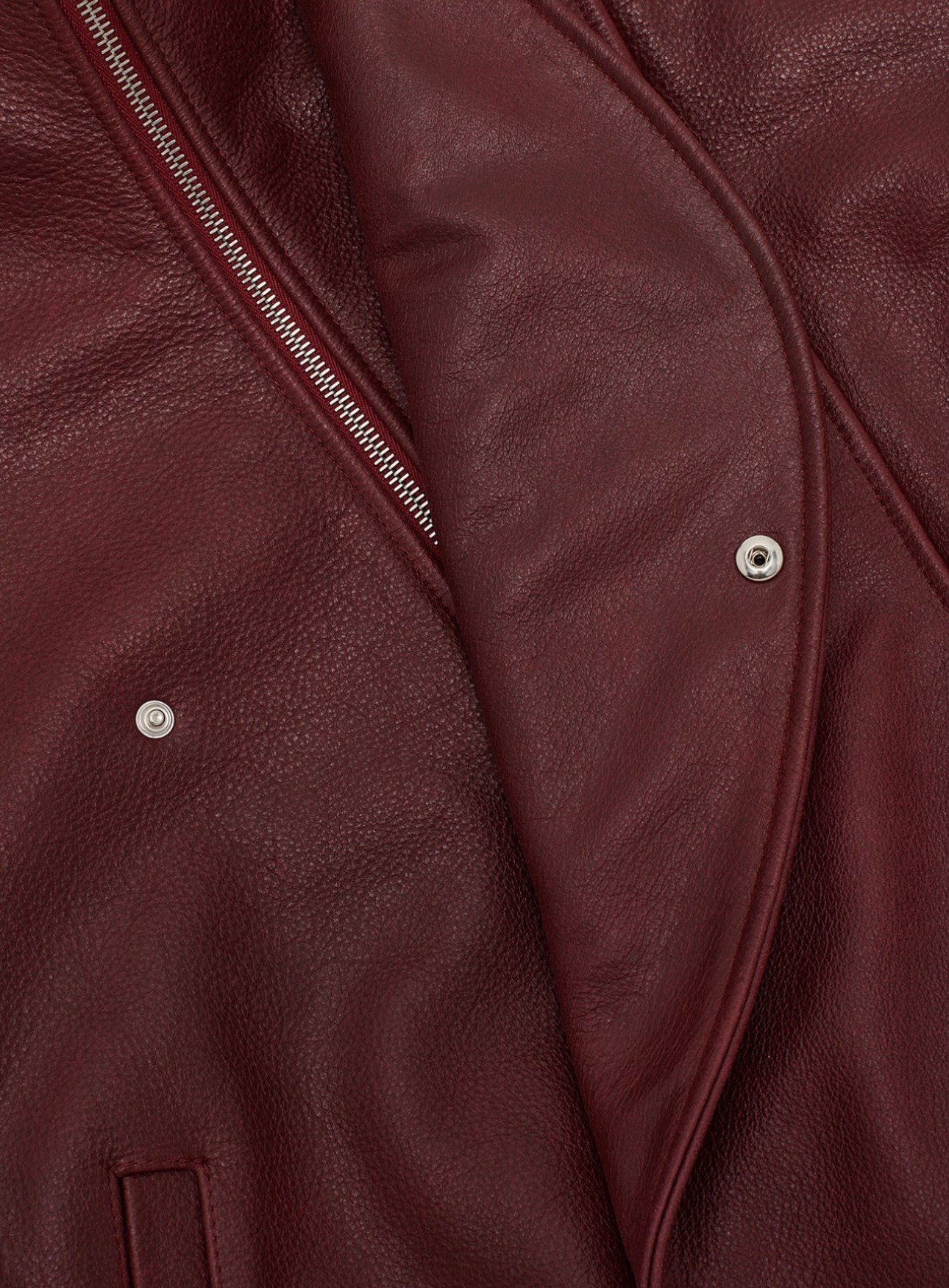 Куртка-бомбер оверсайз из телячьей кожи барабанного типа с воротником-кратером, центральной застежкой на молнию, прорезными боковыми карманами и прикрывающим молнию клапаном с застежкой на кнопке. Кожаная резинка на манжетах и подоле.