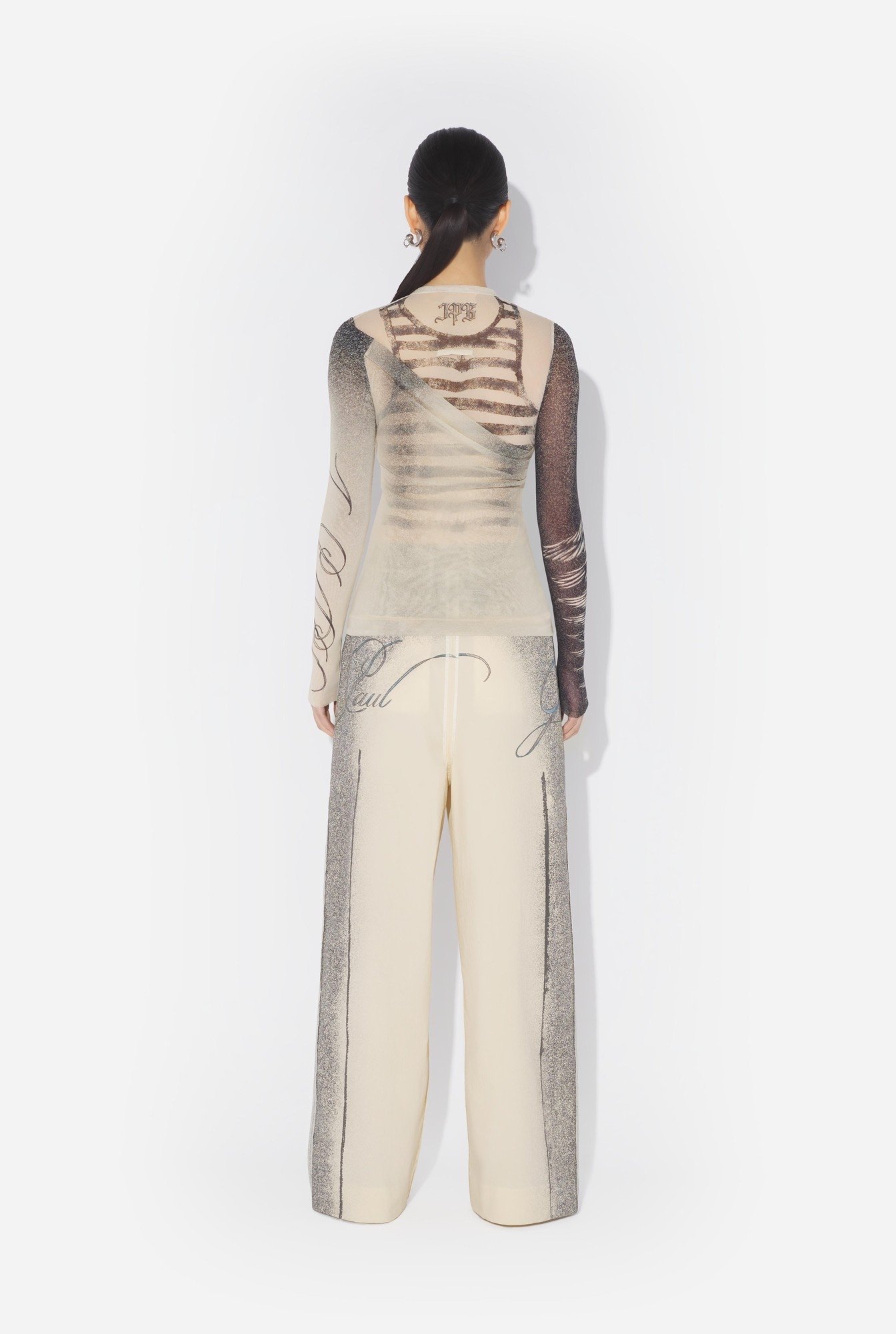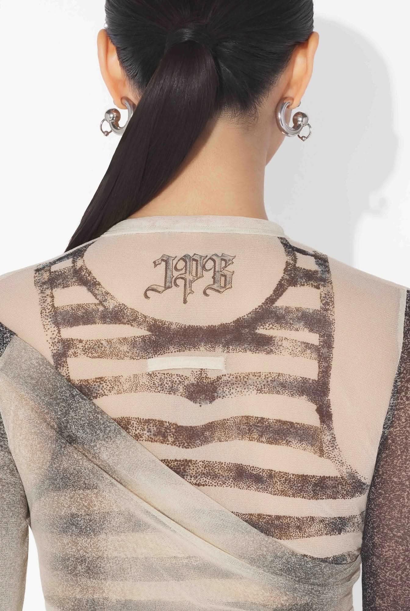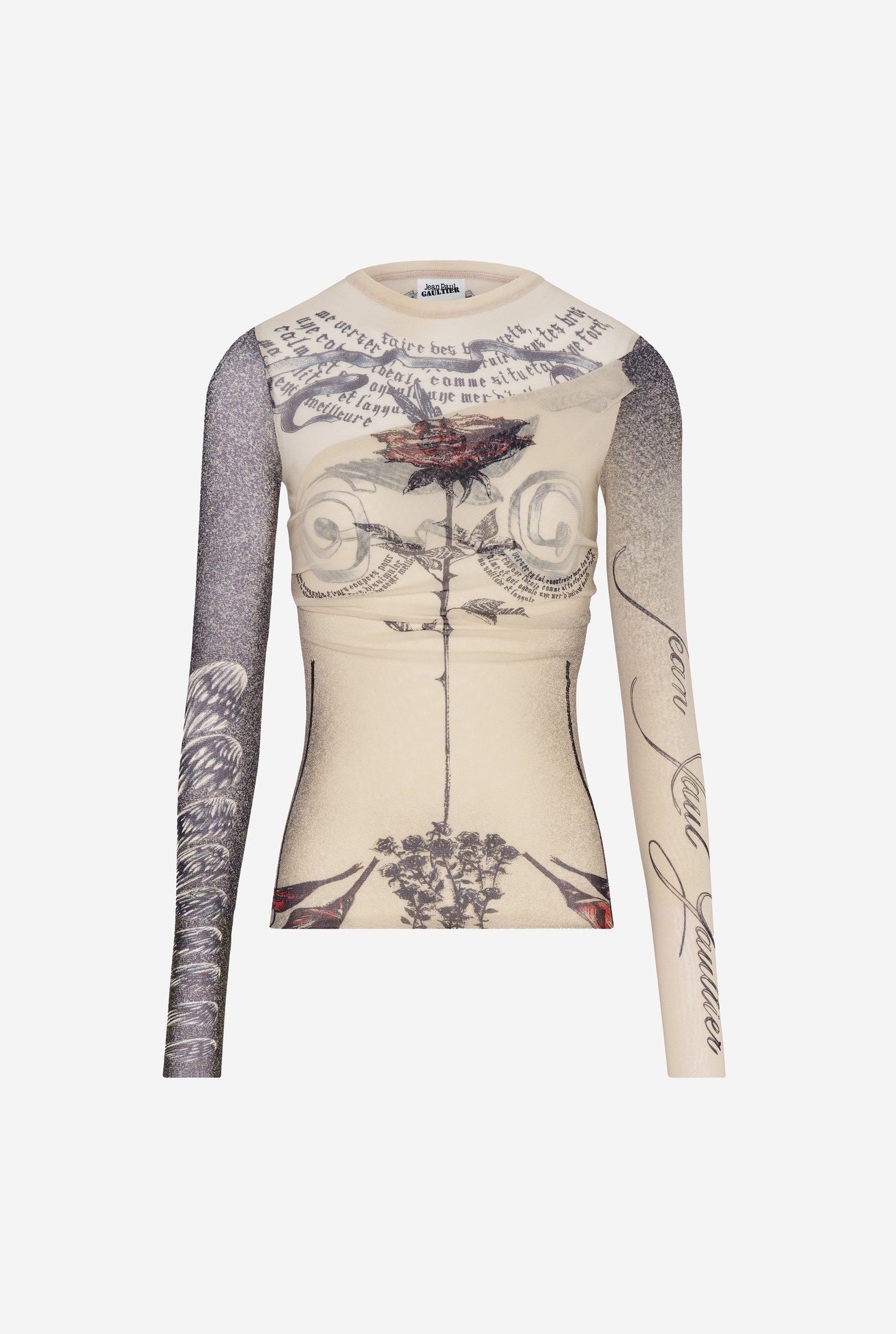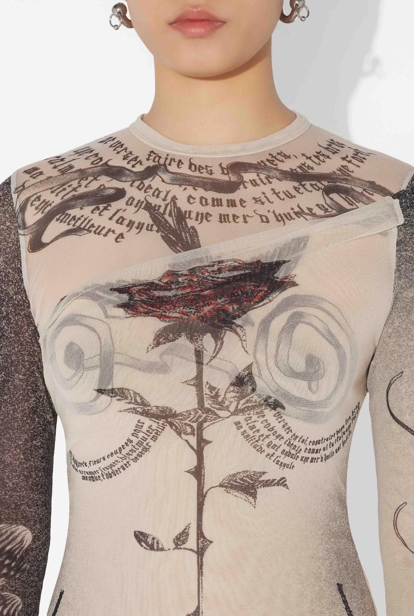 Топ из тюля цвета экрю с длинными рукавами и принтом «Татуировка розы и птицы» и драпированной тюлью спереди.