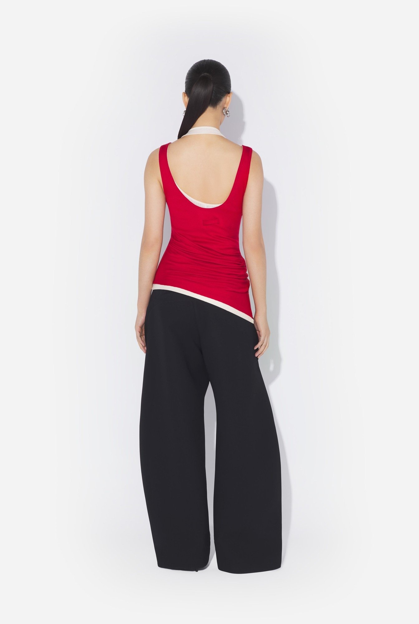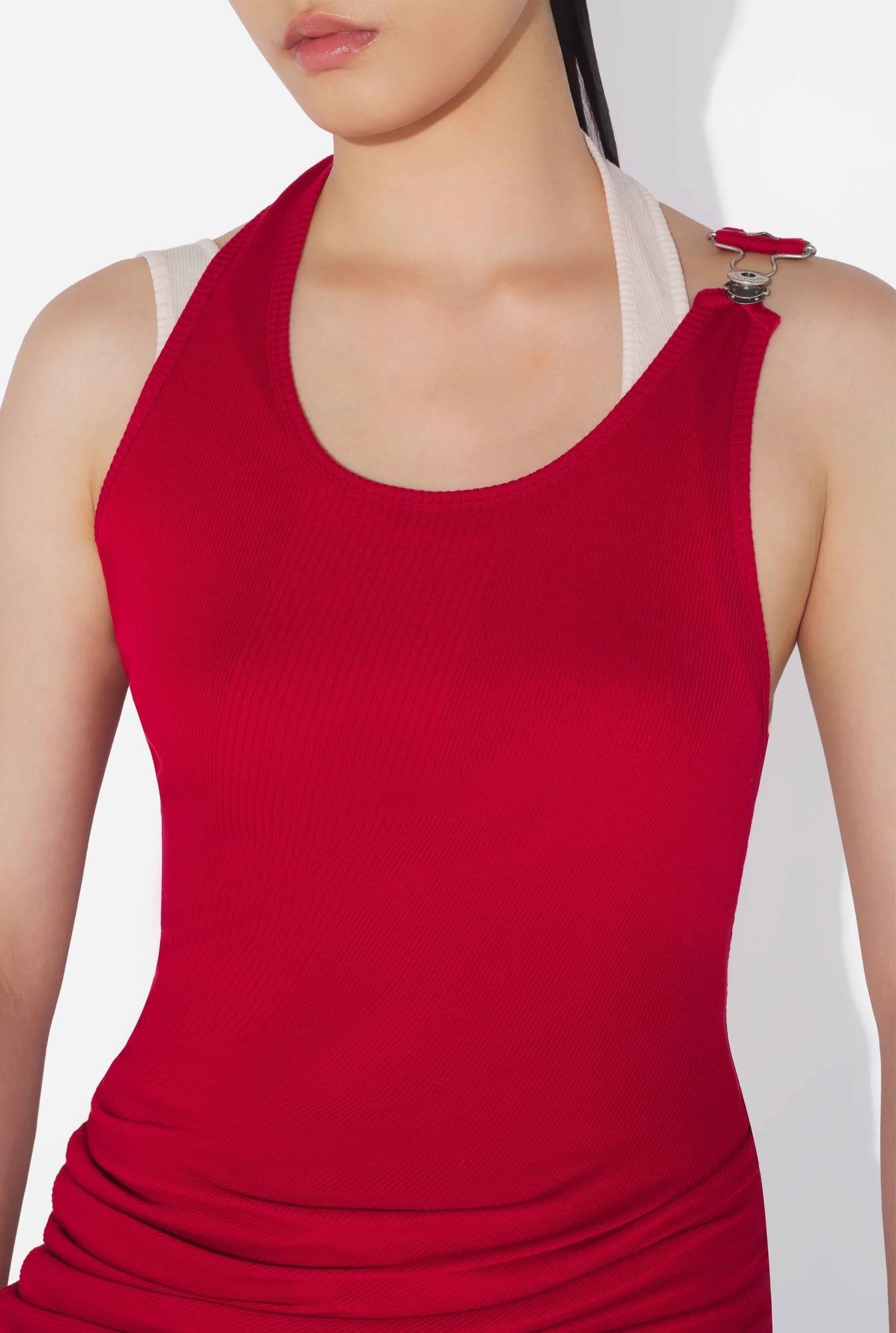 Майка с драпировкой из трикотажа красного и темно-серого цвета с пряжкой с гравировкой Jean Paul Gaultier.