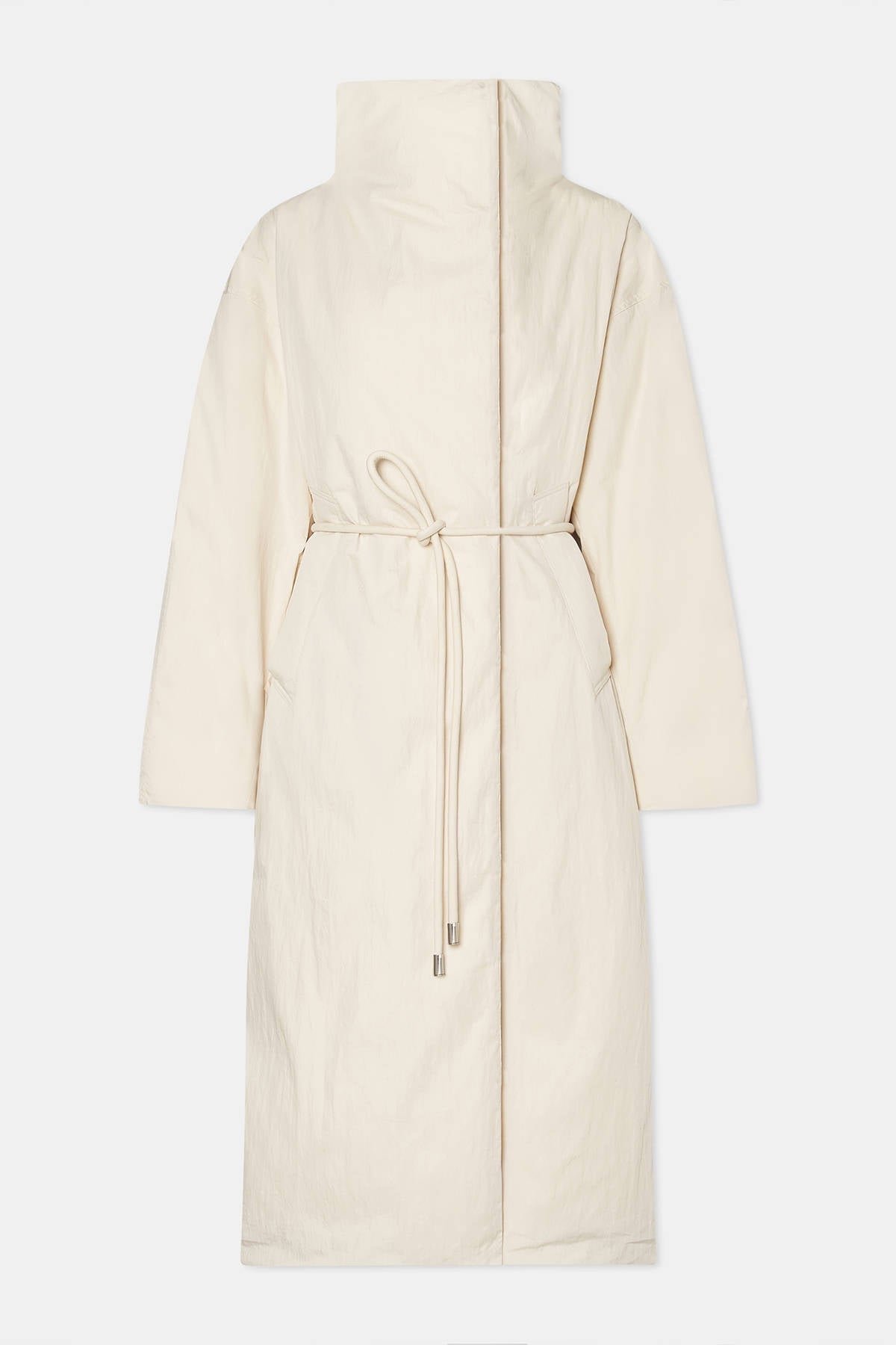 Это длинное пуховое пальто сочетает функциональность и элегантность с современным, обтекаемым силуэтом. Изготовлен из высокого воротника-воронкообразного выреза и шнурка на талии для регулировки посадки, оно обеспечивает тепло и комфорт, сохраняя минималистичную эстетику. Изготовлен из смеси хлопка и нейлона, он утеплен высококачественным пухом и перьями для исключительной мягкости и изоляции. Полностью подложенная внутренняя часть гарантирует гладкую поверхность, что делает его универсальным изделием для ежедневного ношения и изысканного слоя.