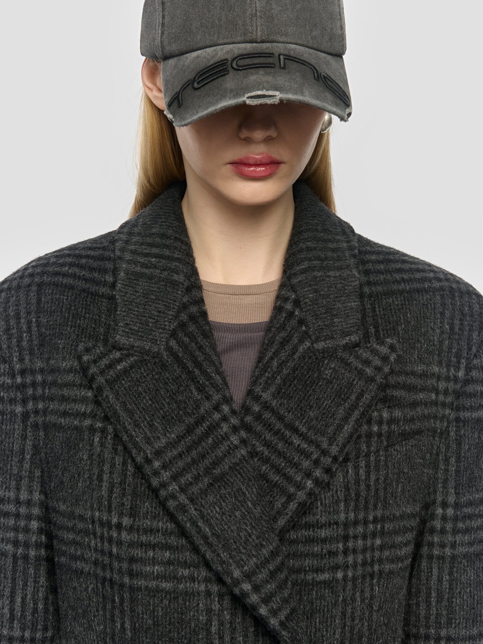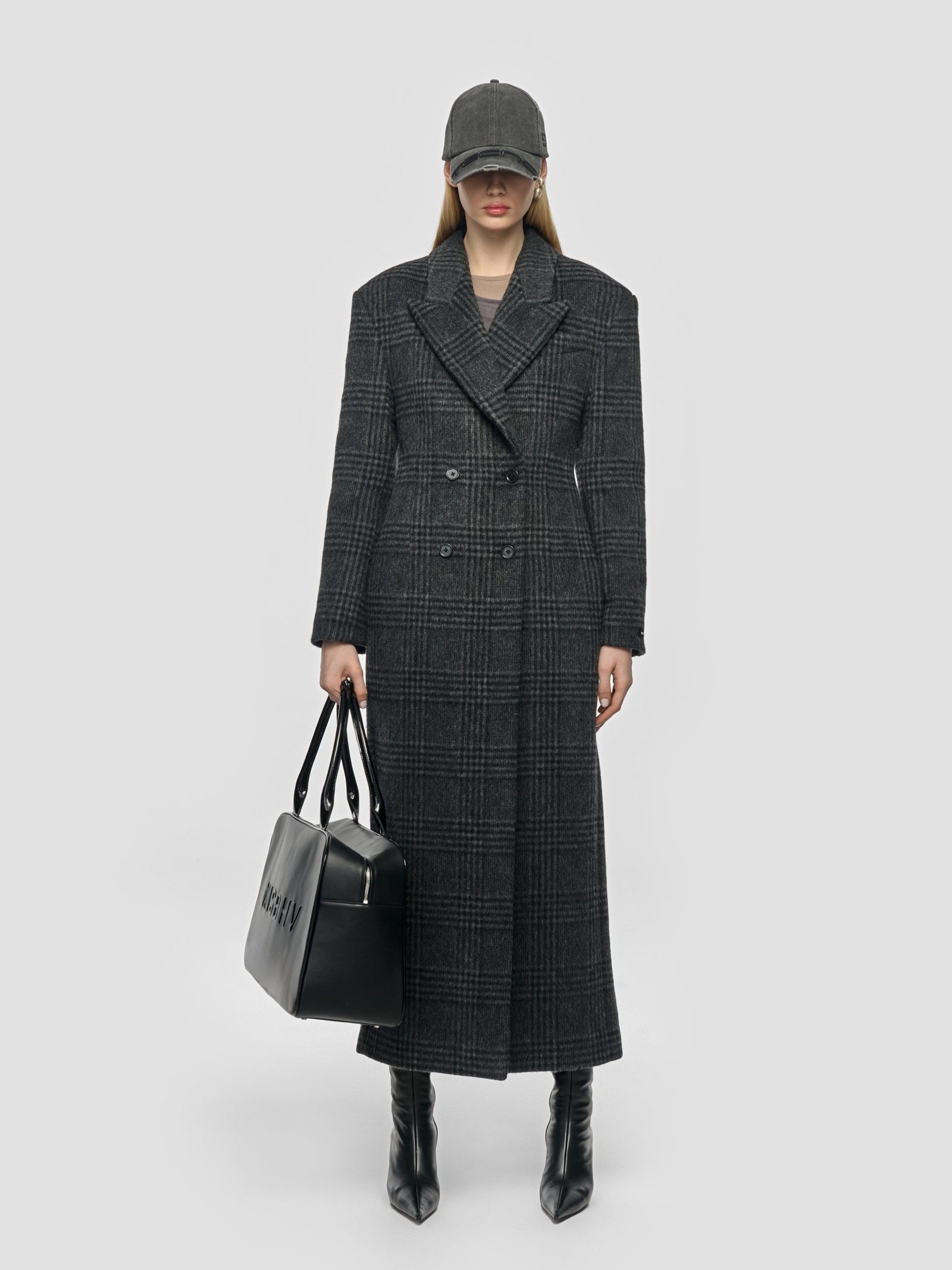 Двухбортное пальто из смеси шерсти и альпаки серого цвета.