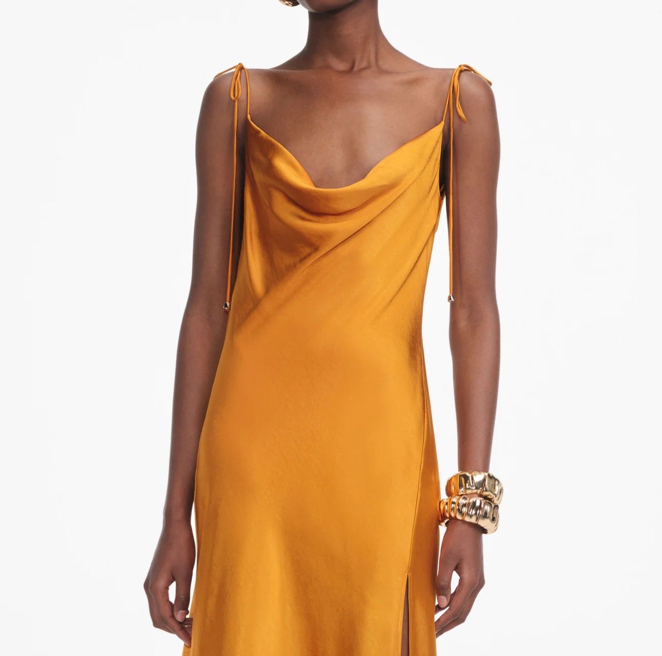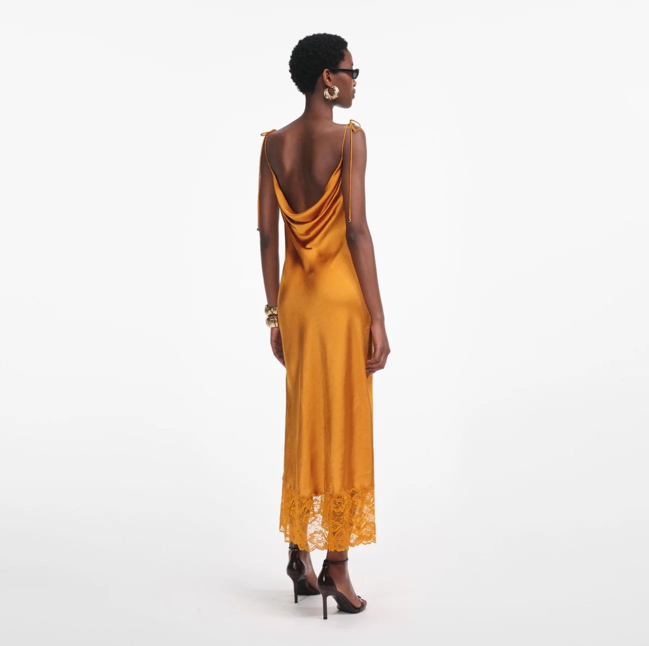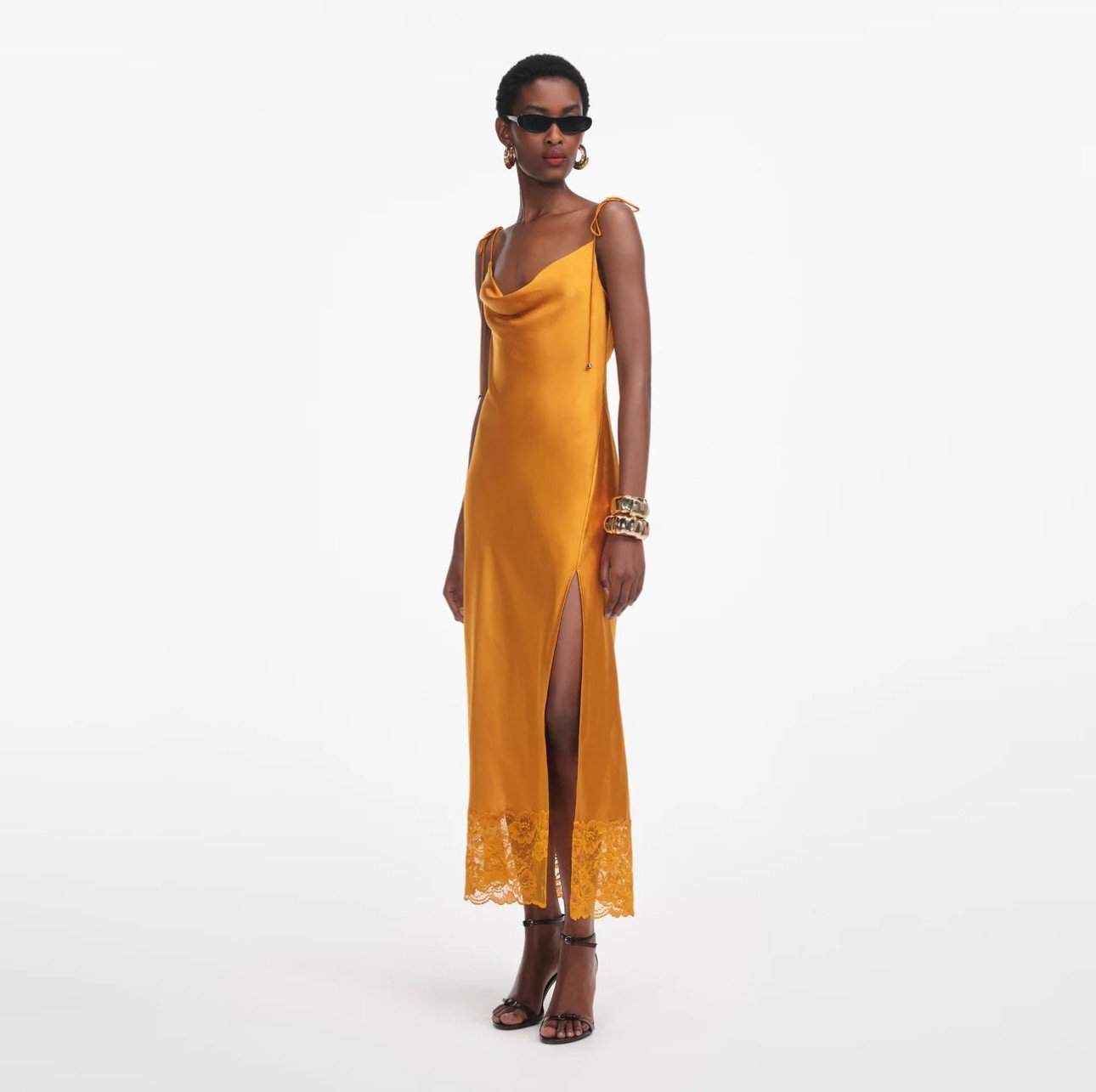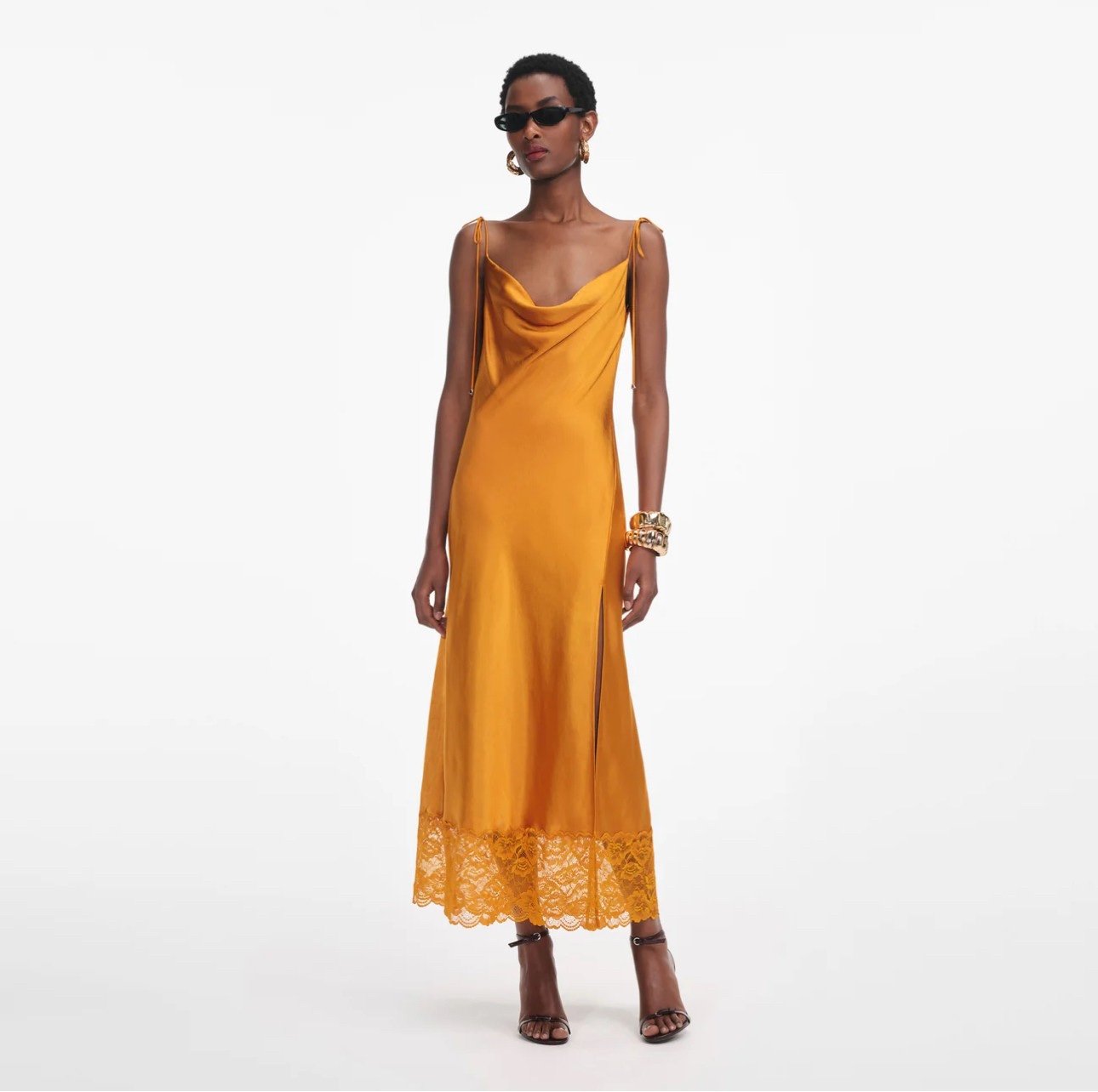 Это платье-комбинация, взятое из будуара, сочетает в себе акценты белья с блестящим оттенком. тянется