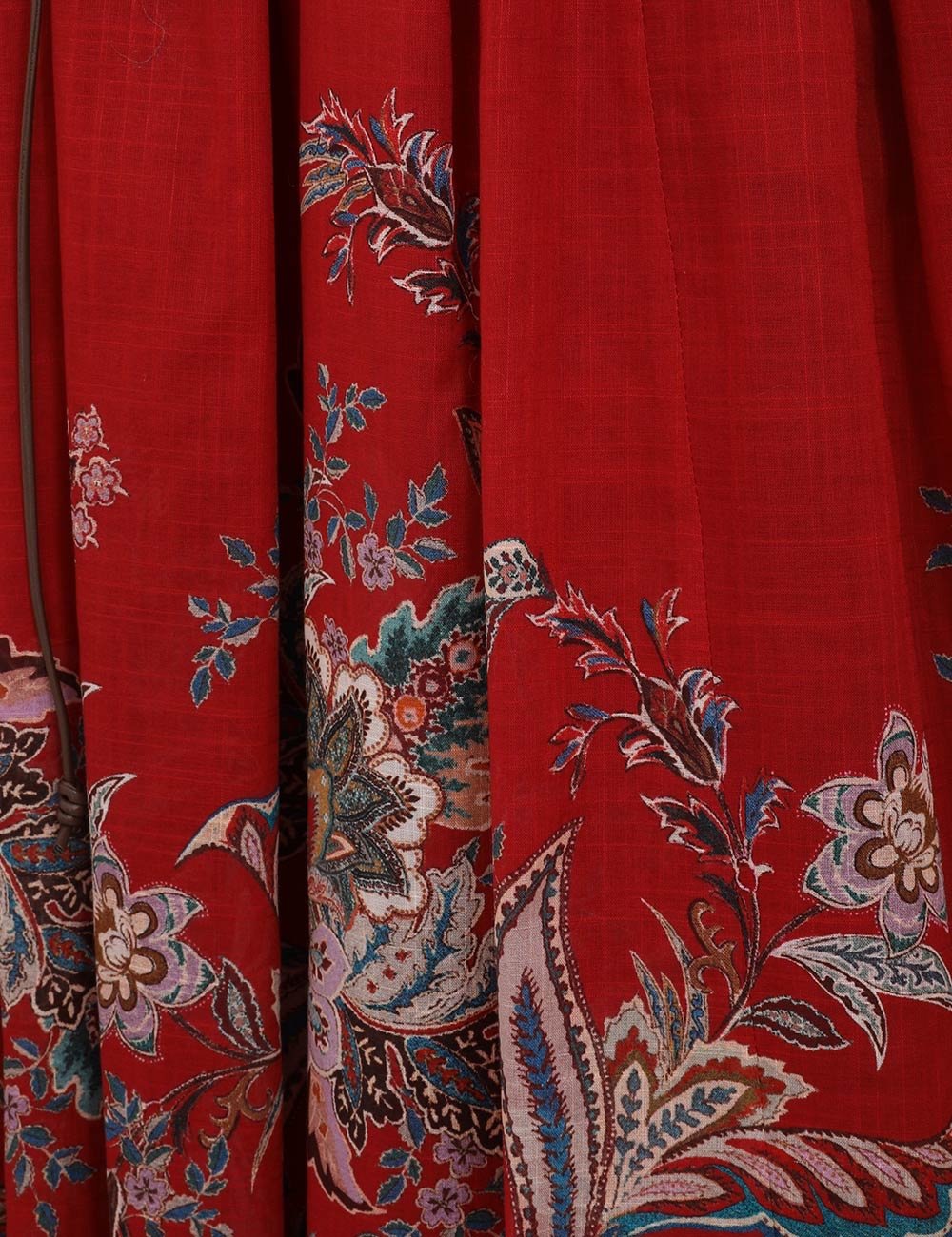 Платье меди с корсетом Rhiannon красного цвета с разноцветным пейсли из коллекции летних купальников 2025. Хлопковое платье меди со структурированным лифом, круглым вырезом, собранной талией и юбкой свободного кроя.