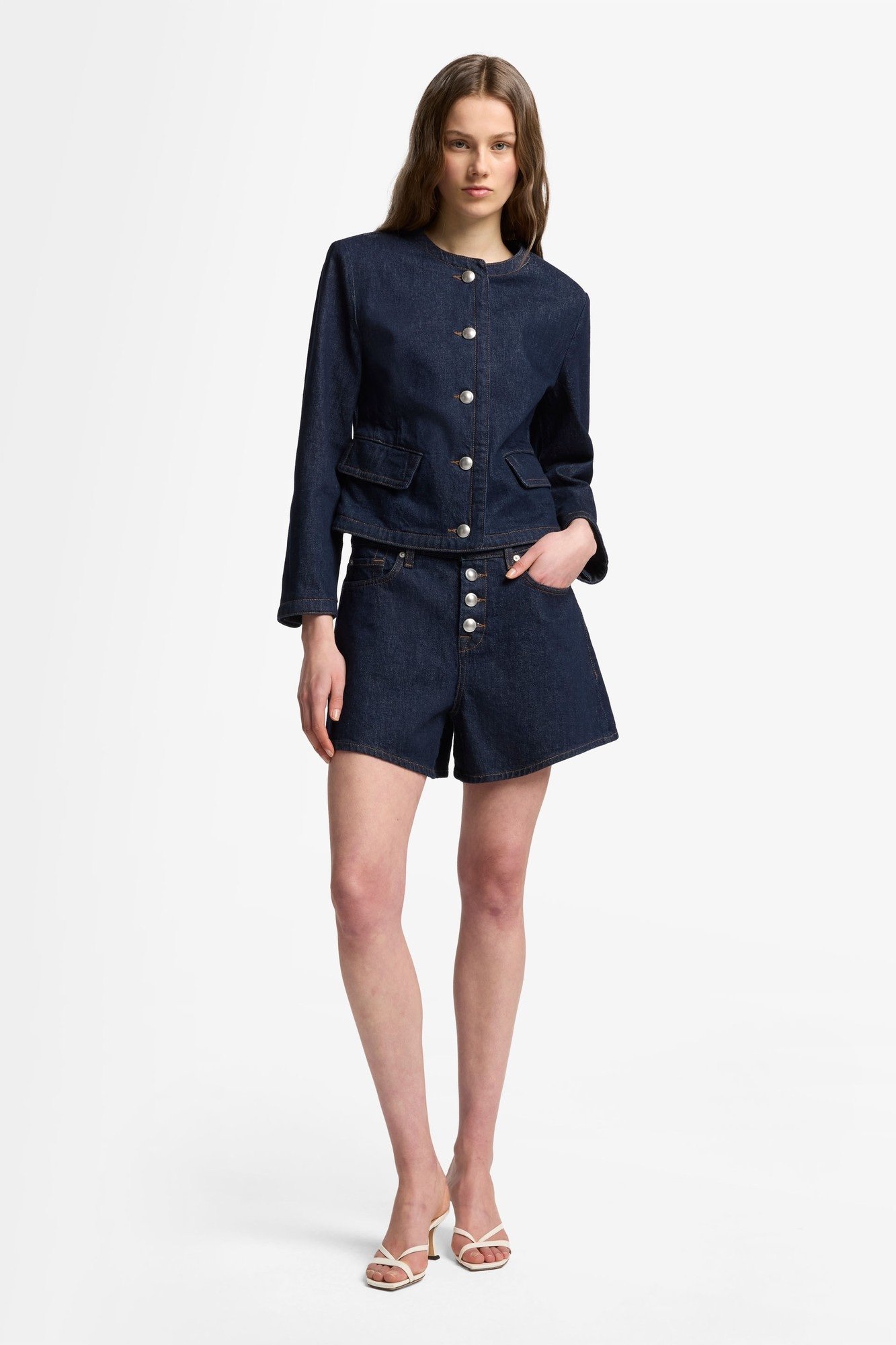 Шорты Kori из денима Mankind глубокой индиго-полировки имеют хороший структурированный силуэт. Этот направленный стиль имеет высокую талию и расклешенные брюки, что создает смелый образ. Нам нравятся серебряные пуговицы и детали табачного цвета. Носите их с подходящим к нему пиджаком и остроносыми босоножками-ремнями для беззаботного и изысканного образа.