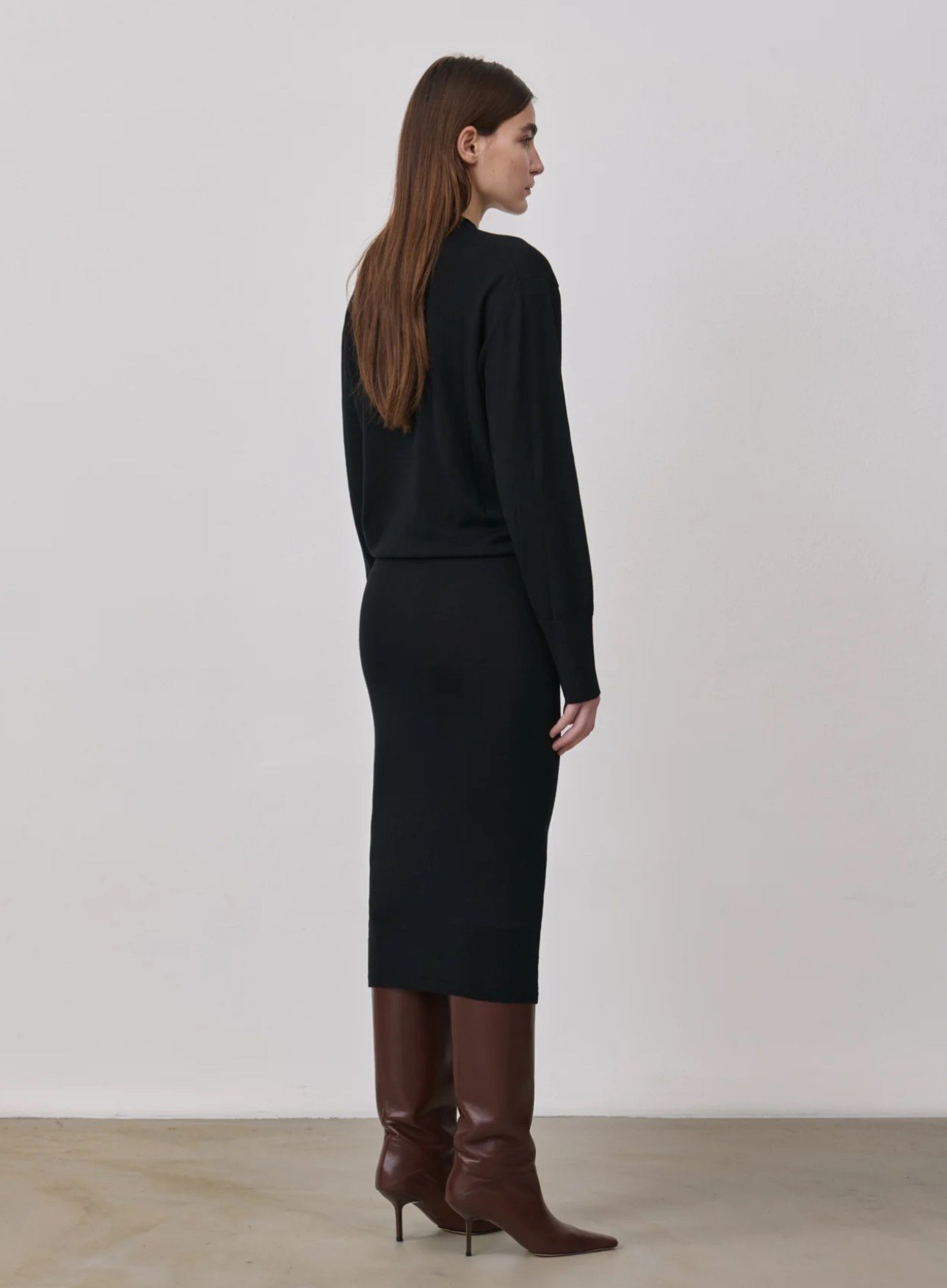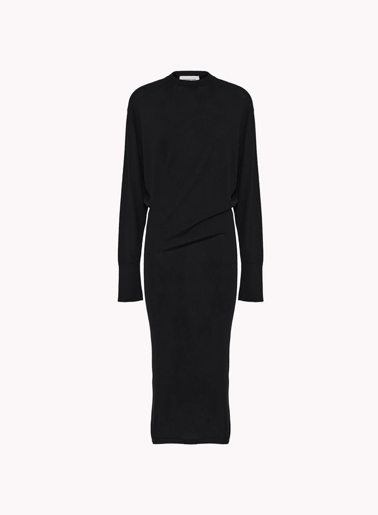 Платье меди из мериносовой шерсти и кашемира с круглым вырезом. Изготовленная в форме воронки, она облегает бедра, сохраняя при этом свободный крой в верхней части. Состав: 90% ультратонкая мериносовая шерсть, 10% кашемир