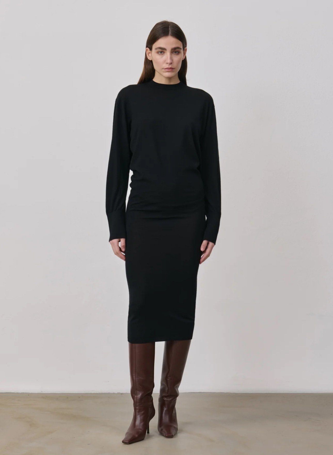 Платье меди из мериносовой шерсти и кашемира с круглым вырезом. Изготовленная в форме воронки, она облегает бедра, сохраняя при этом свободный крой в верхней части. Состав: 90% ультратонкая мериносовая шерсть, 10% кашемир