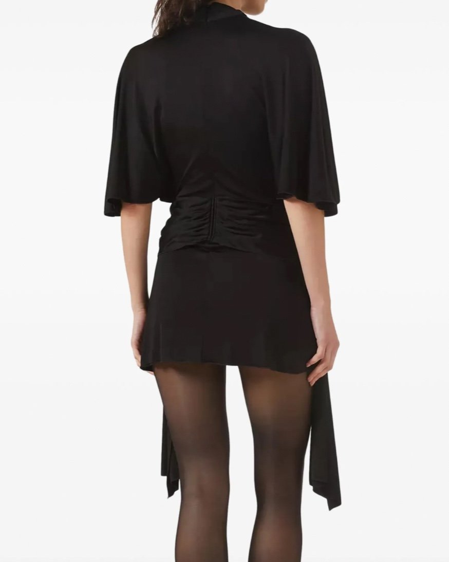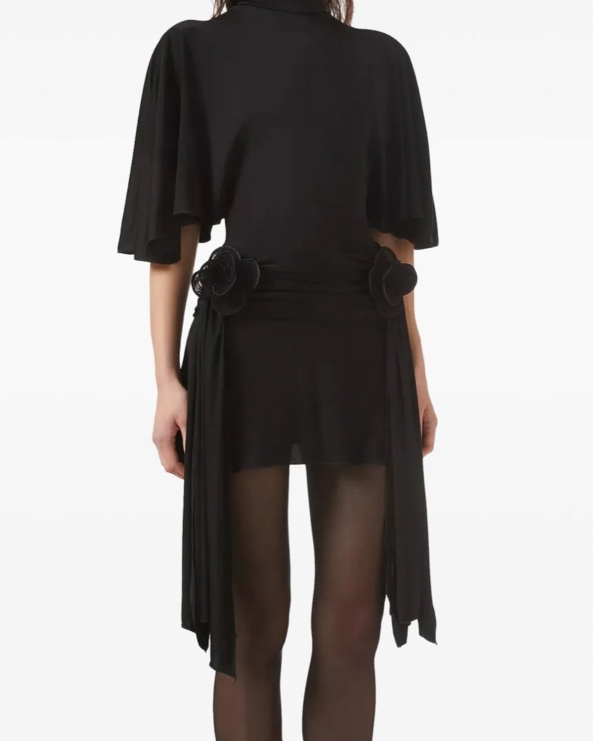 Изготовленное из струящего трикотажа, это мини-платье имеет высокий воротник, драпированные рукава и объемный кружевной цветок с драпировкой на бедрах. Застегивается на скрытую молнию сзади.
