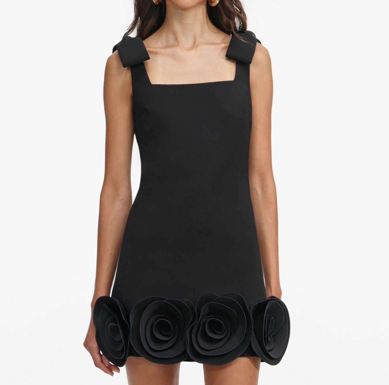 Вырезанные из черного крепа, скульптурные цветочные мотивы по подолу придают непревзойденный шарм минималистичному крою этого платья LBD. Бретели с бантом – это изюминка – сочетайте их с туфлями на каблуке для следующего вечера.