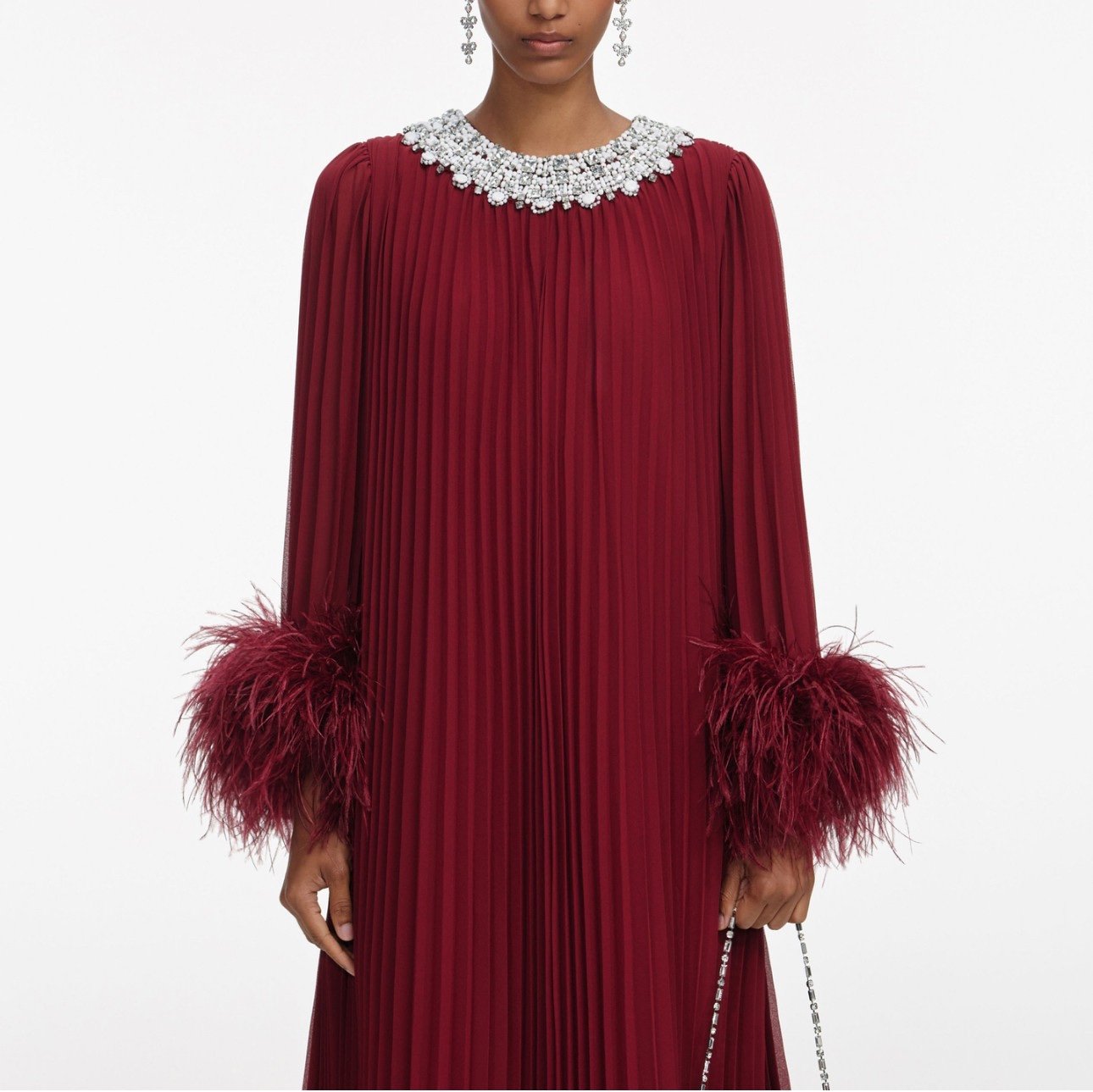 Почувствуйте драматизм в этом изысканном платье из бордового плиссированного шифона, которое создает объемное, но одновременно легкое чувство. В комплект входят аксессуары с бриллиантовой и жемчужной отделкой, а также шикарные манжеты из перьев. перья