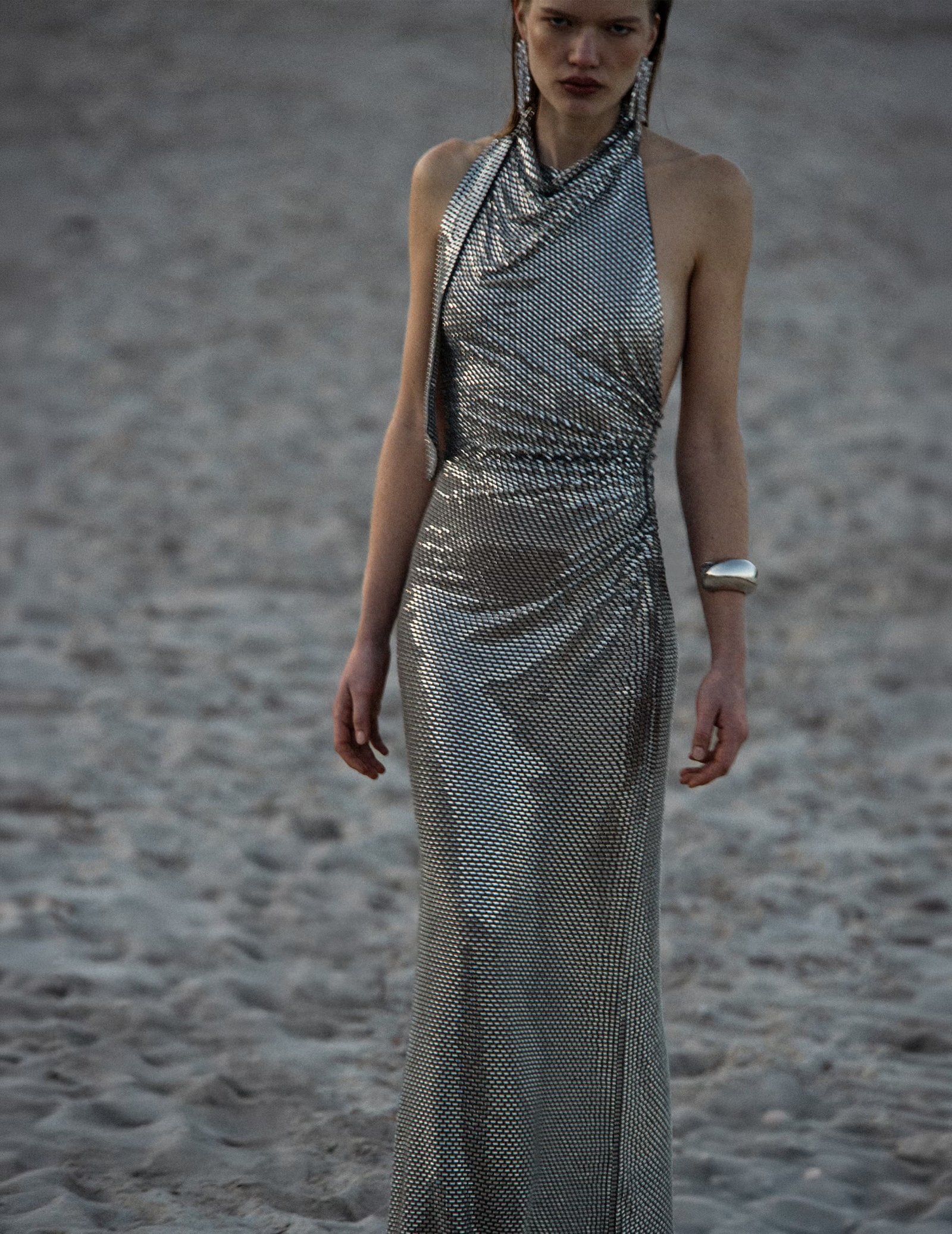 Это макси-платье идеально подчеркивает все изгибы благодаря своему изящному крою и глубокому вырезу с открытой спиной. Стразы по всей поверхности придают футуристическому блеску – стильный образ с каблуками для ослепительного входа. 6