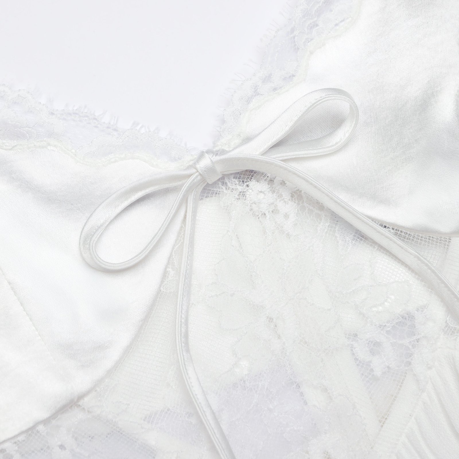 Прозрачные кружевные вставки и жемчужные завязки добавляют интриги - идеально подходит для девичников и вечеринок после вечеринки.