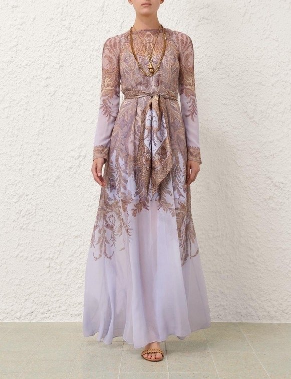 Длинное платье с круглым вырезом горловины и отделкой, завязываемым на талии съемным шарфом и застежкой на невидимую молнию.