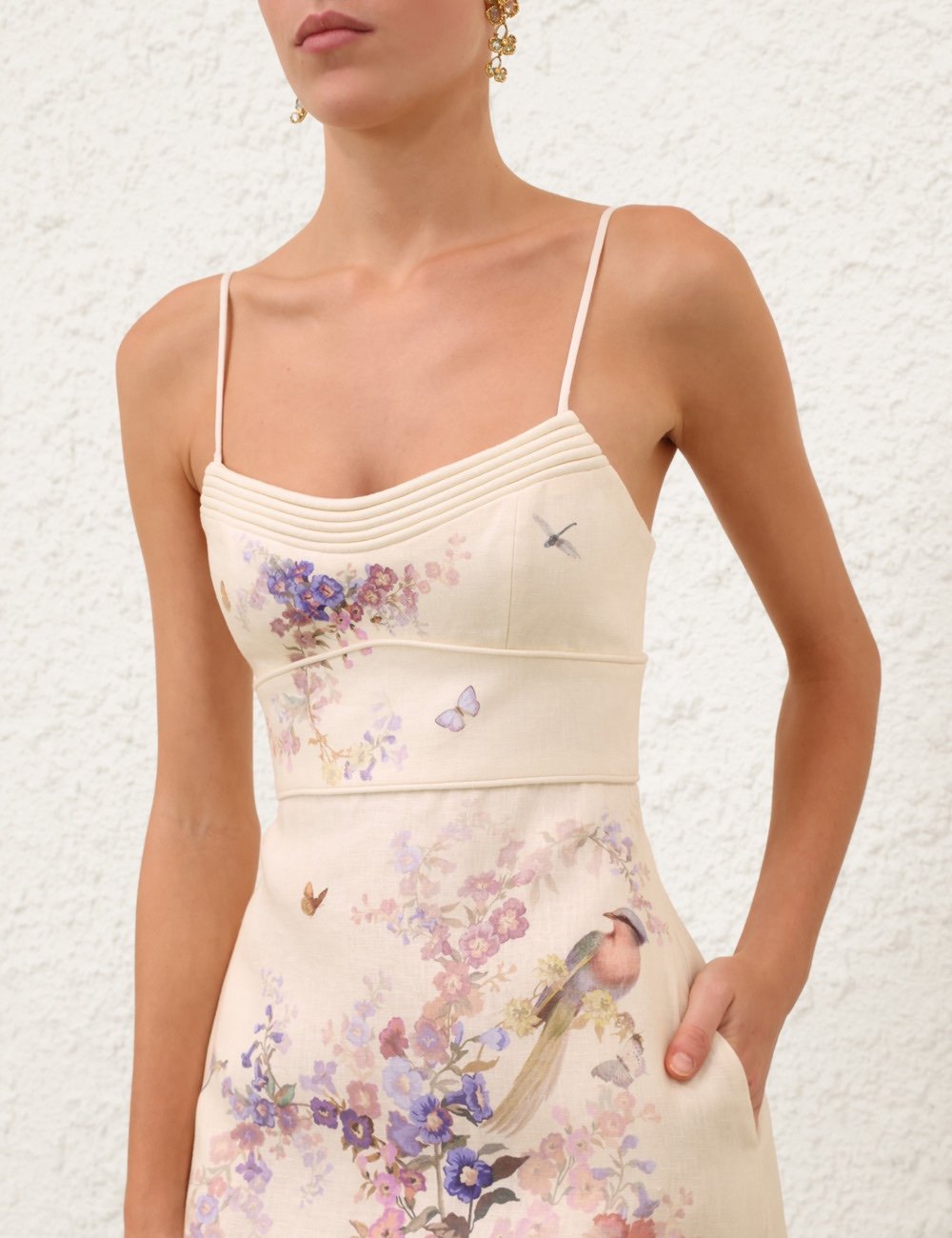 Платье меди Alchemy кремового цвета с цветочным принтом из нашей весенней коллекции 2026 года, Kindred Spirit. Льняное платье меди с V-образным вырезом горловины, регулируемыми бретелями, фиксированным поясом, украшенным гофрированным лифом сзади и мягко расклешенным низом.