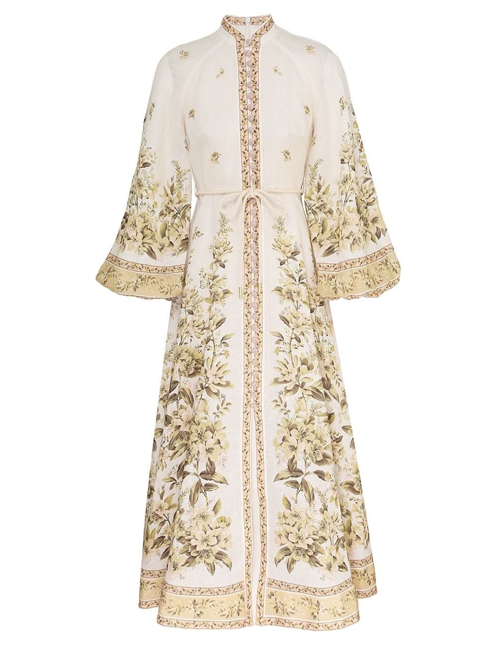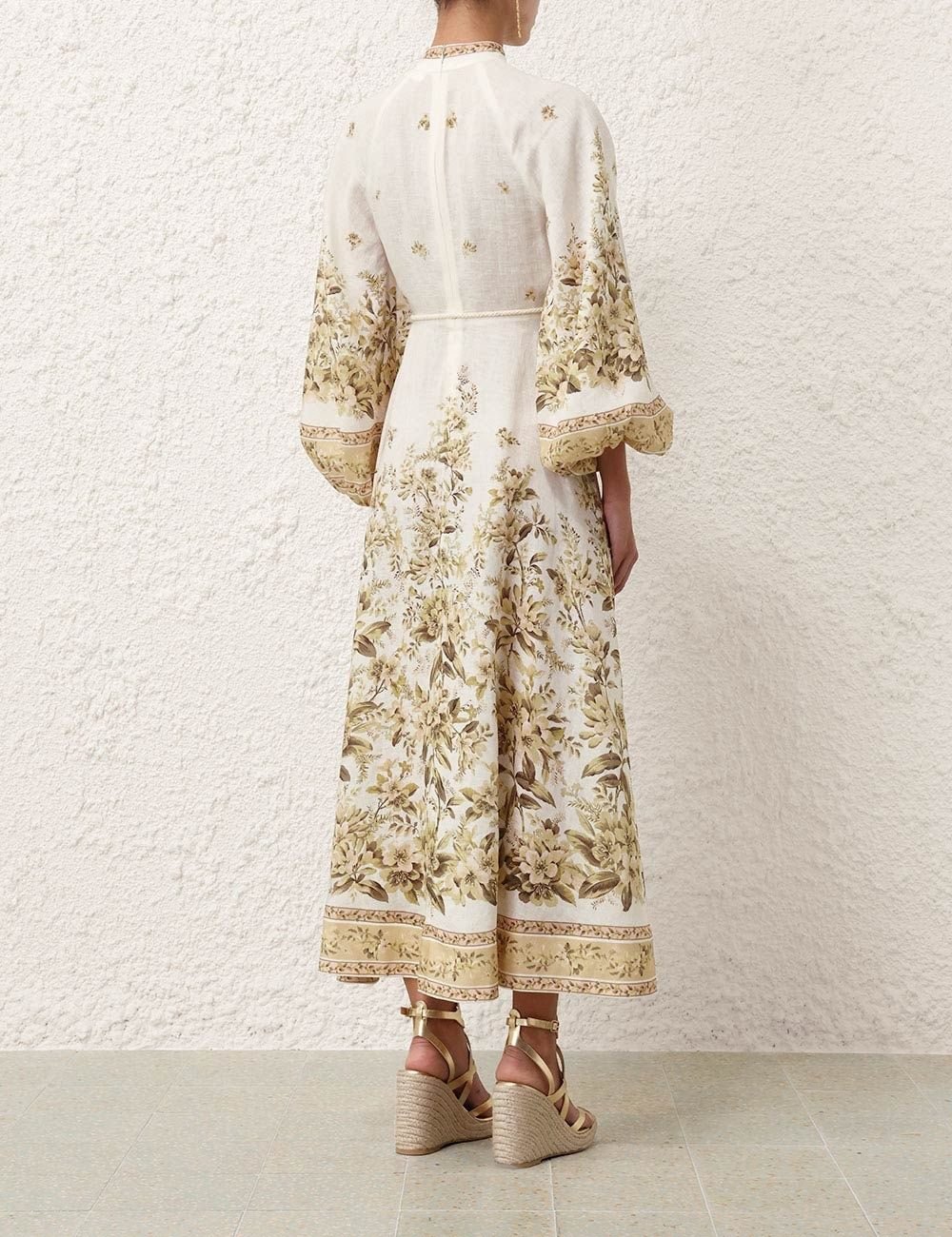 Платье миди с золотистой пуговицей с цветочным орнаментом Sage Toile из коллекции Summer Swim 2024.