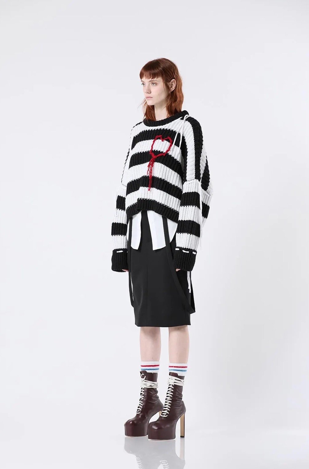Трикотажный свитер в полоски и вышитое красное сердечко.