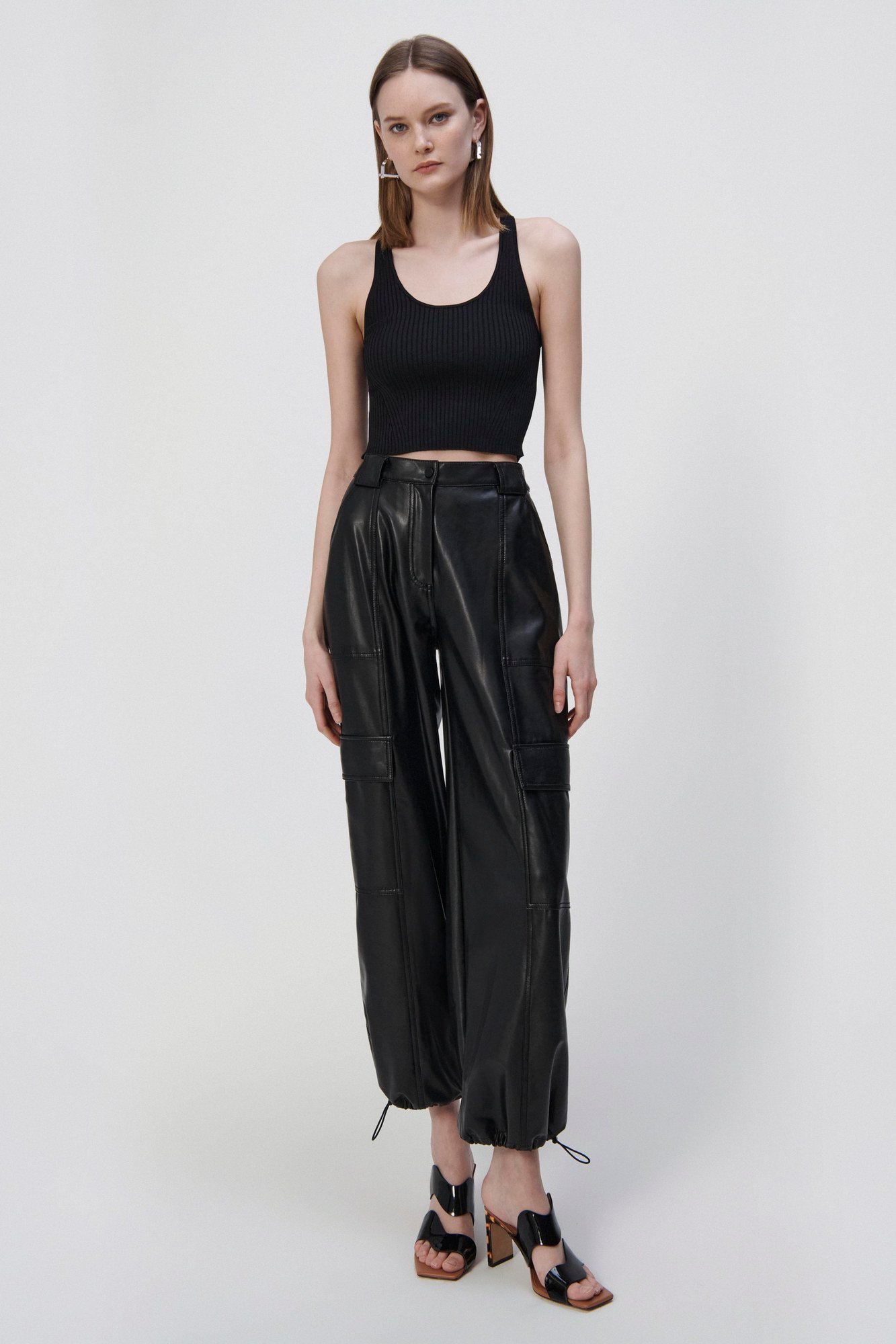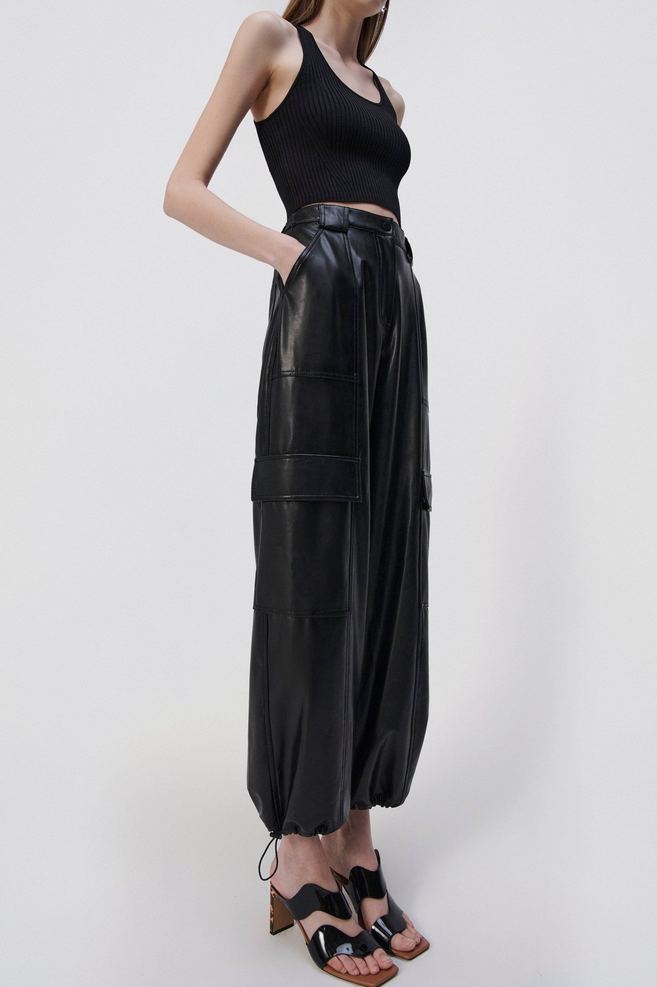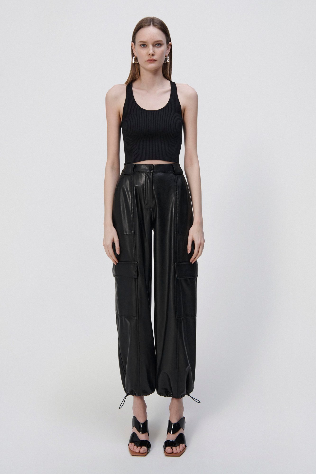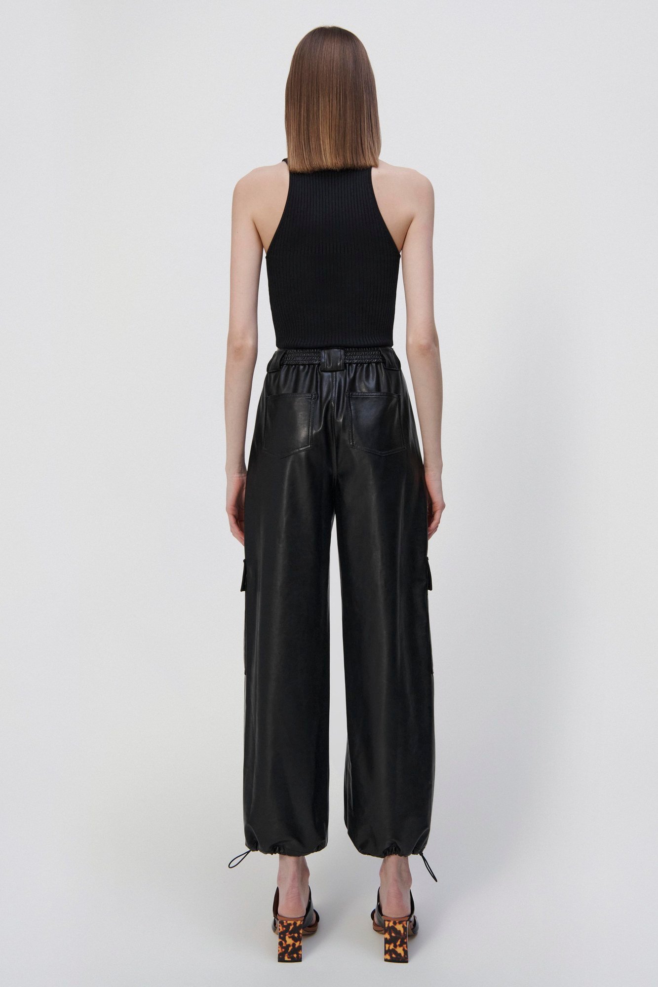 Штани карго, виготовлені з м’якої веганської шкіри, м’якого крою для легкого драпірування. Завищена талія, широкі штанини. Затягнута щиколотка за допомогою шнура.