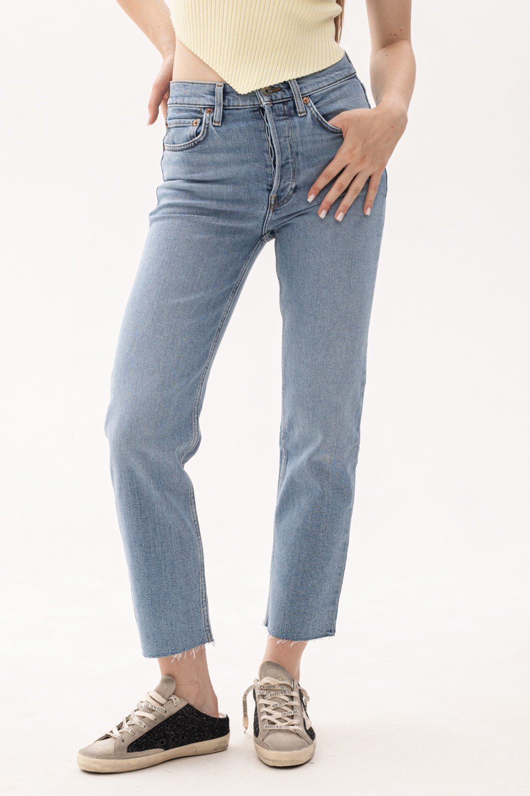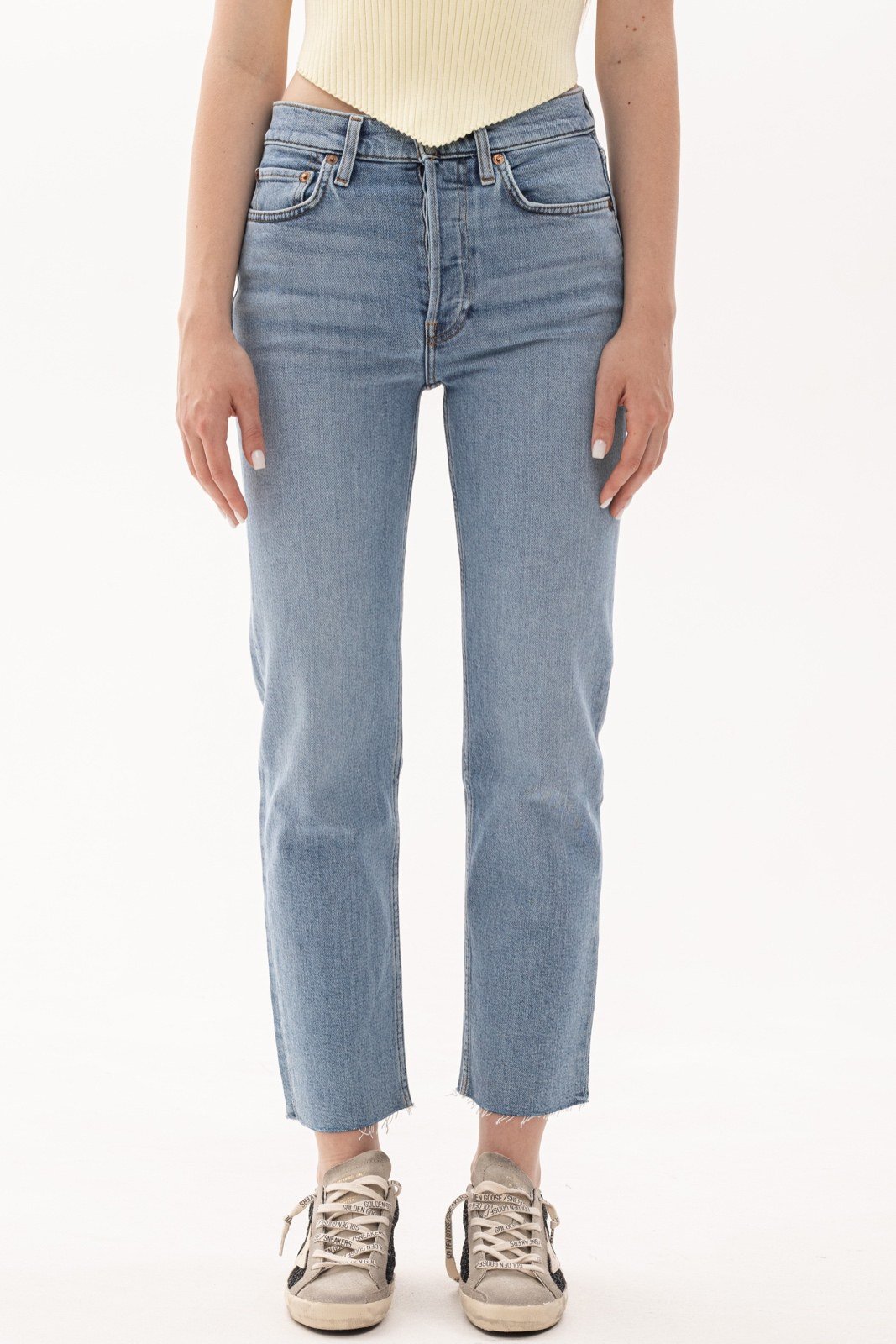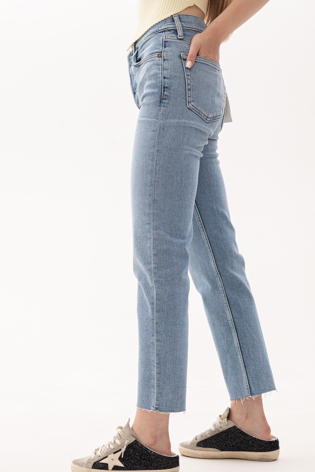 Укорочені прямі джинси 70-х років із стрейч-бавовни із укороченими прямими штанинами та необробленими краями.