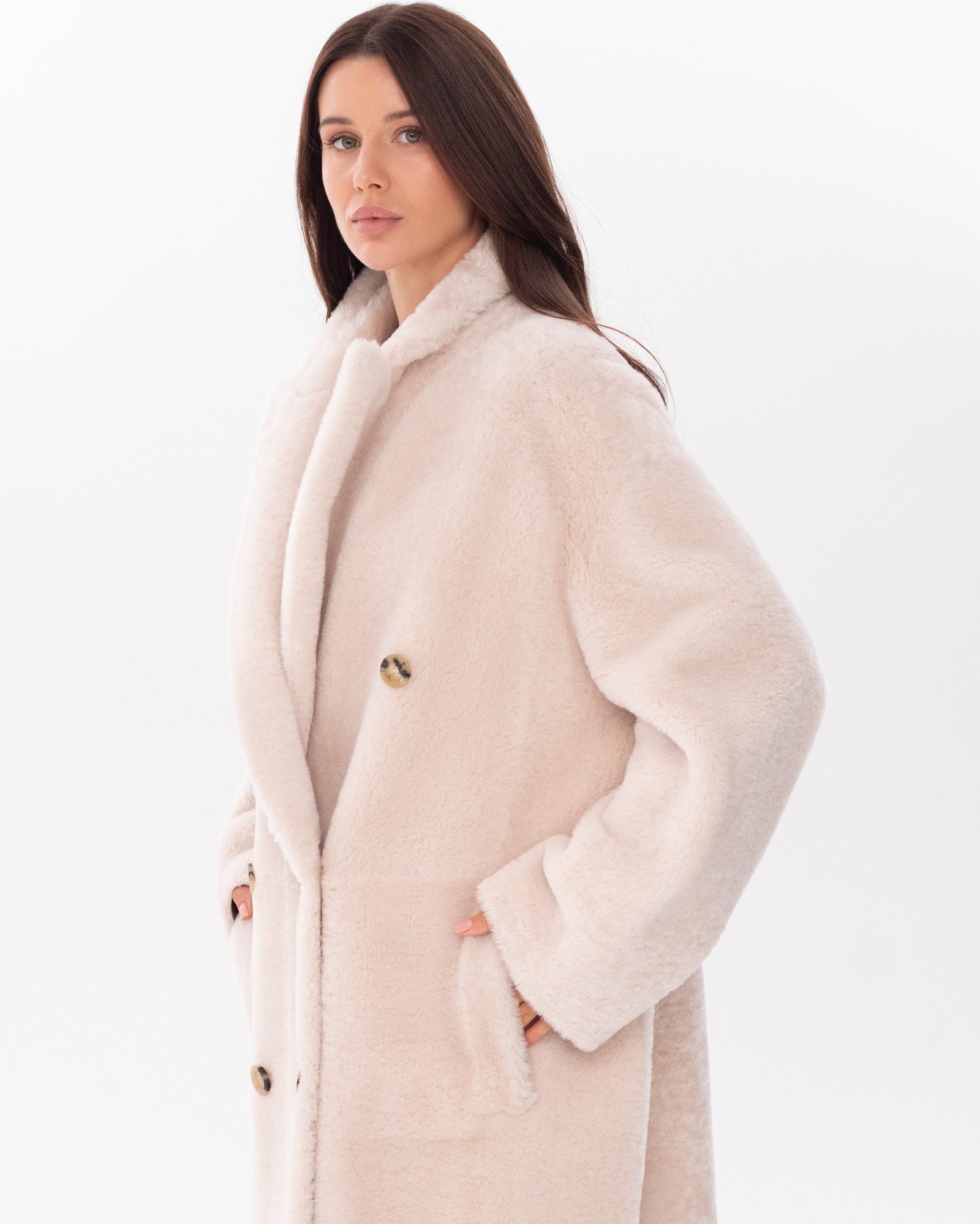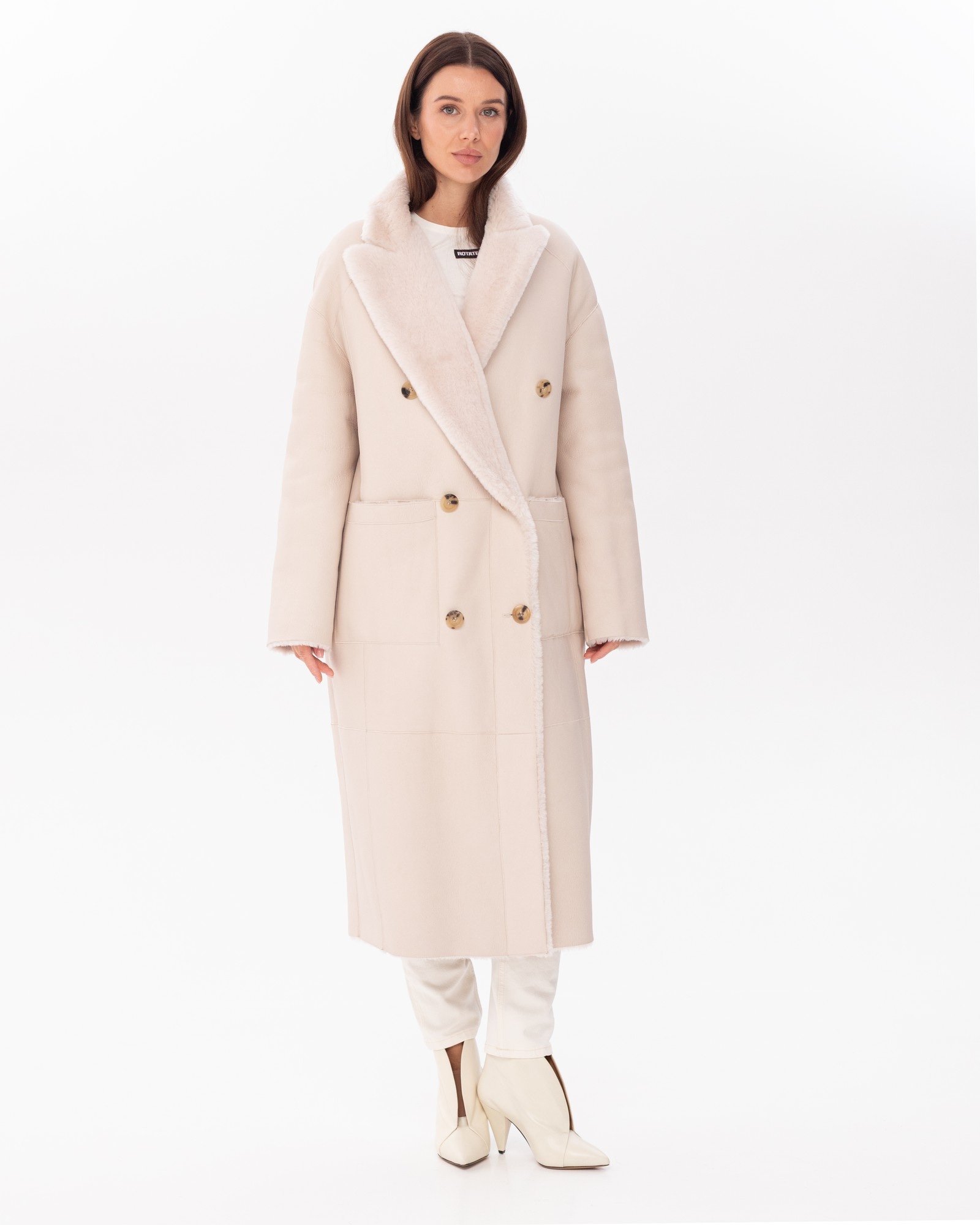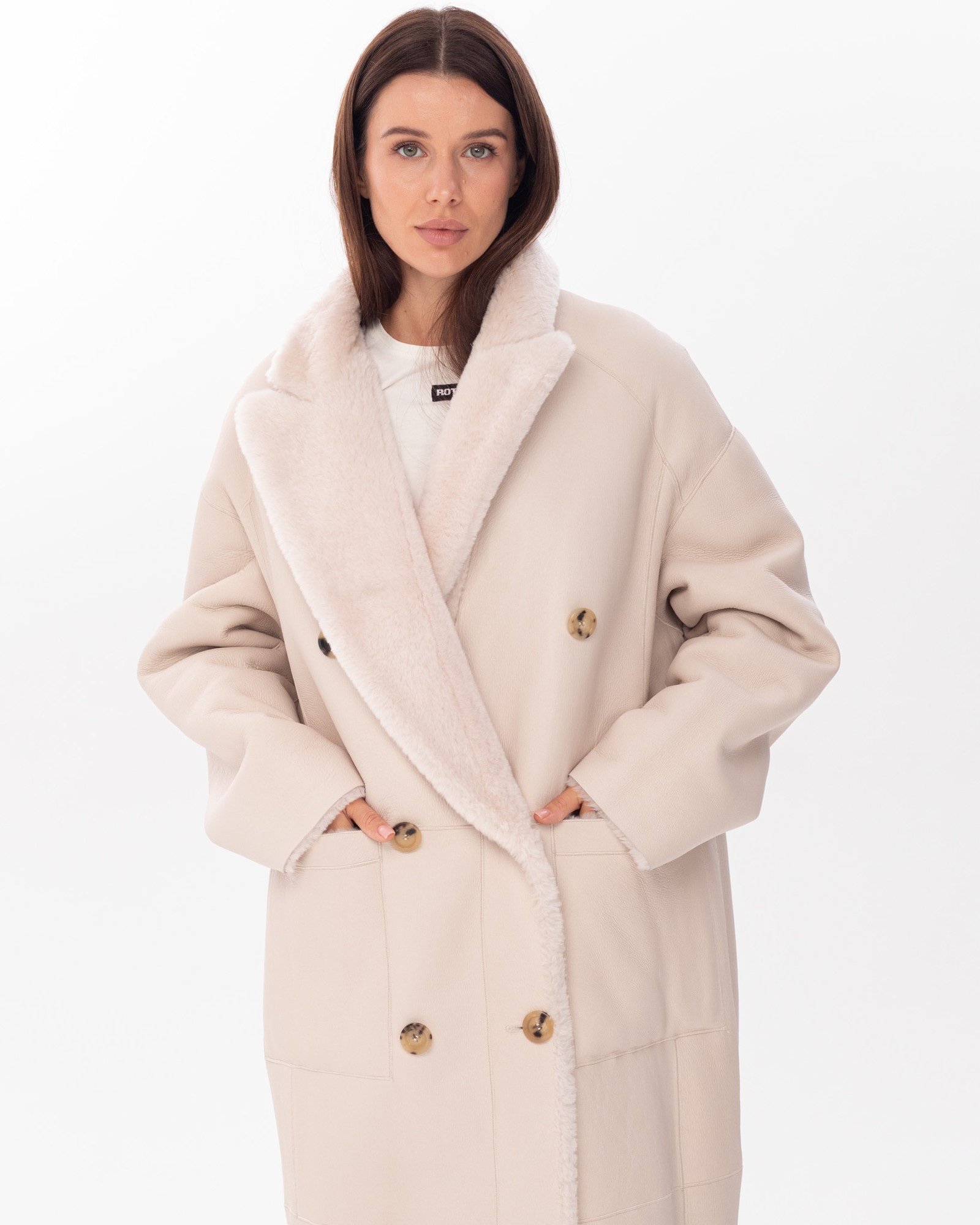 Опис: Двостороннє пальто молочно-білого кольору. Модель з довгими рукавами та широким коміром застібається на гудзики. Поєднання натуральної овчини та хутра дозволяє носити пальто з двох боків. Дизайн доповнюють практичні кишені.