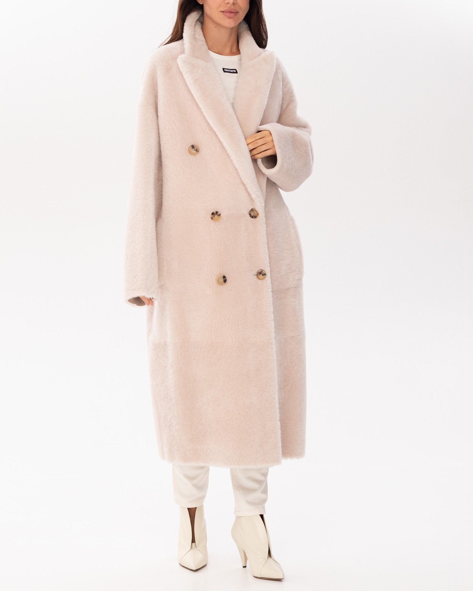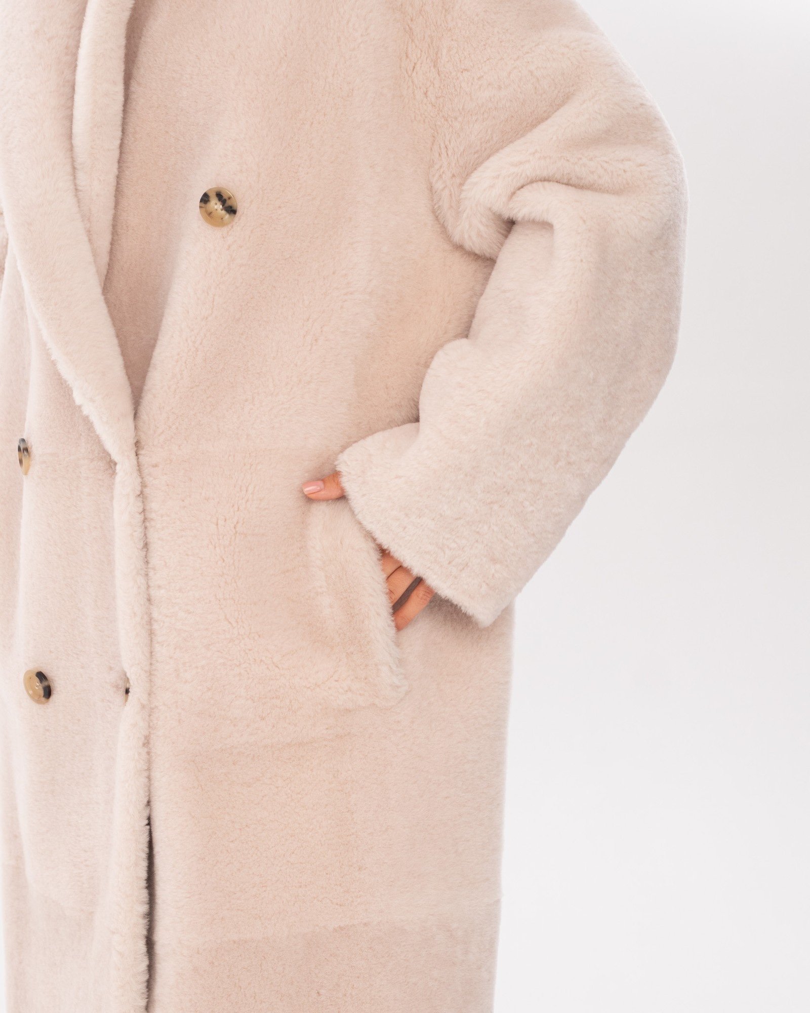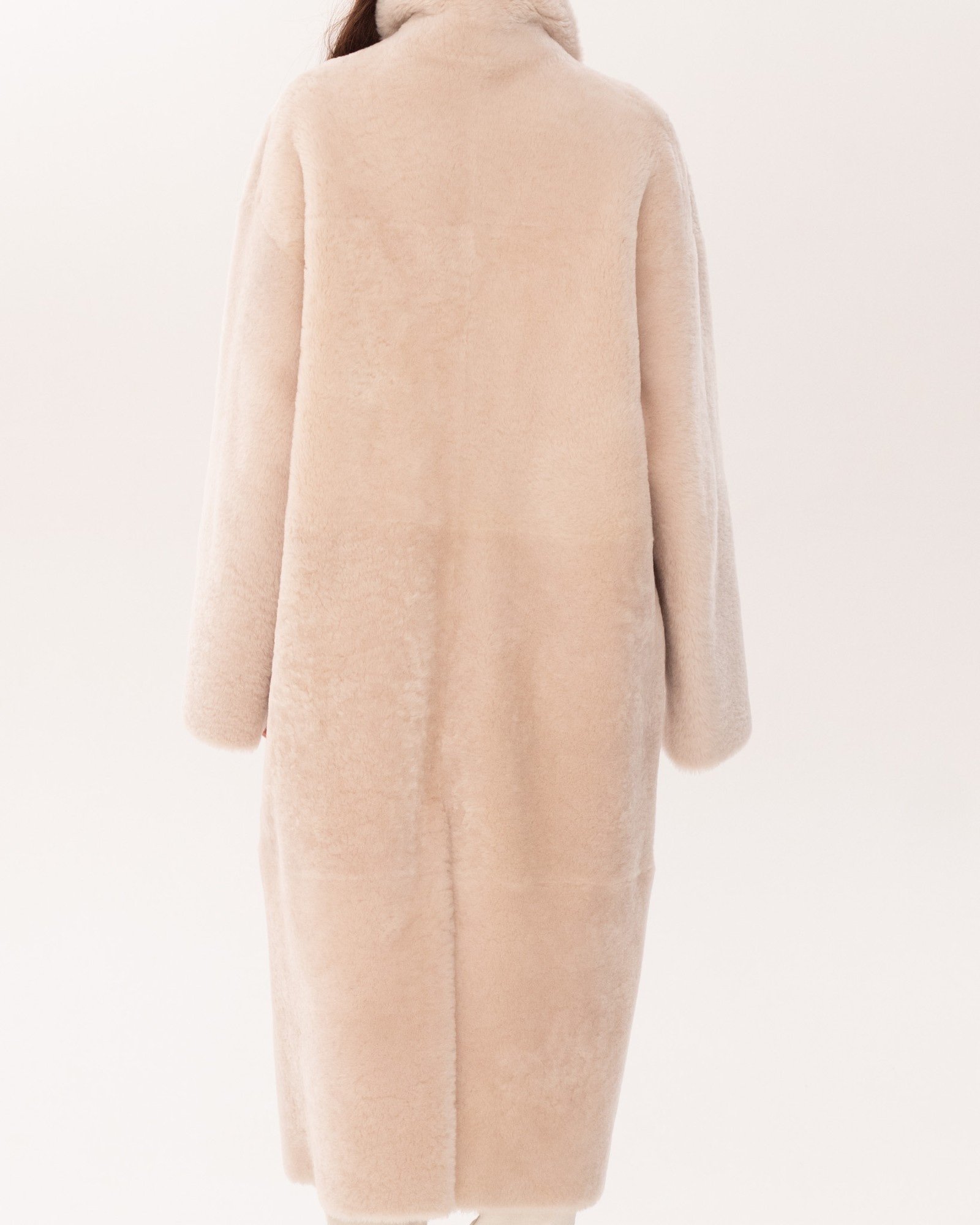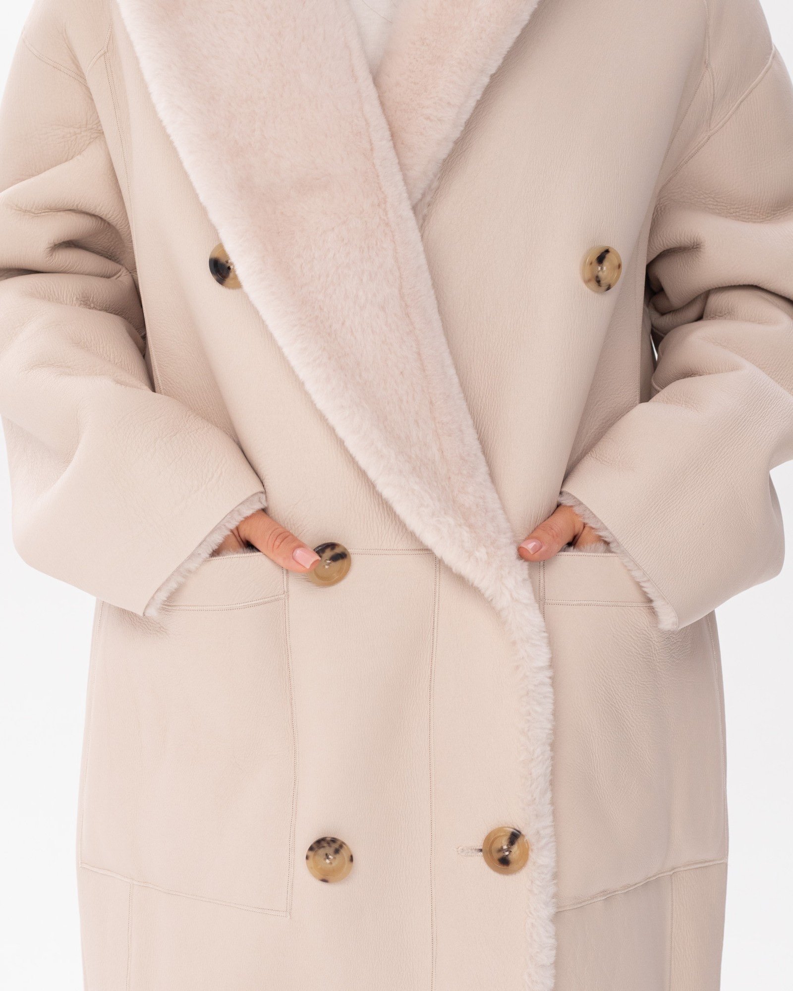 Опис: Двостороннє пальто молочно-білого кольору. Модель з довгими рукавами та широким коміром застібається на гудзики. Поєднання натуральної овчини та хутра дозволяє носити пальто з двох боків. Дизайн доповнюють практичні кишені.