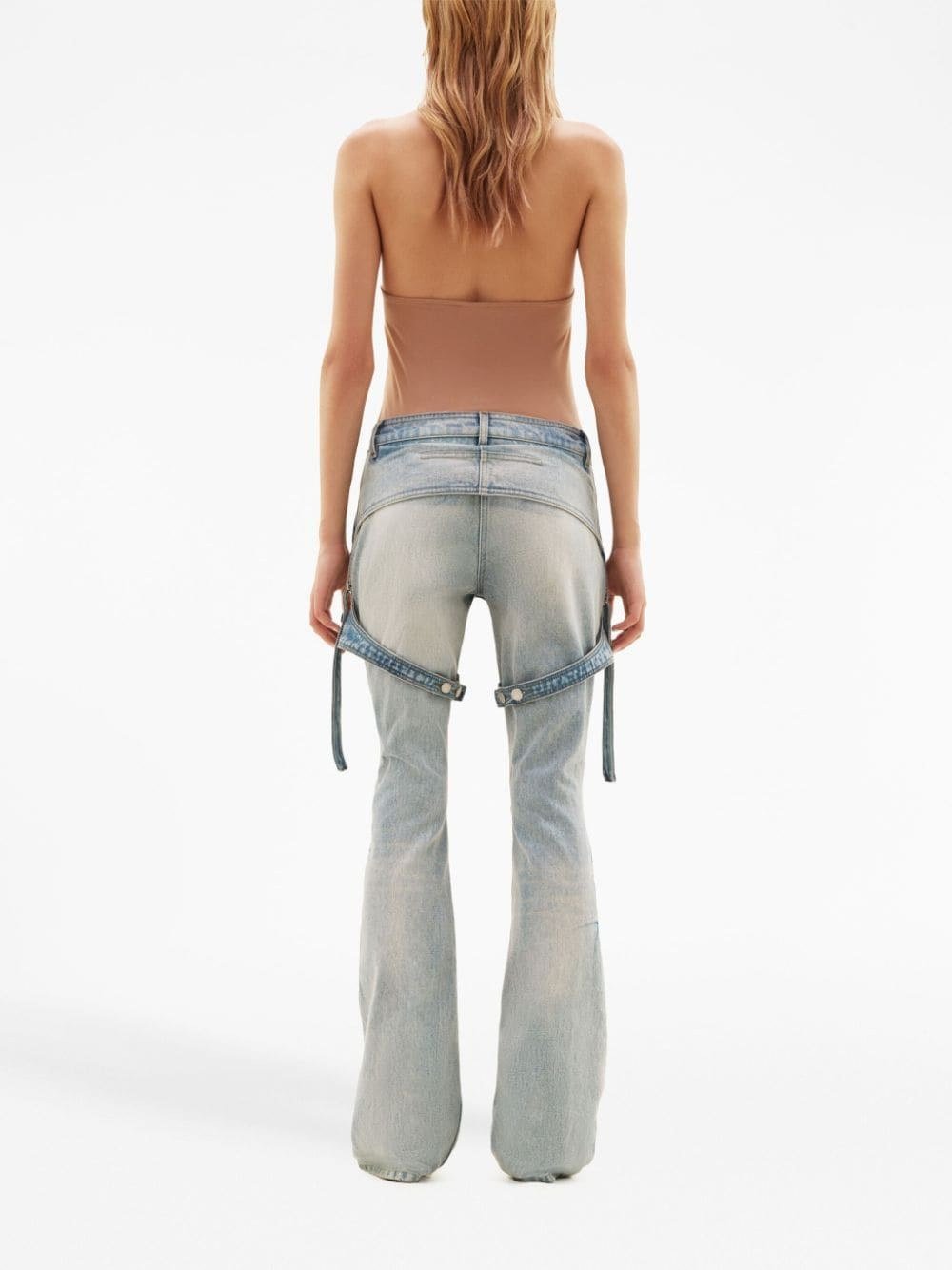 Опис: Штани з деніму. Індиго, бавовна, денім, перехресні ремінці, застібка на блискавці та гудзику спереду, петлі для ременя, прорізна кишеня спереду, довга модель та розкльошений поділ.