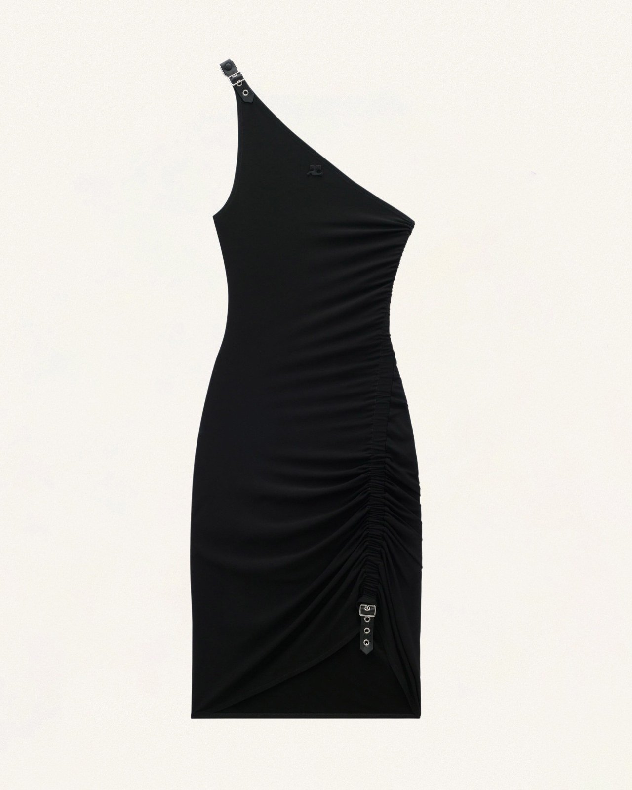 Ця асиметрична зібрана міні-сукня має пряжку на плечі.