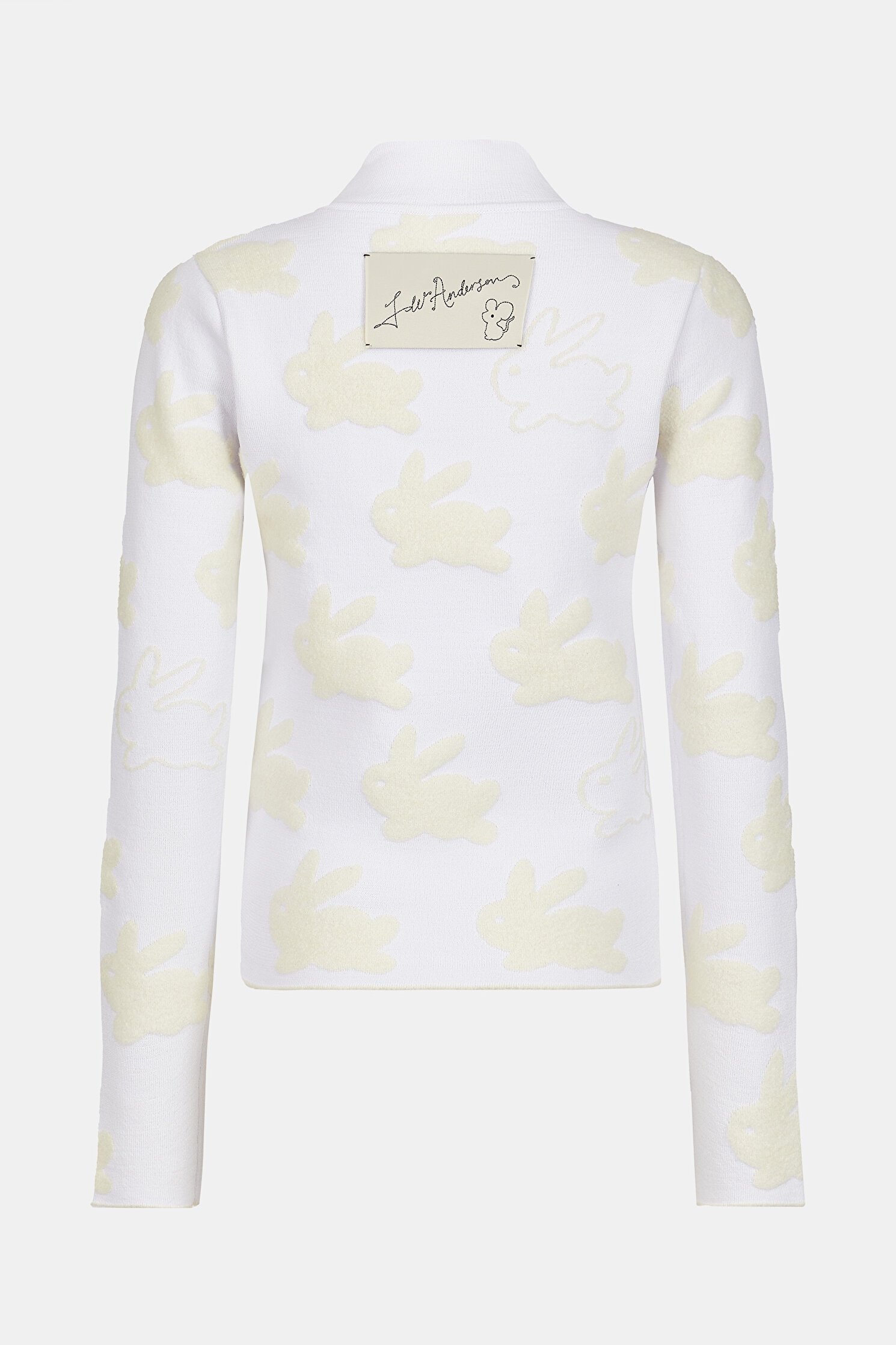 Опис: Приталений светр. Макетний комір. Оздоблений поділ. Повсюдна інтарсія з кроликом. Аплікація логотипу на спині. Виготовлення з двостороннього жаккарда.