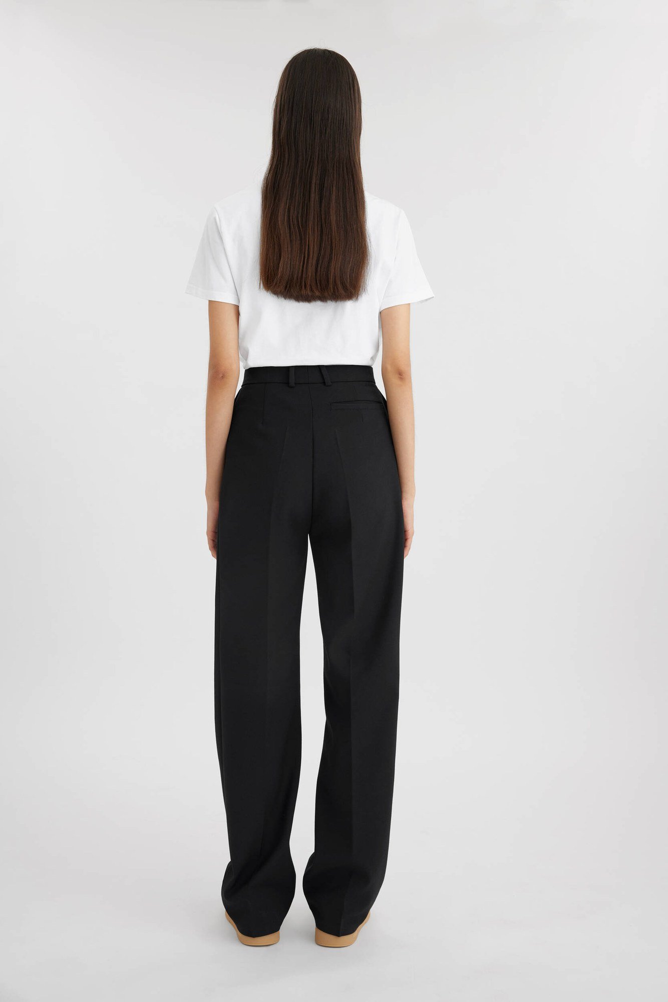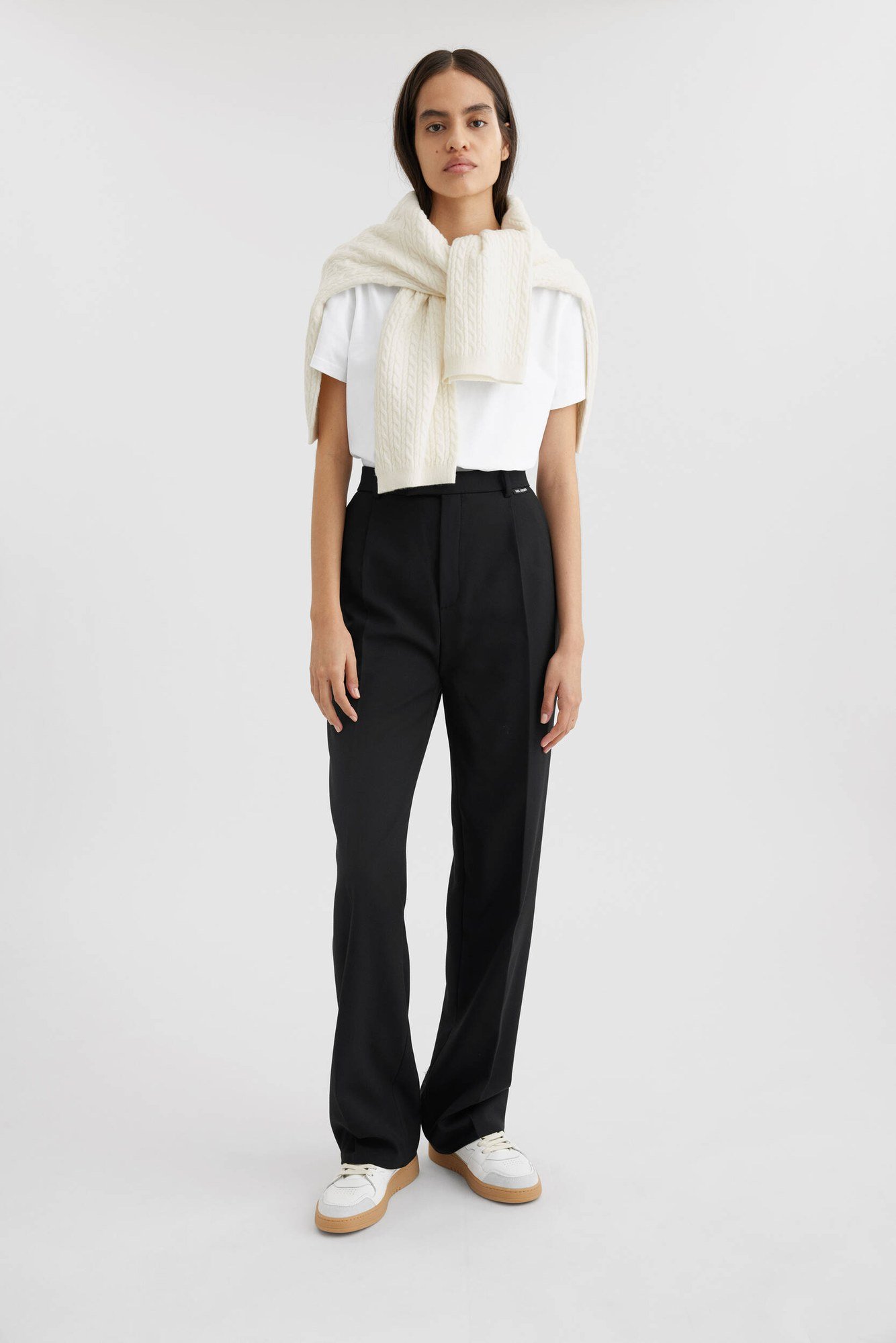 Опис: Штани Eleri, запозичені з класичного крою, мають високу посадку на талії та мають акуратно запрасовані складки спереду та ззаду. Вони мають тонкий прямий силует і мають наклейку з нашим прапором біля однієї з шлевок.