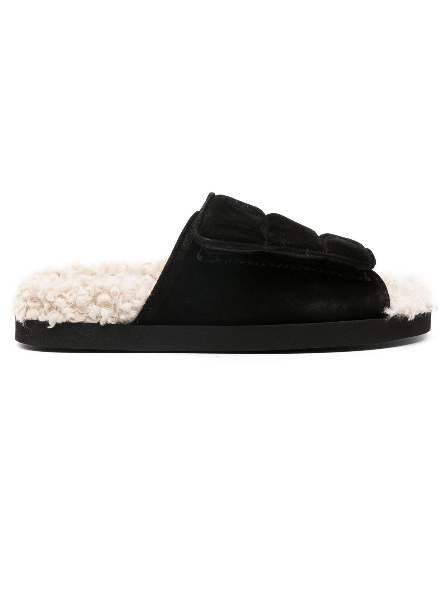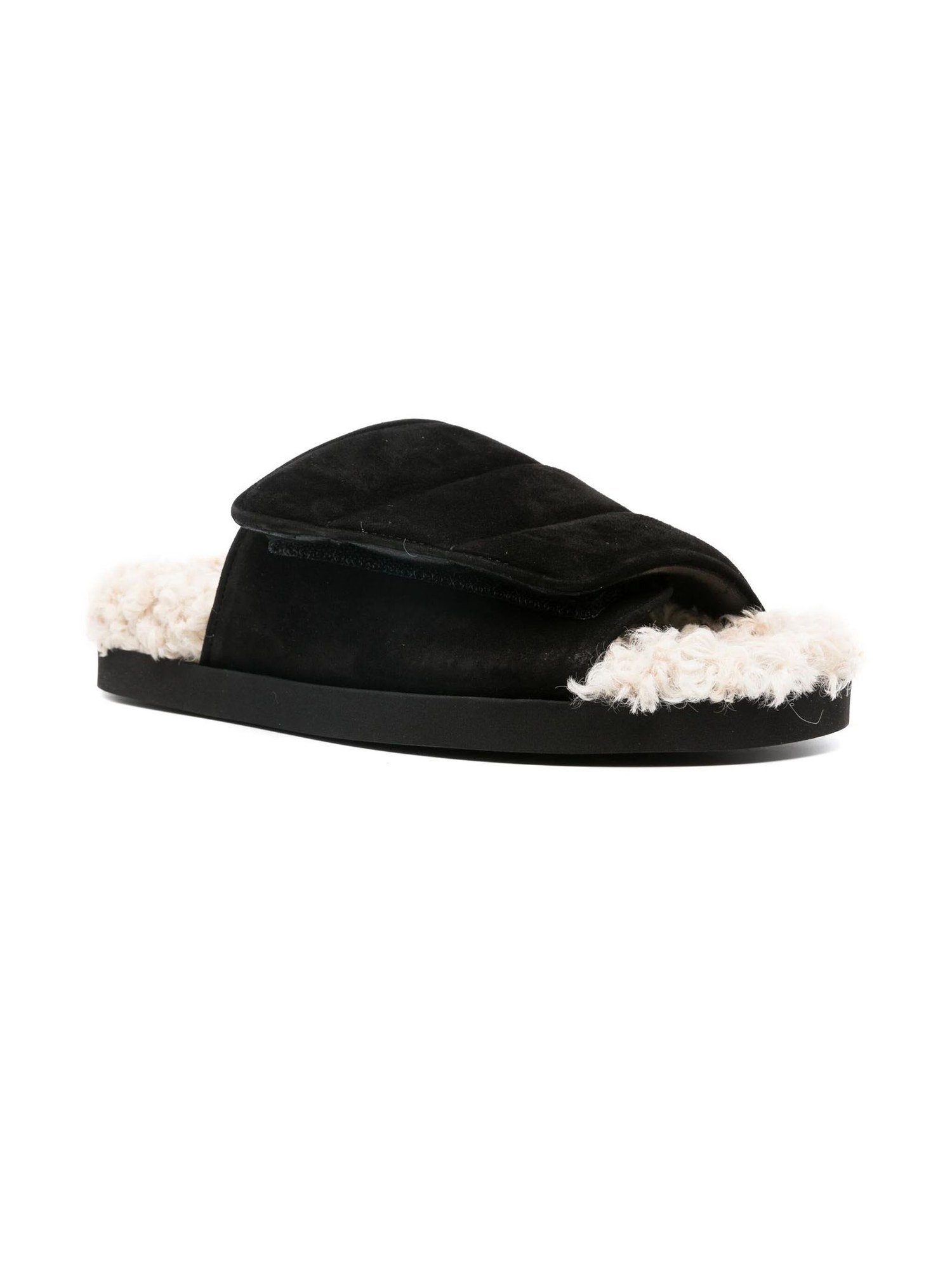 Опис: Чорні шльопки з телячої шкіри, імітація вовняного хутра, круглий носок, застібка на липучці спереду, стиль "сліпон", гумова підошва.