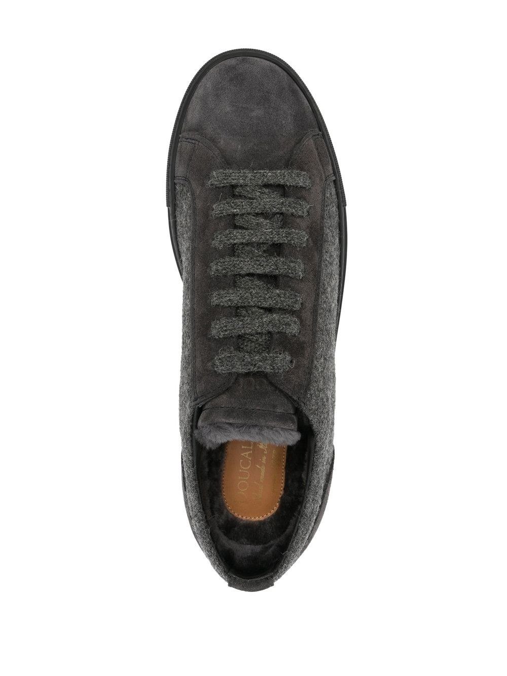 Антрацитово-сірий, замша з телячої шкіри, оздоблення з овчини, контрастні вставки, закруглений носок, шнурівка спереду та плоска гумова підошва.