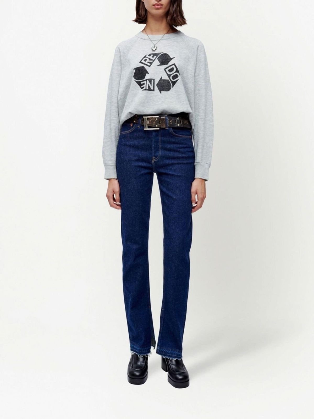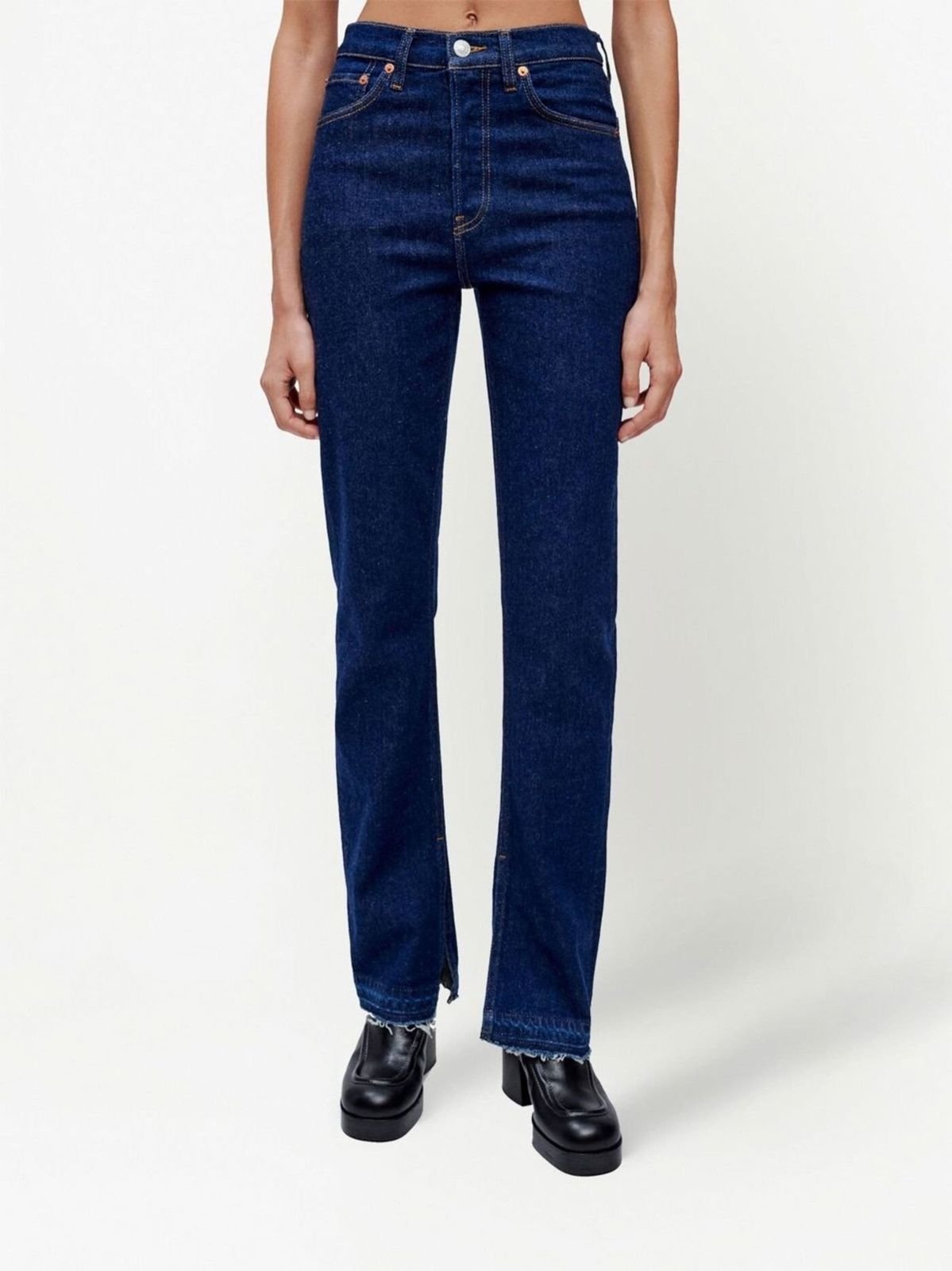 Опис: Сині джинси з невеликими бічними розрізами знизу наче намагалися подовжити вручну. Таке враження створюють заломи, що ніби залишилися від розпоротих швів. Ефект посилюють необроблені краї. Майстри марки виконали модель з м'якої, злегка еластичної бавовни.