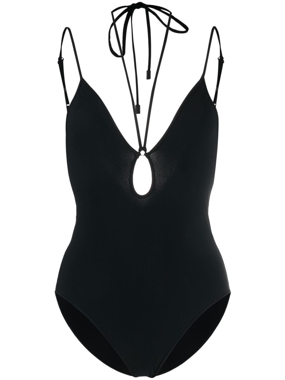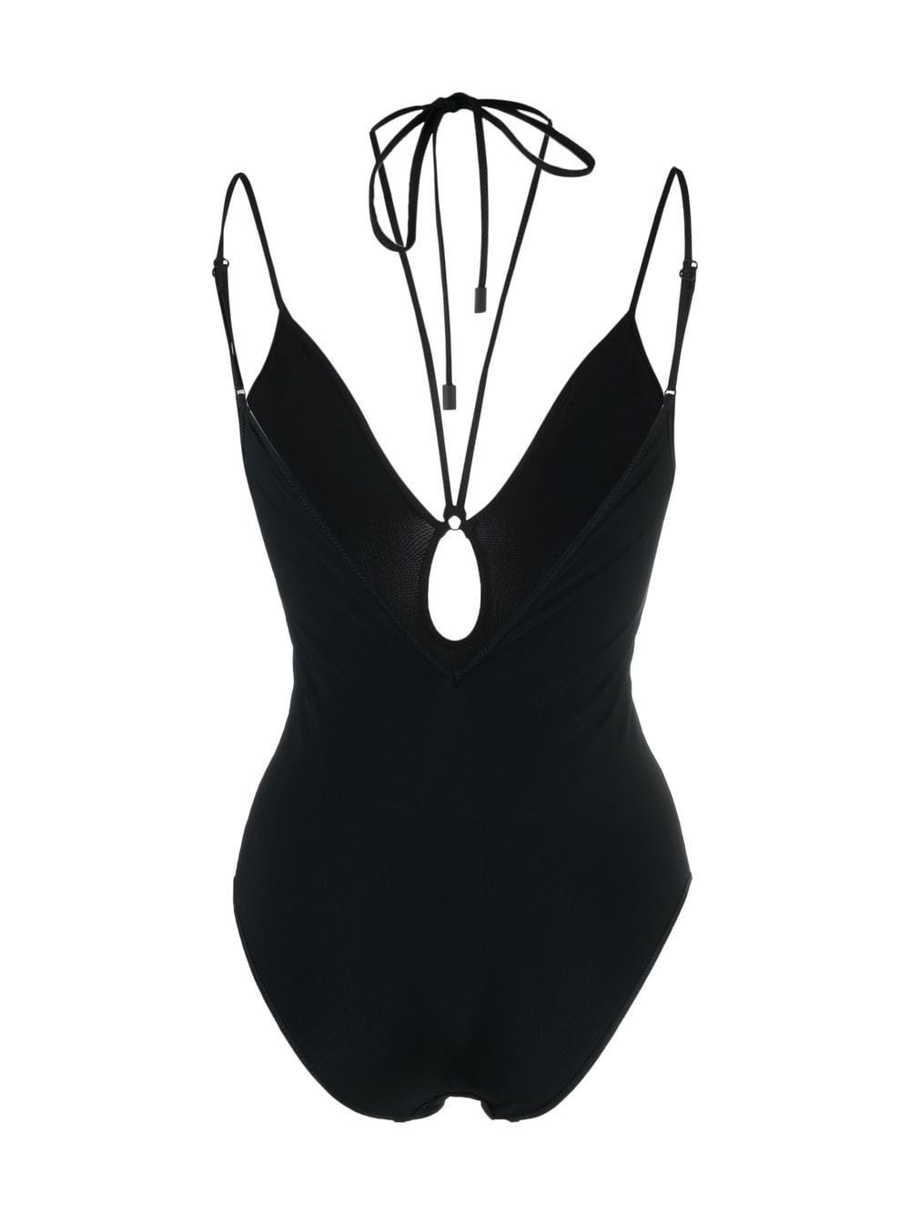 Чорний, еластичний матеріал та зав'язки навколо шиї.