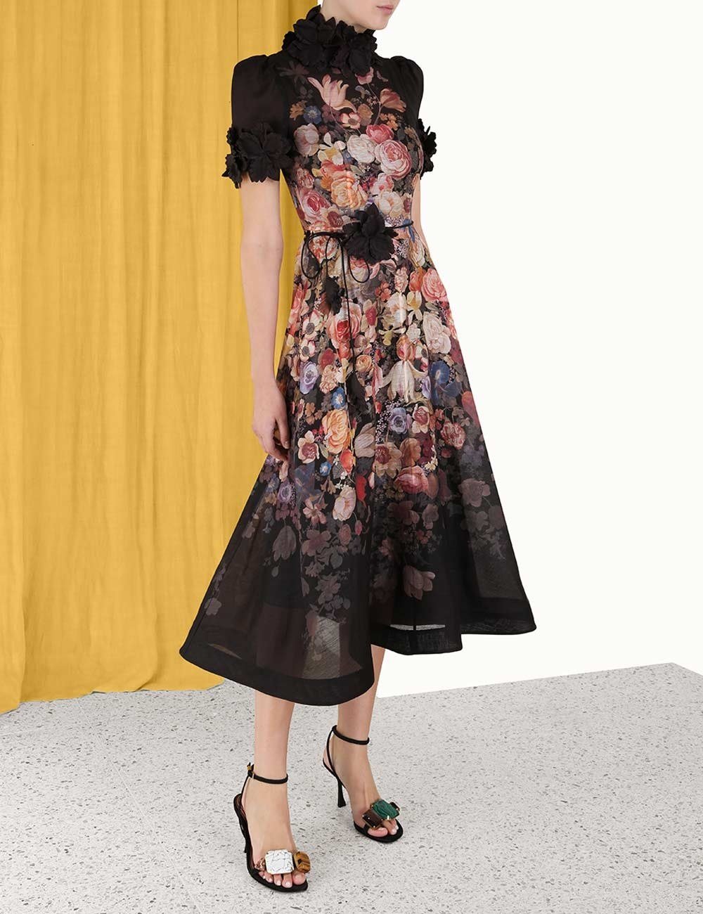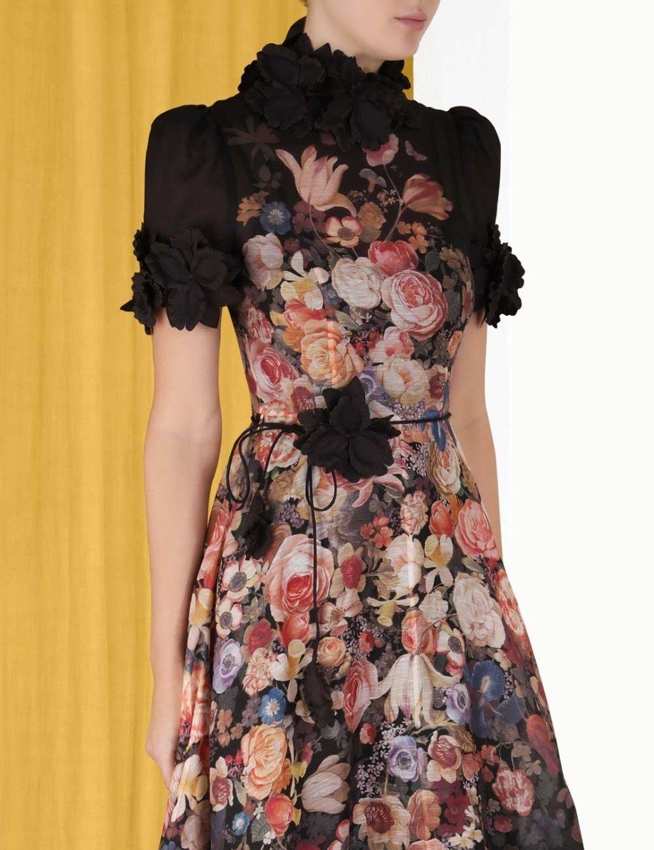 Опис: Міді Luminosity Liftoff Flower у чорному принті Morisot із нашої колекції Luminosity осінь 2023. Шовкова лляна сукня міді з 3D-формованими квітами, органзою, вставленою на комірі для підтримки, і криноліновою вставкою подолу. Сукня міді з шовкового льону. Центральна застібка-блискавка. Заголовки рукавів з фатину. Шлевки і знімний пояс. Поставляється з окремою накладкою.