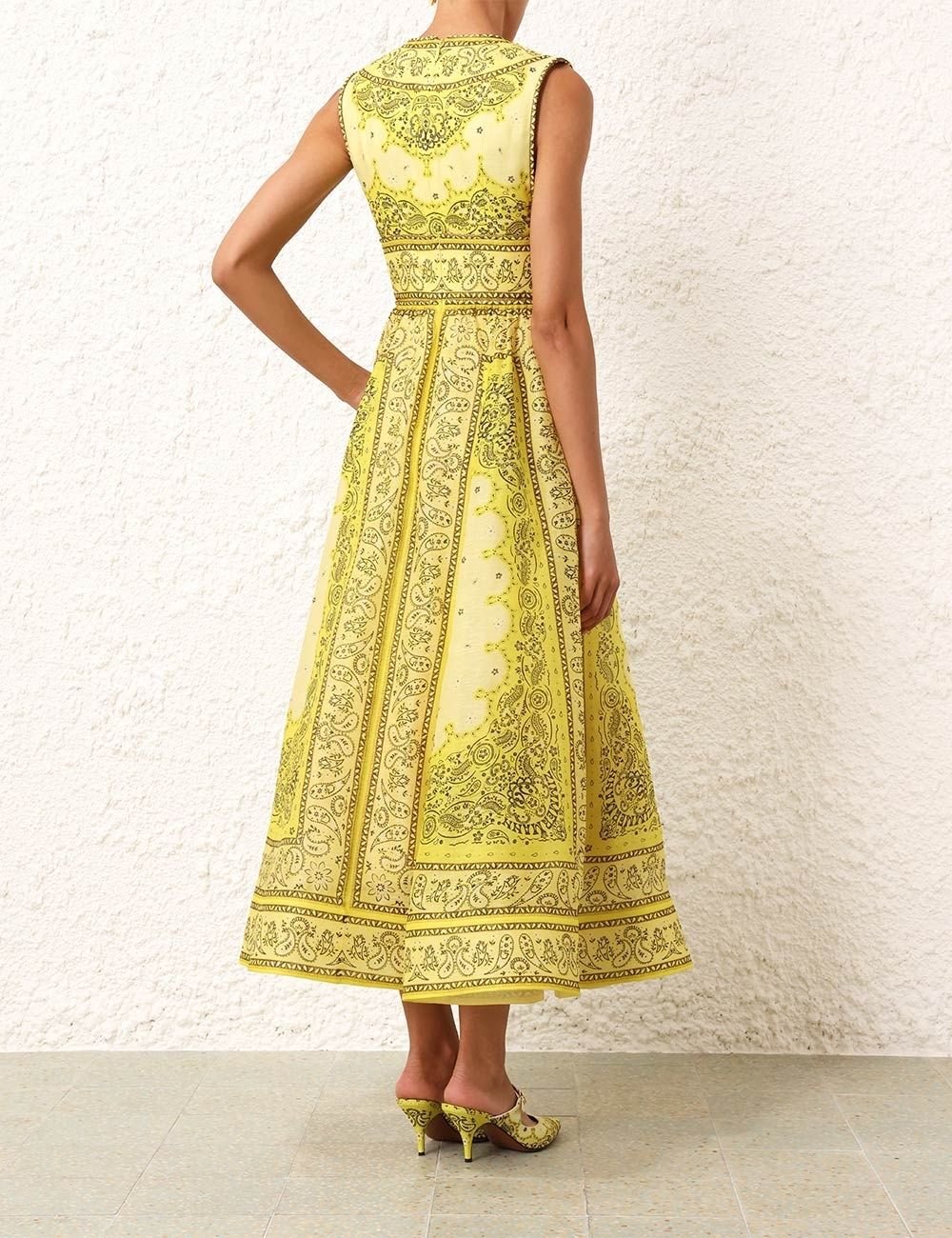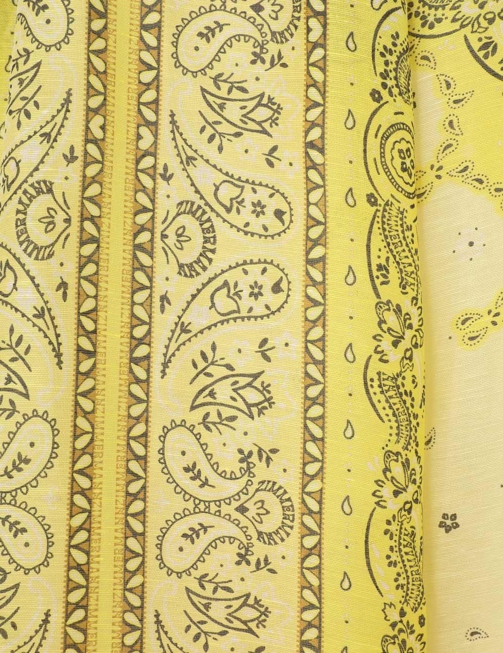 Довга сукня Matchmaker з бантом у жовтій бандані з курортної колекції 2024, Matchmaker. Шовкова лляна сукня з органзи з глибоким декольте та пишною спідницею максі, оздоблена бантом і принтом розміщення по всій частині.